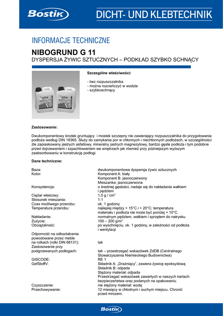 INFORMACJE TECHNICZNE NIBOGRUND G 11 DYSPERSJA ŻYWIC SZTUCZNYCH – PODKŁAD SZYBKO SCHNĄCY Szczególne właściwości: - bez rozpuszczalnika - można rozcieńczyć w wodzie - szybkoschnący Zastosowanie: Dwukomponentowy środek gruntujący i mostek szczepny nie zawierający rozpuszczalnika do przygotowania podłoża według DIN 18365. Służy do zamykania por w chłonnych i niechłonnych podłożach, w szczególności źle zapiaskowany jastrych asfaltowy, mineralny jastrych magnezytowy, bardzo gęste podłoża i tym podobne przed dojrzewaniem i szpachlowaniem we wnętrzach jak również przy późniejszym wyższym zaabsorbowaniu w konstrukcję podłogi. Dane techniczne: Baza: Kolor: Konsystencja: Ciężar właściwy: Stosunek mieszania: Czas możliwego przerobu: Temperatura przerobu: Nakładanie: Zużycie: Obciążalność: Odporność na odkształcenia powodowane przez meble na rolkach (rolki DIN 68131): Zastosowanie przy podgrzewanych podłogach: GISCODE: GefStoffV: Czyszczenie: Przechowywanie: dwukomponentowa dyspersja żywic sztucznych Komponent A: biały Komponent B: jasnoczerwony Mieszanka: jasnoczerwona o średniej gęstości, nadaje się do nakładania wałkiem i pędzlem 1,0 g / cm3 1:1 ok. 1 godziny najlepiej między + 15°C i + 20°C; temperatura materiału i podłoża nie może być poniżej + 10°C. normalnym pędzlem, wałkiem i sprzętem do natrysku 100 – 200 g/m2 po wyschnięciu, ok. 1 godziny, w zależności od podłoża i wentylacji tak tak – przestrzegać wskazówek ZdDB (Centralnego Stowarzyszenia Niemieckiego Budownictwa) RE 1 Składnik A: „Drażniący”, zawiera żywicę epoksydową Składnik B: odpada Stężony materiał: odpada Przestrzegać wskazówek zawartych w naszych kartach bezpieczeństwa oraz podanych na opakowaniu. nie stężony materiał: wodą 12 miesięcy w chłodnym i suchym miejscu. Chronić przed mrozem. Przygotowanie podłoża: Układanie wykładzin podłogowych wymaga, wg normy DIN 18365, podłoża czystego, osuszonego, bez rys, odpornego na ściskanie i rozciąganie i po szpachlowaniu równego. Przy innych zastosowaniach obowiązują odpowiednie wymogi. Jastrychy anhydrytowe i jastrychy anhydrytowe płynne przygotować mechanicznie (jastrychy anhydrytowe szczotkować, jastrychy anhydrytowe płynne wyszlifować) i dokładnie odkurzyć. Przestrzegać informacji producentów jastrychów. Masy gruntujące, adhezyjne i podkładowe nie są w stanie przygotować podłoża nie spełniającego wymogów wykładania. Służą one do tego, aby osiągnąć w połączeniu z przystosowanymi materiałami, optymalne warunki i wyniki przerobu. Sposób użycia: Składnik A i B wymieszać w czystym pojemniku, aż do uzyskania jednolitego jasnoczerwonego koloru. Dla poprawienia zdolności nakładania pędzlem i poprawienia chłonności podłoża można dodać do produktu NIBOGRUND G 11 do 5% wody. Dyspersję równomiernie nanieść – unikać tworzenia się kałuż – i przezroczysty film pozostawić do wyschnięcia. Czas schnięcia wynosi ok. 1 godziny, w zależności od podłoża, wentylacji i temperatury. Niskie temperatury przedłużają czas schnięcia gruntu. Dopiero po całkowitym przeschnięciu przedsięwziąć następne prace. Warstwy masy szpachlowej powinny zostać wylane w ciągu 2 dni. Opakowanie: Składnik A Składnik B 3 kg kanister 3 kg kanister 60 sztuki na palecie 60 sztuki na palecie Składnik A Składnik B 10 kg kanister 10 kg kanister 32 sztuki na palecie 32 sztuki na palecie Powyższych wskazówek udzielamy Państwu na podstawie przeprowadzonych prób i doświadczeń. Nie gwarantujemy jednak za efekt końcowy w jednostkowym przypadku z powodu możliwości różnorodnego zastosowania naszych produktów, jak i niezależnych od nas warunków magazynowania i użycia. Obowiązuje to również w wypadku roszczeń względem naszych doradców technicznych i handlowych. Zaleca się przeprowadzanie własnych prób. W momencie ukazania się niniejszego prospektu wszystkie wydania zostają unieważnione. Wydano: 07.2007 Bostik Polska z o.o. ul. Średzka 8 • 63-005 Kleszczewo k./Poznania Bostik Sp. Sp. z o.o. • ul.•Średzka 8 • 63-005 Kleszczewo k./Poznania Tel. / Fax 061 / 663 88 87 • Tel. 061 / 663 88 86 • Tel. 502 / 16 16 26