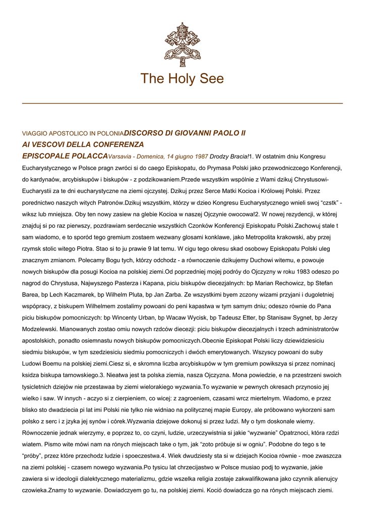 The Holy See VIAGGIO APOSTOLICO IN POLONIADISCORSO DI GIOVANNI PAOLO II AI VESCOVI DELLA CONFERENZA EPISCOPALE POLACCAVarsavia - Domenica, 14 giugno 1987 Drodzy Bracia!1. W ostatnim dniu Kongresu Eucharystycznego w Polsce pragn zwróci si do caego Episkopatu, do Prymasa Polski jako przewodniczcego Konferencji, do kardynaów, arcybiskupów i biskupów - z podzikowaniem.Przede wszystkim wspólnie z Wami dzikuj ChrystusowiEucharystii za te dni eucharystyczne na ziemi ojczystej. Dzikuj przez Serce Matki Kocioa i Królowej Polski. Przez porednictwo naszych witych Patronów.Dzikuj wszystkim, którzy w dzieo Kongresu Eucharystycznego wnieli swoj “czstk” wiksz lub mniejsza. Oby ten nowy zasiew na glebie Kocioa w naszej Ojczynie owocowa!2. W nowej rezydencji, w której znajduj si po raz pierwszy, pozdrawiam serdecznie wszystkich Czonków Konferencji Episkopatu Polski.Zachowuj stale t sam wiadomo, e to sporód tego gremium zostaem wezwany glosami konklawe, jako Metropolita krakowski, aby przej rzymsk stolic witego Piotra. Stao si to ju prawie 9 lat temu. W cigu tego okresu skad osobowy Episkopatu Polski uleg znacznym zmianom. Polecamy Bogu tych, którzy odchodz - a równoczenie dzikujemy Duchowi witemu, e powouje nowych biskupów dla posugi Kocioa na polskiej ziemi.Od poprzedniej mojej podróy do Ojczyzny w roku 1983 odeszo po nagrod do Chrystusa, Najwyszego Pasterza i Kapana, piciu biskupów diecezjalnych: bp Marian Rechowicz, bp Stefan Barea, bp Lech Kaczmarek, bp Wilhelm Pluta, bp Jan Zarba. Ze wszystkimi byem zczony wizami przyjani i dugoletniej wspópracy, z biskupem Wilhelmem zostalimy powoani do peni kapastwa w tym samym dniu; odeszo równie do Pana piciu biskupów pomocniczych: bp Wincenty Urban, bp Wacaw Wycisk, bp Tadeusz Etter, bp Stanisaw Sygnet, bp Jerzy Modzelewski. Mianowanych zostao omiu nowych rzdców diecezji: piciu biskupów diecezjalnych i trzech administratorów apostolskich, ponadto osiemnastu nowych biskupów pomocniczych.Obecnie Episkopat Polski liczy dziewidziesiciu siedmiu biskupów, w tym szedziesiciu siedmiu pomocniczych i dwóch emerytowanych. Wszyscy powoani do suby Ludowi Boemu na polskiej ziemi.Ciesz si, e skromna liczba arcybiskupów w tym gremium powikszya si przez nominacj ksidza biskupa tarnowskiego.3. Nieatwa jest ta polska ziemia, nasza Ojczyzna. Mona powiedzie, e na przestrzeni swoich tysicletnich dziejów nie przestawaa by ziemi wielorakiego wyzwania.To wyzwanie w pewnych okresach przynosio jej wielko i saw. W innych - aczyo si z cierpieniem, co wicej: z zagroeniem, czasami wrcz miertelnym. Wiadomo, e przez blisko sto dwadziecia pi lat imi Polski nie tylko nie widniao na politycznej mapie Europy, ale próbowano wykorzeni sam polsko z serc i z jzyka jej synów i córek.Wyzwania dziejowe dokonuj si przez ludzi. My o tym doskonale wiemy. Równoczenie jednak wierzymy, e poprzez to, co czyni, ludzie, urzeczywistnia si jakie “wyzwanie” Opatrznoci, która rzdzi wiatem. Pismo wite mówi nam na rónych miejscach take o tym, jak “zoto próbuje si w ogniu”. Podobne do tego s te “próby”, przez które przechodz ludzie i spoeczestwa.4. Wiek dwudziesty sta si w dziejach Kocioa równie - moe zwaszcza na ziemi polskiej - czasem nowego wyzwania.Po tysicu lat chrzecijastwo w Polsce musiao podj to wyzwanie, jakie zawiera si w ideologii dialektycznego materializmu, gdzie wszelka religia zostaje zakwalifikowana jako czynnik alienujcy czowieka.Znamy to wyzwanie. Dowiadczyem go tu, na polskiej ziemi. Koció dowiadcza go na rónych miejscach ziemi. 2 Nie jest to wyzwanie jedyne, jest jednak bardzo gbokie. Religia, wedle antropologii materialistycznej wspóczesnej, ma by czynnikiem, który pozbawia czowieka peni jego czowieczestwa. Czowiek przez religi sam si jej pozbawia, zrzekajc si tego, co immanentnie i integralnie “ludzkie”, na rzecz Boga, który - w wietle zaoe i przesanek systemu materialistycznego - jest tylko “tworem” czowieka.Moe to by wyzwanie destruktywne. Ale - po latach dowiadcze - nie moemy nie stwierdzi, e moe to równie by wyzwanie mobilizujce do podejmowania wysików, do szukania nowych rozwiza, i w tym sensie poniekd twórcze. wiadczy o tym wymownie Sobór Watykaski II. Koció podj wyzwanie. Odczyta w nim jeden z opatrznociowych “znaków czas ”. A poprzez ten “znak” z now gbi i moc przekonania da wiadectwo prawdzie o Bogu, o Chrystusie i o czowieku. W poprzek wszelkim redukcjonizmom natury epistemologicznej czy te systemowej, wbrew caej materialistycznej dialektyce.Czytamy w Gaudium et Spes: “Tajemnica czowieka wyjania si naprawd dopiero w tajemnicy Sowa Wcielonego . . . Chrystus . . . objawia w peni czowieka samemu czowiekowi i okazuje mu najwysze jego powoanie” (Gaudium et Spes, 22).Tak wic: czowiek, “istota nieznana”, jak si wyrazi wspóczesny przyrodnik, Alexis Carrel - jest take tajemnic. A nade wszystko jest osob, jest podmiotem swych czynów. Podmiotem moralnoci. Podmiotem dziejów. Nie tylko: “odbiciem panujcych stosunków spoeczno-ekonomicznych”. Nie tylko epifenomenem materii, ekonomii. Take i w stosunku do niej jest podmiotem i twórc. Chyba, e zostanie pozbawiony swej podmiotowoci i twórczej iniciatywy w tej dziedzinie - jake wanej dla ycia ludzi, spoeczestw, narodów.5. W ostatnich latach wadze Polskiej Rzeczypospolitej Ludowej wystpiy z propozycj nawizania formalnych stosunków dyplomatycznych ze Stolic Apostolsk.Stolica Apostolska, jak wiadomo, utrzymuje takie stosunki z 116 pastwami na caym wiecie, nie liczc organizacji midzynarodowych. W wielu wypadkach s to pastwa nowo powstae, na przykad na kontynencie afrykaskim. Wiele jest pastw na przykad muzumaskich, gdzie chrzecijanie stanowi nik mniejszo obywateli.Znamienny jest fakt, e do stosunków ze Stolic Apostolsk wracaj niektóre pastwa, tak na przykad pastwa skandynawskie po czterech wiekach od zerwania wizi z Rzymem w czasie Reformacji.W kadym zainteresowanym kraju Stolica Apostolska przede wszystkim zasiga opinii miejscowego Episkopatu.Poniewa Episkopa