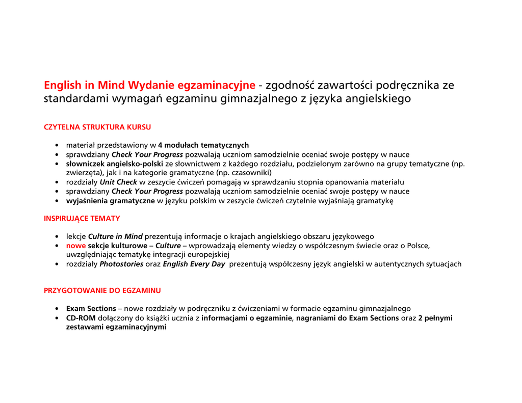 English in Mind Wydanie egzaminacyjne - zgodność zawartości podręcznika ze standardami wymagań egzaminu gimnazjalnego z języka angielskiego CZYTELNA STRUKTURA KURSU • • • • • • materiał przedstawiony w 4 modułach tematycznych sprawdziany Check Your Progress pozwalają uczniom samodzielnie oceniać swoje postępy w nauce słowniczek angielsko-polski ze słownictwem z każdego rozdziału, podzielonym zarówno na grupy tematyczne (np. zwierzęta), jak i na kategorie gramatyczne (np. czasowniki) rozdziały Unit Check w zeszycie ćwiczeń pomagają w sprawdzaniu stopnia opanowania materiału sprawdziany Check Your Progress pozwalają uczniom samodzielnie oceniać swoje postępy w nauce wyjaśnienia gramatyczne w języku polskim w zeszycie ćwiczeń czytelnie wyjaśniają gramatykę INSPIRUJĄCE TEMATY • • • lekcje Culture in Mind prezentują informacje o krajach angielskiego obszaru językowego nowe sekcje kulturowe – Culture – wprowadzają elementy wiedzy o współczesnym świecie oraz o Polsce, uwzględniając tematykę integracji europejskiej rozdziały Photostories oraz English Every Day prezentują współczesny język angielski w autentycznych sytuacjach PRZYGOTOWANIE DO EGZAMINU • • Exam Sections – nowe rozdziały w podręczniku z ćwiczeniami w formacie egzaminu gimnazjalnego CD-ROM dołączony do książki ucznia z informacjami o egzaminie, nagraniami do Exam Sections oraz 2 pełnymi zestawami egzaminacyjnymi Exam Sections – nowe rozdziały w podręczniku z ćwiczeniami przygotowującymi do egzaminu ROZUMIENIE TEKSTU CZYTANEGO • wprowadzenie elementów kulturowych • przetwarzanie treści przedstawionych w materiale wizualnym • dopasowywanie fragmentów tekstu do materiału wizualnego • określanie głównej myśli poszczególnych części tekstu • wyszukiwanie i selekcjonowanie informacji • dopasowywanie nagłówków do fragmentów tekstu ROZUMIENIE TEKSTU SŁUCHANEGO REAGOWANIE JĘZYKOWE • przetwarzanie treści przedstawionej w materiale wizualnym • wyszukiwanie, selekcjonowanie i dopasowywanie informacji • określanie kontekstu sytuacyjnego • rozpoznawanie i poprawne stosowanie struktur leksykalnych niezbędnych do skutecznej komunikacji • przetwarzanie treści przedstawionej w materiale wizualnym • uzupełnianie luk w tekście odpowiednimi wyrazami • rozpoznawanie związków między poszczególnymi częściami tekstu • wprowadzenie elementów wiedzy o współczesnym świecie • ćwiczenie umiejętności właściwego reagowania językowego w celu udzielania i przekazywania informacji PRZYKŁADOWY EGZAMIN GIMNAZJALNY PRZYKŁADOWE ZADANIA EGZAMINACYJNE Z CD-ROMu EGZAMINACYJNEGO • przetwarzanie treści przedstawionych w materiale wizualnym • selekcjonowanie informacji i uzupełnianie zdań • określanie kontekstu sytuacyjnego • dopasowywanie treści do materiału wizualnego • test wielokrotnego wyboru • uzupełnianie luk fragmentami zdań • test wielokrotnego wyboru • rozpoznawanie kontekstu sytuacyjnego • dobór właściwych struktur leksykalnogramatycznych, niezbędnych do skutecznej komunikacji, w celu udzielenia informacji • przetwarzanie treści • określanie głównej myśli tekstu • wyszukiwanie informacji określanie intencji nadawcy tekstu analiza tekstu pod kątem zawartości informacji wyszykiwanie i selekcjonowanie informacji przetwarzanie treści przeczytanego tekstu rozpoznawanie struktur leksykalnogramatycznych • test wielokrotnego wyboru • • • • • • określanie intencji nadawcy tekstu • rozpoznawanie i poprawne stosowanie struktur leksykalno-gramatycznych • wyszukiwanie informacji • rozpoznawanie i poprawne stosowanie struktur leksykalno-gramatycznych • właściwe reagowanie językowe w określonych kontekstach sytuacyjnych