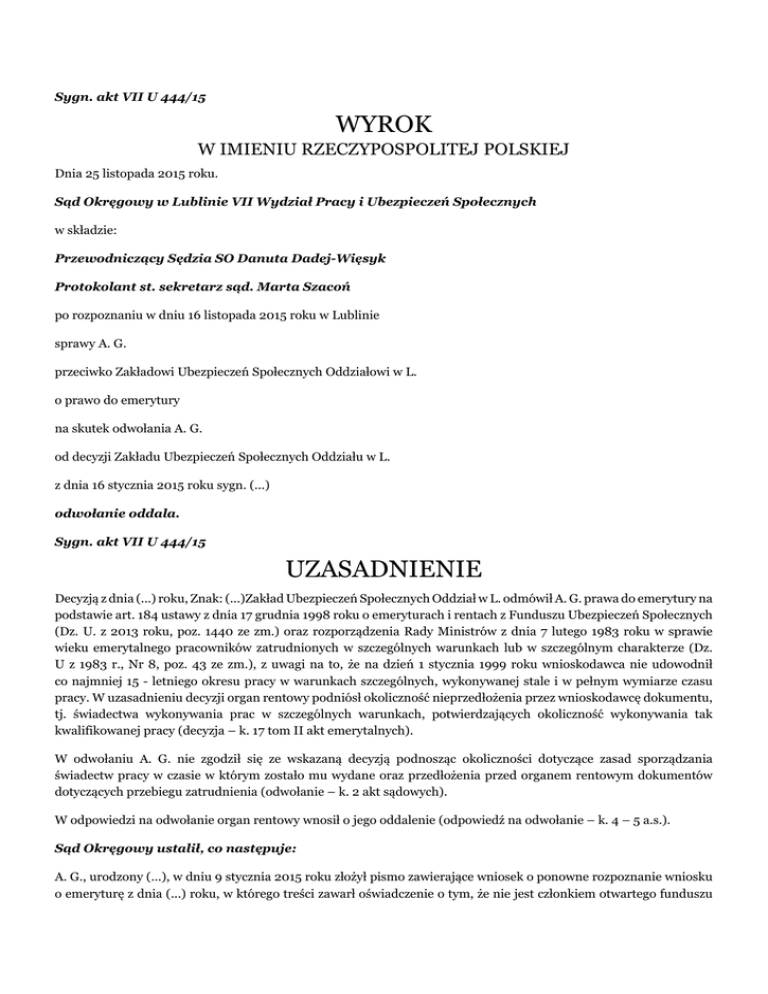 Sygn. akt VII U 444/15 WYROK W IMIENIU RZECZYPOSPOLITEJ POLSKIEJ Dnia 25 listopada 2015 roku. Sąd Okręgowy w Lublinie VII Wydział Pracy i Ubezpieczeń Społecznych w składzie: Przewodniczący Sędzia SO Danuta Dadej-Więsyk Protokolant st. sekretarz sąd. Marta Szacoń po rozpoznaniu w dniu 16 listopada 2015 roku w Lublinie sprawy A. G. przeciwko Zakładowi Ubezpieczeń Społecznych Oddziałowi w L. o prawo do emerytury na skutek odwołania A. G. od decyzji Zakładu Ubezpieczeń Społecznych Oddziału w L. z dnia 16 stycznia 2015 roku sygn. (...) odwołanie oddala. Sygn. akt VII U 444/15 UZASADNIENIE Decyzją z dnia (...) roku, Znak: (...)Zakład Ubezpieczeń Społecznych Oddział w L. odmówił A. G. prawa do emerytury na podstawie art. 184 ustawy z dnia 17 grudnia 1998 roku o emeryturach i rentach z Funduszu Ubezpieczeń Społecznych (Dz. U. z 2013 roku, poz. 1440 ze zm.) oraz rozporządzenia Rady Ministrów z dnia 7 lutego 1983 roku w sprawie wieku emerytalnego pracowników zatrudnionych w szczególnych warunkach lub w szczególnym charakterze (Dz. U z 1983 r., Nr 8, poz. 43 ze zm.), z uwagi na to, że na dzień 1 stycznia 1999 roku wnioskodawca nie udowodnił co najmniej 15 - letniego okresu pracy w warunkach szczególnych, wykonywanej stale i w pełnym wymiarze czasu pracy. W uzasadnieniu decyzji organ rentowy podniósł okoliczność nieprzedłożenia przez wnioskodawcę dokumentu, tj. świadectwa wykonywania prac w szczególnych warunkach, potwierdzających okoliczność wykonywania tak kwalifikowanej pracy (decyzja – k. 17 tom II akt emerytalnych). W odwołaniu A. G. nie zgodził się ze wskazaną decyzją podnosząc okoliczności dotyczące zasad sporządzania świadectw pracy w czasie w którym zostało mu wydane oraz przedłożenia przed organem rentowym dokumentów dotyczących przebiegu zatrudnienia (odwołanie – k. 2 akt sądowych). W odpowiedzi na odwołanie organ rentowy wnosił o jego oddalenie (odpowiedź na odwołanie – k. 4 – 5 a.s.). Sąd Okręgowy ustalił, co następuje: A. G., urodzony (...), w dniu 9 stycznia 2015 roku złożył pismo zawierające wniosek o ponowne rozpoznanie wniosku o emeryturę z dnia (...) roku, w którego treści zawarł oświadczenie o tym, że nie jest członkiem otwartego funduszu emerytalnego. Na podstawie przedłożonych dokumentów organ rentowy uznał za udowodniony na dzień 1 stycznia 1999 roku łączny okres podlegania ubezpieczeniom w wymiarze 28 lat i 28 dni, w tym 22 lat, 2 miesięcy i 14 dni okresów składkowych oraz 5 lat, 10 miesięcy i 14 dni okresów nieskładkowych. Organ rentowy nie uwzględnił w stażu pracy w szczególnych warunkach żadnego okresu zatrudnienia ubezpieczonego (okoliczności bezsporne). Z dniem 1 września 1973 roku A. G. został zatrudniony w (...) Przedsiębiorstwie Budownictwa (...) w L. na podstawie umowy o pracę w pełnym wymiarze czasu pracy w ramach wstępnego stażu pracy, trwającego do dnia 31 grudnia 1973 roku. W tym okresie pracował w biurowcu w Dziale (...) Następnie z dniem 1 stycznia 1974 roku ubezpieczonemu zostało powierzone stanowisko inżyniera budowy nr(...)w L., tj. Fabryki (...) w L.. Na zajmowanym stanowisku nadzorował pracę brygad roboczych, podczas którego rodzaj wykonywanych przez nie prac zależał od etapu robót. Sam nie wykonywał bezpośrednio prac związanych z poszczególnymi etapami budowy. Podczas robót ziemnych oraz izolacyjnych nadzorował pracę operatorów spycharek i koparek. W związku z wylewaniem fundamentów nadzorował prace brygady robót żelbetowych oraz brygady w której pracowali zbrojarze. Podczas procesu stawiania ścian i konstrukcji stalowych nadzorował z kolei pracę murarzy, spawaczy, a w czasie prac na dachu pracę dekarzy i cieśli. Nadzór na pracą wskazanych brygad sprawował na danym obiekcie, a podlegające brygady zmieniały się. Bezpośrednim przełożonym ubezpieczonego był kierownik obiektu, który z kolei podlegał kierownikowi budowy. Z dniem 2 stycznia 1975 roku skarżący został przeniesiony na stanowisko majstra budowy (...) Fabryki (...) w L.. W zależności od etapu procesu budowy nadzorował prace operatorów koparek, ładowarek, zagęszczarek i spycharek podczas prac ziemnych polegających na niwelowaniu terenu i jego utwardzaniu, pracowników wykonujących wykopy kanalizacyjne i odwadniające na głębokości od 1 do 1,5 metra, pracowników zajmujących się utwardzaniem placu manewrowego co wiązało się z wylewaniem betonu, pracowników zajmujących się wylewaniem nowych fundamentów pod maszyny, układaniem posadzek z kostki smołowej przez posadzkarzy oraz dekarzy przy wykonywaniu i poprawianiu konstrukcji dachu. Następnie z dniem 25 grudnia 1975 roku powierzono ubezpieczonemu stanowisko majstra budowy nr (...) Odlewni (...) w L., gdzie powstawały od podstaw hale. Na pierwszym etapie budowy w ramach prowadzonych prac ziemnych skarżący nadzorował pracę operatorów ciężkiego sprzętu budowlanego, tj. koparek i wywrotek, zatrudnianych przez podmiot zewnętrzny. Następnie w związku z wykonaniem stóp fundamentowych pod halę główną nadzorował prace związane ze zbrojeniem, szalowaniem i betonowaniem. Z dniem 1 lutego 1978 roku powierzone zostało ubezpieczonemu stanowisko kierownika obiektu nr(...) Odlewni (...) w L.. Na zajmowanym stanowisku realizował roboty budowlane na przydzielonym obiekcie a bezpośrednim przełożonym był kierownik budowy. Do obowiązków ubezpieczonego na zajmowanym stanowisku na etapie realizacji budowy należało terminowe składanie zapotrzebowania na środki produkcji i siły roboczej oraz bieżąca kontrola i uaktualnianie potrzeb w tym zakresie, codzienna systematyczna organizacja pracy brygad roboczych, zaopatrywanie w niezbędne narzędzia, urządzenia i odzież ochronną, dopilnowanie bezawaryjnej pracy sprzętu i maszyn budowalnych, dostarczanie materiałów budowalnych i prefabrykatów, zapewnienie niezbędnych warunków bhp oraz dopilnowanie ich prz