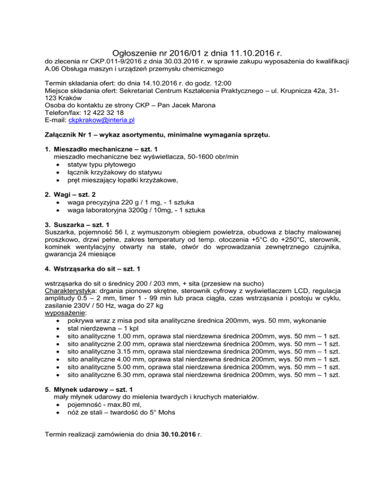 Ogłoszenie nr 2016/01 z dnia 11.10.2016 r. do zlecenia nr CKP.011-9/2016 z dnia 30.03.2016 r. w sprawie zakupu wyposażenia do kwalifikacji A.06 Obsługa maszyn i urządzeń przemysłu chemicznego Termin składania ofert: do dnia 14.10.2016 r. do godz. 12:00 Miejsce składania ofert: Sekretariat Centrum Kształcenia Praktycznego – ul. Krupnicza 42a, 31123 Kraków Osoba do kontaktu ze strony CKP – Pan Jacek Marona Telefon/fax: 12 422 32 18 E-mail: [email protected] Załącznik Nr 1 – wykaz asortymentu, minimalne wymagania sprzętu. 1. Mieszadło mechaniczne – szt. 1 mieszadło mechaniczne bez wyświetlacza, 50-1600 obr/min statyw typu płytowego łącznik krzyżakowy do statywu pręt mieszający łopatki krzyżakowe, 2. Wagi – szt. 2 waga precyzyjna 220 g / 1 mg, - 1 sztuka waga laboratoryjna 3200g / 10mg, - 1 sztuka 3. Suszarka – szt. 1 Suszarka, pojemność 56 l, z wymuszonym obiegiem powietrza, obudowa z blachy malowanej proszkowo, drzwi pełne, zakres temperatury od temp. otoczenia +5°C do +250°C, sterownik, kominek wentylacyjny otwarty na stałe, otwór do wprowadzania zewnętrznego czujnika, gwarancja 24 miesiące 4. Wstrząsarka do sit – szt. 1 wstrząsarka do sit o średnicy 200 / 203 mm, + sita (przesiew na sucho) Charakterystyka: drgania pionowo skrętne, sterownik cyfrowy z wyświetlaczem LCD, regulacja amplitudy 0.5 – 2 mm, timer 1 - 99 min lub praca ciągła, czas wstrząsania i postoju w cyklu, zasilanie 230V / 50 Hz, waga do 27 kg wyposażenie: pokrywa wraz z misa pod sita analityczne średnica 200mm, wys. 50 mm, wykonanie stal nierdzewna – 1 kpl sito analityczne 1.00 mm, oprawa stal nierdzewna średnica 200mm, wys. 50 mm – 1 szt. sito analityczne 2.00 mm, oprawa stal nierdzewna średnica 200mm, wys. 50 mm – 1 szt. sito analityczne 3.15 mm, oprawa stal nierdzewna średnica 200mm, wys. 50 mm – 1 szt. sito analityczne 4.00 mm, oprawa stal nierdzewna średnica 200mm, wys. 50 mm – 1 szt. sito analityczne 5.00 mm, oprawa stal nierdzewna średnica 200mm, wys. 50 mm – 1 szt. sito analityczne 6.30 mm, oprawa stal nierdzewna średnica 200mm, wys. 50 mm – 1 szt. 5. Młynek udarowy – szt. 1 mały młynek udarowy do mielenia twardych i kruchych materiałów. pojemność - max.80 ml, nóż ze stali – twardość do 5° Mohs Termin realizacji zamówienia do dnia 30.10.2016 r.