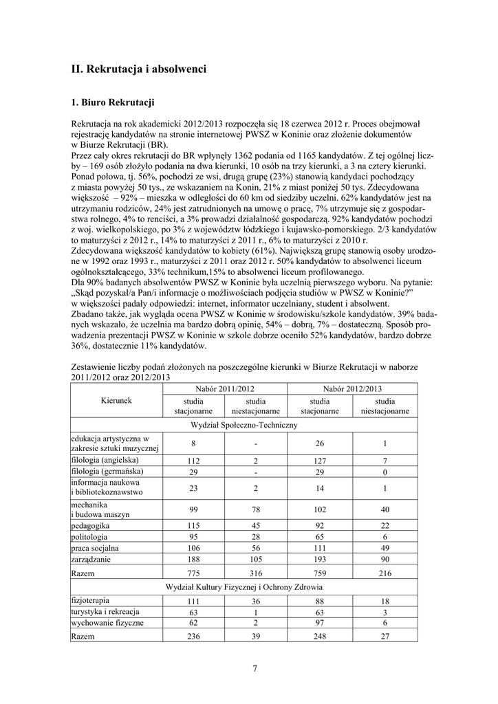 II. Rekrutacja i absolwenci 1. Biuro Rekrutacji Rekrutacja na rok akademicki 2012/2013 rozpoczęła się 18 czerwca 2012 r. Proces obejmował rejestrację kandydatów na stronie internetowej PWSZ w Koninie oraz złożenie dokumentów w Biurze Rekrutacji (BR). Przez cały okres rekrutacji do BR wpłynęły 1362 podania od 1165 kandydatów. Z tej ogólnej liczby – 169 osób złożyło podania na dwa kierunki, 10 osób na trzy kierunki, a 3 na cztery kierunki. Ponad połowa, tj. 56%, pochodzi ze wsi, drugą grupę (23%) stanowią kandydaci pochodzący z miasta powyżej 50 tys., ze wskazaniem na Konin, 21% z miast poniżej 50 tys. Zdecydowana większość – 92% – mieszka w odległości do 60 km od siedziby uczelni. 62% kandydatów jest na utrzymaniu rodziców, 24% jest zatrudnionych na umowę o pracę, 7% utrzymuje się z gospodarstwa rolnego, 4% to renciści, a 3% prowadzi działalność gospodarczą. 92% kandydatów pochodzi z woj. wielkopolskiego, po 3% z województw łódzkiego i kujawsko-pomorskiego. 2/3 kandydatów to maturzyści z 2012 r., 14% to maturzyści z 2011 r., 6% to maturzyści z 2010 r. Zdecydowana większość kandydatów to kobiety (61%). Największą grupę stanowią osoby urodzone w 1992 oraz 1993 r., maturzyści z 2011 oraz 2012 r. 50% kandydatów to absolwenci liceum ogólnokształcącego, 33% technikum,15% to absolwenci liceum profilowanego. Dla 90% badanych absolwentów PWSZ w Koninie była uczelnią pierwszego wyboru. Na pytanie: „Skąd pozyskał/a Pan/i informacje o możliwościach podjęcia studiów w PWSZ w Koninie?” w większości padały odpowiedzi: internet, informator uczelniany, student i absolwent. Zbadano także, jak wygląda ocena PWSZ w Koninie w środowisku/szkole kandydatów. 39% badanych wskazało, że uczelnia ma bardzo dobrą opinię, 54% – dobrą, 7% – dostateczną. Sposób prowadzenia prezentacji PWSZ w Koninie w szkole dobrze oceniło 52% kandydatów, bardzo dobrze 36%, dostatecznie 11% kandydatów. Zestawienie liczby podań złożonych na poszczególne kierunki w Biurze Rekrutacji w naborze 2011/2012 oraz 2012/2013 Kierunek Nabór 2011/2012 studia studia stacjonarne niestacjonarne Nabór 2012/2013 studia studia stacjonarne niestacjonarne Wydział Społeczno-Techniczny edukacja artystyczna w zakresie sztuki muzycznej filologia (angielska) filologia (germańska) informacja naukowa i bibliotekoznawstwo 8 - 26 1 112 29 2 - 127 29 7 0 23 2 14 1 mechanika i budowa maszyn pedagogika politologia praca socjalna zarządzanie 99 78 102 40 115 95 106 188 45 28 56 105 92 65 111 193 22 6 49 90 Razem 775 316 759 216 Wydział Kultury Fizycznej i Ochrony Zdrowia fizjoterapia turystyka i rekreacja wychowanie fizyczne 111 63 62 36 1 2 88 63 97 18 3 6 Razem 236 39 248 27 7 Zamiejscowy Wydział Budownictwa i Instalacji Komunalnych w Turku budownictwo inżynieria środowiska Razem Łącznie (wszystkie wydziały) 24 40 29 54 34 23 39 26 64 83 57 64 1075 438 1064 307 2. Biuro Karier Biuro Karier monitorując kariery zawodowe absolwentów PWSZ w Koninie, przeprowadziło badanie wśród absolwentów kończących studia w roku akademickim 2011/12 oraz wśród absolwentów rocznika 2010-2011, czyli po roku od ukończenia uczelni. Do 17 października 2012 r. PWSZ w Koninie zanotowaliśmy 774 absolwentów, kończących studia w roku akademickim 2011/2012. Spośród tej grupy ankietę wypełniły 463 osoby (59%). Monitorowanie losów absolwentów było przeprowadzone od czerwca do października 2012 r. Ankiety wypełniano w Biurze Karier oraz drogą elektroniczną. Na ich podstawie dokonano analizy odpowiedzi. I tak, 72% badanych uważa, że wiedza, umiejętności i kompetencje wyniesione z uczelni są przydatne, 20% uważa, że są bardzo przydatne, a tylko 5%, że są mało przydatne. Około 50% absolwentów ocenia, że przedmioty wykładane są w sposób zrozumiały, przekazywana wiedza jest aktualna, a wykładowcy są przygotowani do zajęć i obecni podczas dyżurów i konsultacji. Spośród wszystkich absolwentów 27% odpowiedziało, że PWSZ w Koninie powinna poszerzyć swoją ofertę edukacyjną o uzupełniające studia magisterskie oraz nowe kierunki. Wśród najczęściej wymienianych były: dietetyka, dziennikarstwo, bankowość, kosmetologia, farmacja, filologia polska. Jedynie 2% ankietowanych korzystało z programu Erasmus. Absolwenci wyjeżdżali najczęściej do: Mid Sweden University w Szwecji, Fachhochschule Emden/Leer w Niemczech, Bielefeld University w Niemczech, Instituto Politécnico de Bragança w Portugalii, Mersin University w Turcji, Universidade de la Coruna w Hiszpanii. Większość badanych bardzo dobrze oceniła PWSZ w Koninie, uznając ją za uczelnię, która zapewnia stypendia i warunki socjalno-bytowe, stwarza dobrą atmosferę studiowania oraz jest dobrze zlokalizowana. Natomiast jako uczelnia, która daje perspektywy zdobycia dobrej pracy, została oceniona w stopniu zadowalającym. 49% ankietowanych podjęło decyzję o studiowaniu w PWSZ w Koninie kierując się odległością uczelni od miejsca zamieszkania, 22% ciekawą ofertą edukacyjną, 19% dobrą opinią o uczelni. Spośród wszystkich absolwentów 70% zamierza kontynuować naukę na studiach II stopnia, najczęściej w Poznaniu (UAM, PP, AWF, UP, WSNHiD); w Warszawie (UW), w Gdańsku (AWF); w Toruniu (UMK); w Bydgoszczy (AWF, WSG); we Wrocławiu (WSOWL). Na pytanie: „Gdzie zamierza Pani/Pan szukać pracy”, najwięcej osób wskazało Konin (129 osób), powiat koniński (98 osób), województwo wielkopolskie (114 osób). Spośród wszystkich badanych 41 osób zamierza szukać pracy za granicą. Należy nadmienić, że absolwenci nie ograniczają się do jednego miejsca poszukiwania pracy. Najczęstszą formą poszukiwania pracy dla 287 osób będzie internet, dla 199 ogłoszenia prasowe, dla 180 – znajomi. Ponadto około 150 osób zamierza korzystać z ofert PUP oraz planuje wysyłać swoje aplikacje bezpośrednio do firm. Najrzadziej wybieraną formą poszukiwan