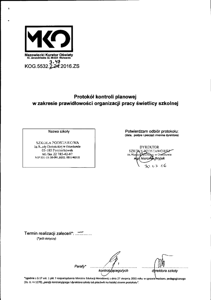 りぐつ 噌総寓窓1恕霊r4 線緊Y 3.叫 KOG.5532.32tt2016.ZS Protok6t kontroli planowej w zakresie prawidtowosci organizacji pracy 言 wietlicy szkolnej Potwierdzam odbi6r protokou: Nazwa szkoy (d融a, podp博 ipiecz旦と imienna dyrektora) SZKOI」A ?ODS い話 OWA 1皿媛一aむ(】hotomski町 w Orz馴!howie O5-j 80 Poniicch6wek tej /」山 22 785-424(7 NIP 531-15-30式り I.REG 加1146510 DYREKTOR 1ミ登 Y 勲晋黒紫ー ryjak 1幻 し多 ィ C Termin realizacji zaleceh*:ー二で (je引i dotyczy) Paraか* イ kon加吹cega加h 吐旧/dora szねツ .zgodnie z§ 17 ust. 1 pkt? rozporzadzenia Ministra Edukacji Narodowej z dnia 27 sierpnia 2015 roku w sprawie婦dzoru pedagogicznego (Dz. U. nr 1270) ル加川かkontro"りqcego Iの肥1"加ra szIc吻lub placdw灯naka 阿stron肥pro加k伽r I http:方www.seo2.npseo.pt/inspectiOn/rapOrt./94504.html Sy如m Ewaluacji O細laty - platforma ewaluacji PROTOK6L KONTROLI Arkusz kontroli w zakresie prawidtowogci organizacji pracy 言 wietlicy szkolnej zo叩anizowanej w publicznej szkole podstawowej Informacje o kontrolowanej szkole/placówce: SZKOŁA PODSTAWOWA W STARYM ORZECHOWIE 45, 05-180 POMIECHOWEK Nazwa szkoły/placówki Szkoła podstawowa Typ szkoty/placówki Stare Orzechowo Miejscowość Ulica 45 Numer 05-180 Kod pocztowy POMIECHÓWEK Urząd pocztowy 0227854287 Telefon Fax Www 00114651000000 Regon publiczna Publiczność Dzieci lub młodzież Kategoria uczniów brak specyfiki Charakter 34 Uczniowie, wychow., słuchacze 6 Oddziały Nauczyciele pełnozatrudnieni 5.00 Nauczyciele niepelnozat. (stos. pracy) 9.00 5.00 Nauczyciele niepetnozat. (w etatach) średnia liczba uczących sir w oddziale 6 Liczba uczniów przypadających na jednego pełnozatrudnionego nauczyciela 7 MAZOWIECKIE Województwo Powiat nowodworski Gmina Pomiechówek Typ gminy gmina wiejska Informacje o kontroli Numer kontroli: 94504 Da加 przeprowadzenia kontroli: 30 marcョ 2016 Numer wpisu do reje杜ru kontroli placwki 9/2016 Wizytatorzy: Imię I nazwisko Zofia Szmytkowska I z4 Data wydania upoważnienia do przeprowadzenia kontroli Numer upoważnienia do przeprowadzenia kontroli 15 lutego 2016 KOG.5532.2.24.2016.ZS プf 2016-03-29 10:32 System Ewalu画iO細1町- platforma ewaluacji http:カwww.seo2.npseo.p/inspecti011/raPOrtJ"94504・html Opis ustalonego stanu 伯ktycznego: In加rmaりe O kon廿oli: Podstawa prawna: 1. W szkole zorganizowano I wietli叫(U: art. 67 ust 1 pkt 3): . Tak Nie 2. Ucz加uczni6w podczas zaj嚇prowadzonych przez jedn叩o wychowawcq wf wietlicy nie pロekracza 25 (U: aけ. 67 ust・4): . Tak Nie 3. a) Szk耐a prowadzi dziennik zaj電ど w 事wi酬Icy (R:§11 U此. 1): ● Tak Nie b) Szkoa do如men加」a w dzienniku zaj叫w Iwi酬icy zaj喝da opieki I wi叫Icowej, o kt6rych mowa w art. 42 U社. 2 pkt 2 lit, a us加wy -肋け■ Nauczyciela (R:5 li u吐. 1): . Tak Nie c) W dzienniku zaj 亡 w 言wi吐licy dodatkowo odnotowuje siし士e przeprowadzenie 加」畦 stanowi realizacj電 z司畦1 a kt ワch mowa w art. 42 u吐. 2 pkt 2 lit, a ustawy-K.け日 Nauczyciela (R:5 11 ust. 1): . Tak Nie 4. Do dziennika zaj喝ぐ w 4 wi叱icy za馴国押 wpisane (R:5 ilu或. 2): a) plan pracyl wietlicy na rok szkolny ユ015/2016: . Tak Nie b) imiona i nazwiska uczni6w korzy吐a」却ヲch ze I wi叫icy: . Tak Nie c) oddzl叫do kt6rej uczqszcza」え uczniowie: . Tak Nie d) tematy pロ.proりりadzonych zaj叫: . Tak 2z4 Nie 'w wietlicy odnotowuje si、 obecno"uczniw na poszczeg6lnych帯二 4.2. W dzienniku zaj 2016-03-29 10:32 I http:力Www・ seo2.npseo.pl!iflSpeCtiofl/rapOft!94504上tml System Ewaluacji Ogwiaty - platforma ewaluacji wl wietlicy (R:§11 ust. 2): . Tak Nie 4.3. W dzienniku zaj嚇 wl wietlicy 納ツchowawcal wietlicy paセnierdza podpisem przeprowadzenie z司寧 (R:5 11 U此. 2): . Tak Nie 5. WanJn町 pracyl wi酬icy szkolnej: 5.1. zdiagnozowano potrzeby rodzic6w w zakresie opieki 』 wi吐licow司 dla dzieci: . Tak Nie 5.2. godziny pracyf wi司Icy szkolnej: do 2 godzin dziennie do 4 godzin dziennie do 6 godzin dziennie • do 8 godzin dziennie do 10 godzin dziennie powyżej 10 godzin dziennie 5.3. czas pracyl wietlicy jest do吐osowany do organizacji dojazdu uczni6w do szk側ty: ● Tak Nie 5・4. czas pracy 』 wietlicy uwzgl加nia Inne okoliczno女i wymagaj弓ぐe zapewnienia uczniowi opieki w szkole: . Tak Nie W przypadku udzielenia w podpunkde 4 odpowiedzI Tak" nale却wymieniぐ zaistni酎■ okoliczno』ci: Dostosowanie do czasu pracy rodzic6w dzieci b加叩ych pod opieka wg wietlicy 5.5. liczba pi-zyj喝tych dol wi酬icy uczni6w uwzgl-nia wsz四tkie 叩oszenia rodzicw: . Tak Nie liczba zいoszeh rodzicw 3z4 2016-03-29 10:32 諦 http:力 www.seo2.npseo.pliinspecti面ra叩rt/94504血tiul Sy血m Ewaluacji Ogwiaty - platforma ewaluacji liczba uczni6w kon叩試司月cych ze 舌wi吐licy 57 liczba zg加szeh rodzic6w, kt6re nie zo武a押 uwzgldnione O 5.6. oferta raj寧w 』wi酬icy u馴ロgl酬nia (U: aけ・ 67 u此・ 5): Stosunek liczby godzin przeznaczonych na realizację danego rodzaju zajęć do ogólnej liczby godzin pracy świetlicy (%) LP Rodzaje zajęć 1. Odrabianie lekcji 20 % 2. Zajęcia rozwijające zainteresowania uczniów 30 % 3. Zajęcia zapewniające prawidłowy rozwój fizyczny uczniów 20 % 30 % Inne zajęcia uwzględniające potrzeby edukacyjne i rozwojowe uczniów oraz ich możliwości psychofizyczne (jakie?) 4. filmowe, komputerowe,popoludnie ruchowe, przyrodnicze, zainteresowania przedmedyczna myśliciel, odkrywcydnafy młodzi pomoc pierwsza zespołowe, gry Spo吐rze士enla kontroluj亀ci川oz Zalecenia Nie 晒リdano zaleceh Zgodnie r 5 19 u吐. 1 rozporz加zenla Mini吐ra Edu畑cjl Narodowej z dnia 27 sierpnia 2015 r. w sprawie nadzoru pedagogicznego (Dz.U. poz. 1270), dyrektor szk側y/plac6wki, w 加rminie 7 dni roboczy山od dnia otrzymania protok川u kontroli, m吐. Z伽oil亡 do organu sprawuj寧ego nadz6r pedagogiczny pisemne, umotywowane za吐ロ.加nia do ustaleh zawartych w protokole ko吐toll. 認。 揺、難