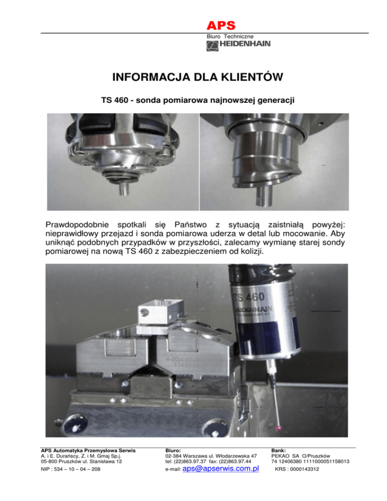 APS Biuro Techniczne INFORMACJA DLA KLIENTÓW TS 460 - sonda pomiarowa najnowszej generacji Prawdopodobnie spotkali się Państwo z sytuacją zaistniałą powyżej: nieprawidłowy przejazd i sonda pomiarowa uderza w detal lub mocowanie. Aby uniknąć podobnych przypadków w przyszłości, zalecamy wymianę starej sondy pomiarowej na nową TS 460 z zabezpieczeniem od kolizji. APS Automatyka Przemysłowa Serwis A. i E. Durańscy, Z. i M. Gmaj Sp.j. 05-800 Pruszków ul. Stanisława 12 Biuro: 02-384 Warszawa ul. Włodarzewska 47 tel: (22)863.97.37 fax: (22)863.97.44 NIP : 534 – 10 – 04 – 208 e-mail: [email protected] Bank: PEKAO SA O/Pruszków 74 12406380 1111000051158013 KRS : 0000143312 APS Biuro Techniczne Sonda pomiarowa TS 460 firmy HEIDENHAIN posiada następujące zalety: • • • • • • • • • Zabezpieczenia od kolizji przy ruchach na płaszczyźnie X/Y i w osi Z Smukła konstrukcja zapewnia więcej swobody przy nachylaniu i obracaniu Inteligentny tryb oczekiwania zapewnia dłuższą pracę na baterii Wymiana baterii nie wymaga narzędzi Można stosować ogólnodostępne baterie ½ AA o napięciu od 1 V do 4 V Nie ma znaczenia również czy bateria jest litowa, alkaliczna czy ładowalna Zasięg 7m dla transmisji sygnału podczerwienią Możliwość zastosowania odbiornika SE 660, umożliwiającego wybór rodzaju transmisji sygnału pomiędzy radiowym a podczerwonym Sensor wykonany w najnowszej technologii pozwala na wykonanie 5 milionów pomiarów z dokładnością rzędu 0,25 µm Sonda TS 460 zastępuje sondy TS 440, TS 640 i TS 649 W przypadku uszkodzonych sond pomiarowych dotychczasowych generacji, oferujemy Państwu ich naprawę w trybie ekspresowym. Naprawiane sondy objęte są roczną gwarancją funkcjonalną. Z poważaniem, APS HEIDENHAIN APS Automatyka Przemysłowa Serwis A. i E. Durańscy, Z. i M. Gmaj Sp.j. 05-800 Pruszków ul. Stanisława 12 Biuro: 02-384 Warszawa ul. Włodarzewska 47 tel: (22)863.97.37 fax: (22)863.97.44 NIP : 534 – 10 – 04 – 208 e-mail: [email protected] Bank: PEKAO SA O/Pruszków 74 12406380 1111000051158013 KRS : 0000143312
