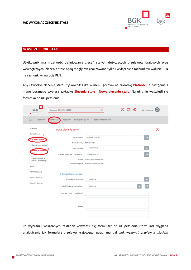JAK WYKONAĆ ZLECENIE STAŁE NOWE ZLECENIE STAŁE Użytkownik ma możliwość definiowania zleceń stałych dotyczących przelewów krajowych oraz wewnętrznych. Zlecenia stałe będą mogły być realizowane tylko i wyłącznie z rachunków walucie PLN na rachunki w walucie PLN. Aby utworzyć zlecenie stałe użytkownik klika w menu górnym na zakładkę Płatności, a następnie z menu bocznego wybiera zakładkę Zlecenia stałe i Nowe zlecenie stałe. Na ekranie wyświetli się formatka do uzupełnienia. Po wybraniu wskazanych zakładek wyświetli się formularz do uzupełnienia (formularz wygląda analogicznie jak formularz przelewu krajowego, patrz: manual „Jak wykonać przelew z użyciem JAK WYKONAĆ ZLECENIE STAŁE tokena”). Należy tylko zwrócić uwagę na pierwszą sekcję formularza, gdzie Użytkownik wybiera typ zlecenia z jakiego ma być utworzone zlecenie stałe. KROK 1. Użytkownik wybiera rachunek źródłowy z którego będą realizowane zlecenia stałe. Jeśli zlecenie stałe jest ustawione z datą przyszłą, należy zapewnić środki na dzień realizacji zlecenia. KROK 2. W sekcji „Odbiorca zlecenia stałego” Użytkownik wpisuje podstawowe dane jak w przypadku przelewu krajowego/wewnętrznego. JAK WYKONAĆ ZLECENIE STAŁE a) Dane do uzupełnienia w przypadku przelewu krajowego b) Dane do uzupełnienia w przypadku przelewu wewnętrznego JAK WYKONAĆ ZLECENIE STAŁE ROK 3. Użytkownik uzupełnia pola wymagane do stworzenia zlecenia stałego w sekcji „Harmonogramu realizacji zlecenia”. Warto zwrócić uwagę na następujące pola we wcześniej wspomnianej sekcji: Częstotliwość – pole będzie pozwalało wybrać cykl i częstotliwość wykonania zlecenia stałego, Pierwsza płatność ‐ data pierwszej płatności będzie domyślnie ustawiona na następny dzień roboczy, Sposób realizacji dla dni wolnych ‐ pole będzie pozwalało na wybranie sposobu realizacji dni wolnych, do wyboru: kolejny dzień roboczy lub poprzedni dzień roboczy, Ostatnia płatność – pole będzie pozwalało na wybranie daty ostatniej płatności – czy ma być to zlecenie stałe, które zostanie zakończone konkretnego dnia, czy też ma być realizowane bezterminowo. KROK 4. Po kliknięciu na przycisk Dalej system przenosi Użytkownika na ekran podsumowujący, gdzie zaprezentowane są wprowadzone dane zlecenia stałego. JAK WYKONAĆ ZLECENIE STAŁE KROK 5. Po poprawnej autoryzacji: a) W przypadku spełnienia schematu akceptacji wyświetlony zostaje komunikat „Zlecenie stałe przyjęto do realizacji” i system wyświetli listę zleceń stałych. b) W przypadku, gdy schemat akceptacji nie został spełniony – zlecenie jest dodawane do listy na formatkę „Zlecenia stałe w trakcie akceptacji” ze statusem „W trakcie akceptacji”.