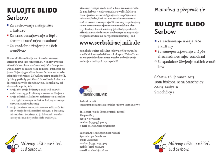 KULOJTE BLIDO Serbow @ Za zachowanje na‰eje rûãe a kultury @ Za samopostajowanje a lûp‰u zhromadnosç mjez susodami & Za spodobne Ïiwjenje na‰ich wnuãkow Lûtstotki hiÏo su Serbja na nûmskim statnym teritoriju Ïiwi jako »mjeƒ‰ina«. Nimamy zwonka nûmskich hranicow maçerny kraj: Wot ãasa puçowanja ludow je ¸uÏica na‰a domizna. Dêensni‰i ãas jenak ãinjaceje globalizacije nas Serbow we wosebitej mûrje wohroÏuje. Zo bychmy tomu znapfieçiwili, dyrbimy pok∏ady pozbûhnyç, kotreÏ na‰a kultura w dêensni‰im swûçe pfiemûnow ma. Namakajmy sej zhromadnje puçe, kak @ swoju rûã, swoje hódnoty a swój wid na swût wobchowamy, poh∏ub‰amy a znowa woÏiwjamy; @ swoje politiske a kulturne naleÏnosçe z demokratisce legitimowanym serbskim ludowym zastupnistwom sami rjadujemy; & swoju domiznu samopostajejo a w solidariçe kaÏ teÏ w pfiezjednosçi z na‰imi rûãnymi a kulturnymi susodami tworimy, zo ju hi‰çe na‰i wnuãcy jako spodobne Ïiwjenske Ïór∏o wuÏiwaja. Móžemy něšto poskićeć. Lud Serbow. Moderny swût po zdaçu dêeƒ a bóle hromadêe rosçe. Za nas Serbow je dobre susodstwo wulka hódnota. Nam njeƒdêe wo wot‰çûpjenje, ale wo pfiipóznaçe toho swójskeho, ‰toÏ nas wot susoda rozeznawa a ‰toÏ to tamne wudospo∏nja. W tym zmysle prócujemy so wo nowe zwuraznjenje swojeje serbskeje identity. Pok∏ady, kotreÏ móÏemy jako Serbja poskiçeç, pfiino‰uja runohódnje a w swobodnym samopostajowanju k susodskemu europskemu koncertej. Pod Namo∏waapfiepro‰enje www.serbski-sejmik.de @ Za zachowanje na‰eje rûãe a kultury @ Za samopostajowanje a lûp‰u zhromadnosç mjez susodami & Za spodobne Ïiwjenje na‰ich wnuãkow namakaçe waÏne zak∏adne teksty a pfiihotowanske wuslûdki dotalnych dêû∏owych skupin. Wobroççe so na wotpowûdne kontaktne wosoby, zo by‰çe swoje pra‰enja a dal‰e pokiwy zapodali! KULOJTE BLIDO Serbow Sobotu, 26. januara 2013 Dom biskopa Bena Smochçicy 02625 Budy‰in Smochçicy 1 Serbski sejmik iniciatiwna skupina za serbske ludowe zastupnistwo dr. Mûrçin Wa∏da (hornjo∏uÏiski rûãnik) Ringstraße 5 02699 Njeswaãid∏o telefon: (03 59 33) 3 04 03 e-mail: [email protected] Michael Apel (delnjo∏uÏiski rûãnik) Spremberger Straße 40 03046 Choçebuz telefon: (03 55) 4 94 53 05 mobil: (01 77) 5 93 94 51 e-mail: [email protected] Móžemy něšto poskićeć. Lud Serbow. KULOJTE BLIDO Serbow Sobotu, 26. januara 2013 Dom biskopa Bena Smochçicy 02625 Budy‰in, Smochçicy 1 @ Program 9:00 Plenum – zawod do tematiki: âehodla móÏa Serbja k wnuãkokmanemu swûtej jenoÏ w samopostajowanju pfiino‰owaç? 10:30 Diskusija w dêû∏owych skupinach 1: Identita: ·to je serbskosç a ãehodla swût nas trjeba? 2: Serbja w Europje: Jich mûstno a nadawki 3: Serbske kub∏anje, dwurûãnosç a zachowanje serbskeje rûãe a kultury 4: Struktury demokratisce legitimowaneho Serbskeho sejmika 5: Prawo a wólbne prawo za Serbski sejmik 6: M∏odêina (we w‰ûch skupinach integrowana) 12:30 Plenum – dêû∏owe skupiny rozprawjeja 13:00 Wobjed 14:30 Plenum – wuhódnoçenje informelnych rozmo∏wow we wobjedowej pfiestawce 15:00 Dêû∏o w skupinach 17:00 Plenum – dêû∏owe skupiny rozprawjeja 18:00 Plenum – rozsudy wo dal‰im dêûle 19:00 Wjeãer a informelna rozmo∏wa âehodla trjebaja Serbja kulojte blido? âehodla to w‰itkich nastupa? Po mûrliwej rewoluciji su Serbja w Delnjej a Hornjej ¸uÏicy cy∏kownje w komplikowanym politiskim po∏oÏenju. Globalizacija, indiwidualizacija, pluralizacija, pfiibûraca mobilita a dotal njeznate komunikaciske móÏnosçe w towar‰nosçi wuÏaduja sej nowe wusmûrjenje politiskeho jednanja, nochcemy-li dal‰emu pozhubjowanju serbskeje rûãe, kultury a wole sebjezachowanja Serbow pfiihladowaç. W aprylu 2011 je so iniciatiwna skupina Serbski sejmik ze‰∏a, zo by dawno Ïadane demokratisce legitimowane serbske ludowe zastupnistwo do Ïiwjenja zwo∏a∏a. H∏owny zamûr je to swoje zesylniç, so w Ïiwych tradicijach zwoprawdêiç a wuknyç, so transparentnje a demokratisce mjez sobu rozestajeç, zo je teÏ hi‰çe najçi‰i‰i h∏ós s∏y‰eç. Jara wjele politisce aktiwnych ludêi – Serbja a Nûmcy – sej tajku instituciju pfieje. Z kulojtym blidom chce iniciatiwna skupina ‰ûroki demokratiski diskurs w serbskej zjawnosçi zahajiç. sk 3:Serbske kub∏anje, dwurûãnosç a zachowanje rûãe a kultury Kotre kub∏anske struktury wotpowûduja serbskej kulturje? – Kotre kub∏anske zamûry dyrbja sej serbske kub∏anske zarjadni‰ça stajiç? sk 4: Struktury demokratisce legitimowaneho Serbskeho sejmika Kak tworja so rozsudy w serbskej towar‰nosçi: po wjet‰inje abo w konsensu? – Kak hodêi so wola serbskeho ludu zwoprawdêiç? sk 5: Prawo a wólbne prawo za Serbski sejmik ·tó je Serb? – Kak stanu so ze Serbom? – Kajke prawa mam jako Serb? – Ludoprawniski wob∏uk – Kak woli so Serbski sejmik? sk 6: M∏odêina DokelÏ wotwisuja pfiichod a nadawki serbskeje m∏odêiny wot tamnych skupin, je tale tema do w‰ûch dêû∏owych skupin zapfiijata. @ Temy dêû∏owych skupin sk 1: Identita: ·to je serbskosç a ãehodla nas swût trjeba? ·to je to Ïiwe w serbskim swûçe? – Kotre historiske cezury su serbsku identitu postajeli a tworili? ·to móÏemy z toho wuknyç? – Kak pfiewinjemy roz‰çûpjenje w Serbach (dwû konfesiji, dwaj zwjazkowej krajej ze w‰elakimi regionami)? – Kak hodêa so rany zaƒdêenosçe na dobro nowych wizijow do pfiichoda zwuÏiç? sk 2:Serbja w Europje: Jich mûstno a nadawki â∏owjek trjeba domiznu: Kak móÏe so Europa z domiznu Serbow staç? – Kak móÏa Serbja k »Europje regionow« pfiino‰owaç? – Kajke druhe »ma∏e ludy« su w Europje, hdêe su podobne problemy a rozrisanja? Móžemy něšto poskićeć. Lud Serbow.