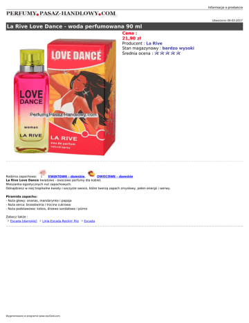 Informacje o produkcie Utworzono 06-03-2017 La Rive Love Dance - woda perfumowana 90 ml Cena : 21,90 zł Producent : La Rive Stan magazynowy : bardzo wysoki Średnia ocena : Rodzina zapachowa: KWIATOWE - damskie, OWOCOWE - damskie La Rive Love Dance kwiatowo - owocowe perfumy dla kobiet. Mieszanka egzotycznych nut zapachowych. Odnajdziesz w niej tropikalne kwiaty i soczyste owoce, które tworzą zapach zmysłowy, pełen energii i werwy. Piramida zapachu: - Nuta głowy: ananas, mandarynka i papaja - Nuta serca: brzoskwinia i trzcina cukrowa - Nuta podstawowa: kokos, drzewo sandałowe i piżmo Zobacz także : Escada [damskie] Linia Escada Rockin' Rio Wygenerowano w programie www.oscGold.com Escada
