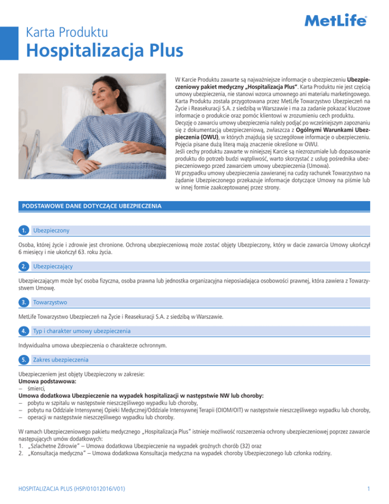 Karta Produktu Hospitalizacja Plus W Karcie Produktu zawarte są najważniejsze informacje o ubezpieczeniu Ubezpieczeniowy pakiet medyczny „Hospitalizacja Plus”. Karta Produktu nie jest częścią umowy ubezpieczenia, nie stanowi wzorca umownego ani materiału marketingowego. Karta Produktu została przygotowana przez MetLife Towarzystwo Ubezpieczeń na Życie i Reasekuracji S.A. z siedzibą w Warszawie i ma za zadanie pokazać kluczowe informacje o produkcie oraz pomóc klientowi w zrozumieniu cech produktu. Decyzję o zawarciu umowy ubezpieczenia należy podjąć po wcześniejszym zapoznaniu się z dokumentacją ubezpieczeniową, zwłaszcza z Ogólnymi Warunkami Ubezpieczenia (OWU), w których znajdują się szczegółowe informacje o ubezpieczeniu. Pojęcia pisane dużą literą mają znaczenie określone w OWU. Jeśli cechy produktu zawarte w niniejszej Karcie są niezrozumiałe lub dopasowanie produktu do potrzeb budzi wątpliwość, warto skorzystać z usług pośrednika ubezpieczeniowego przed zawarciem umowy ubezpieczenia (Umowa). W przypadku umowy ubezpieczenia zawieranej na cudzy rachunek Towarzystwo na żądanie Ubezpieczonego przekazuje informacje dotyczące Umowy na piśmie lub w innej formie zaakceptowanej przez strony. Podstawowe dane dotyczące ubezpieczenia 1. Ubezpieczony Osoba, której życie i zdrowie jest chronione. Ochroną ubezpieczeniową może zostać objęty Ubezpieczony, który w dacie zawarcia Umowy ukończył 6 miesięcy i nie ukończył 63. roku życia. 2. Ubezpieczający Ubezpieczającym może być osoba fizyczna, osoba prawna lub jednostka organizacyjna nieposiadająca osobowości prawnej, która zawiera z Towarzystwem Umowę. 3. Towarzystwo MetLife Towarzystwo Ubezpieczeń na Życie i Reasekuracji S.A. z siedzibą w Warszawie. 4. Typ i charakter umowy ubezpieczenia Indywidualna umowa ubezpieczenia o charakterze ochronnym. 5. Zakres ubezpieczenia Ubezpieczeniem jest objęty Ubezpieczony w zakresie: Umowa podstawowa: −śmierci, Umowa dodatkowa Ubezpieczenie na wypadek hospitalizacji w następstwie NW lub choroby: − pobytu w szpitalu w następstwie nieszczęśliwego wypadku lub choroby, − pobytu na Oddziale Intensywnej Opieki Medycznej/Oddziale Intensywnej Terapii (OIOM/OIT) w następstwie nieszczęśliwego wypadku lub choroby, − operacji w następstwie nieszczęśliwego wypadku lub choroby. W ramach Ubezpieczeniowego pakietu medycznego „Hospitalizacja Plus” istnieje możliwość rozszerzenia ochrony ubezpieczeniowej poprzez zawarcie następujących umów dodatkowych: 1. „Szlachetne Zdrowie” – Umowa dodatkowa Ubezpieczenie na wypadek groźnych chorób (32) oraz 2. „Konsultacja medyczna” – Umowa dodatkowa Konsultacja medyczna na wypadek choroby Ubezpieczonego lub członka rodziny. HOSPITALIZACJA PLUS (HSP/01012016/V01) 1 6. Początek ochrony ubezpieczeniowej Umowa podstawowa 1. Odpowiedzialność Towarzystwa rozpoczyna się od daty wejścia w życie Umowy (data rozpoczęcia ochrony ubezpieczeniowej), pod warunkiem zawarcia Umowy i jest wskazana w Szczegółowej Umowie Ubezpieczenia (polisie). Warunkiem zawarcia Umowy jest otrzymanie i zaakceptowanie przez Towarzystwo: a) podpisanego przez Ubezpieczającego wniosku o zawarcie Umowy oraz b) kwoty na poczet pierwszej składki opłaconej przez Ubezpieczającego, oraz wszystkich wymaganych przez Towarzystwo dokumentów niezbędnych do podjęcia decyzji o objęciu Ubezpieczonego ochroną ubezpieczeniową. Data zawarcia Umowy jest datą odebrania polisy przez Ubezpieczającego, dlatego ważne jest, by jak najszybciej odebrać polisę. 2. Data rozpoczęcia ochrony ubezpieczeniowej zostanie wskazana w polisie. Umowa dodatkowa Odpowiedzialność Towarzystwa rozpoczyna się od daty wejścia w życie umowy dodatkowej wskazanej w Szczegółowej Umowie Ubezpieczenia, pod warunkiem zawarcia umowy dodatkowej oraz opłacenia składki. 7. Koniec ochrony ubezpieczeniowej Umowa podstawowa 1. Umowa podstawowa zawierana jest na czas określony do dnia rocznicy Umowy następującej bezpośrednio po 65. urodzinach Ubezpieczonego. 2. Umowa wygasa w każdym z następujących przypadków: a) w dniu śmierci Ubezpieczonego lub b) odstąpienia od Umowy – z dniem otrzymania od Ubezpieczyciela wniosku o odstąpienie od Umowy, lub c) z datą wygaśnięcia umowy podstawowej (rocznicy Umowy następującej bezpośrednio po 65. urodzinach Ubezpieczonego) oznaczoną w Szczegółowej Umowie Ubezpieczenia, lub d) z dniem rozwiązania Umowy w związku z wypowiedzeniem Umowy przez Ubezpieczającego, lub e) nieopłacenia składki, z upływem okresu karencji, nie wcześniej jednak niż po upływie 7 dni od daty otrzymania wezwania do zapłaty składki. Umowa dodatkowa 1. Umowa dodatkowa zawierana jest na okres (roczny, półroczny, kwartalny i miesięczny), za który Ubezpieczający opłacił składkę oraz następujący po nim okres karencji określony w umowie podstawowej, z tym że nie dłużej niż do końca okresu obowiązywania umowy podstawowej. 2. Umowa dodatkowa wygasa w każdym z następujących przypadków: a) którakolwiek składka z tytułu Umowy nie została opłacona do końca okresu karencji przewidzianego w Umowie, lecz nie wcześniej niż dnia następnego po upływie 7 dni od daty otrzymania wezwania do opłacenia składki lub b) umowa podstawowa wygasła lub została rozwiązana, lub c) Ubezpieczony został w trakcie obowiązywania niniejszej umowy dodatkowej uznany za niepoczytalnego – z dniem powstania stanu niepoczytalności, lub d) Ubezpieczony wstąpił lub został powołany do lądowych, powietrznych lub morskich sił zbrojnych albo do oddziałów pomocniczych lub cywilnych działających w strukturach armii jakiegokolwiek kraju będącego w stanie wojny – z dniem wybuchu lub ogłoszenia stanu wojny, lub e) w rocznicę Umowy następującą bezpośrednio po 65. urodzinach Ubezpieczonego, niezależnie od tego, czy umowa podstawowa pozostaje w mocy po tym terminie. W przypadkach określonych w pu