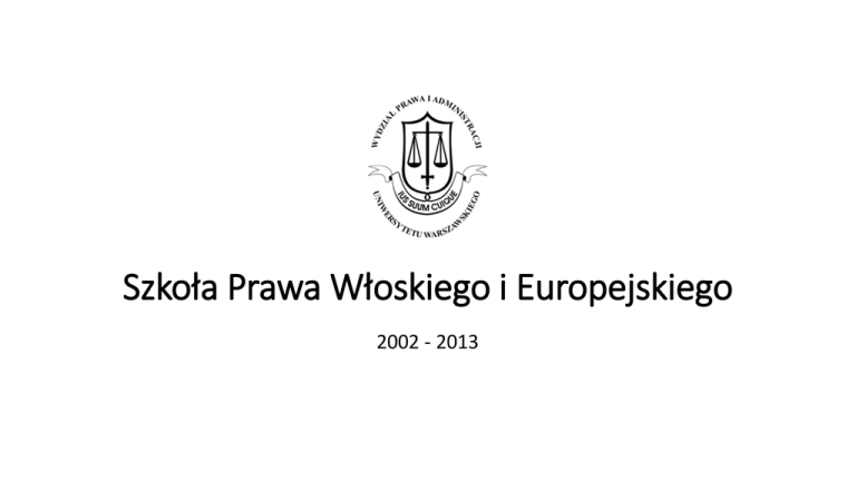 Szkoła Prawa Włoskiego i Europejskiego 2002 - 2013 Szkoła Prawa Włoskiego i Europejskiego jest wspólnym przedsięwzięciem edukacyjnym Wydziału Prawa i Administracji Uniwersytetu Warszawskiego oraz Dipartimento Seminario Giuridico Università degli Studi di Catania. Celem Szkoły jest zaspokojenie rosnącego zapotrzebowania na prawników znających (oprócz prawa polskiego) podstawowe zasady włoskiego systemu prawnego, włoski język prawniczy oraz włoskie i unijne unormowania w zakresie obrotu gospodarczego. Szkoła Prawa Włoskiego i Europejskiego jest rocznym kursem obejmującym podstawy włoskiego systemu prawa oraz wybrane zagadnienia z zakresu obrotu gospodarczego, w szczególności: - Prawo cywilne, w tym prawo kontraktów - Prawo handlowe - Prawo bankowe - Prawo karne - Prawo własności intelektualnej. Program Szkoły został tak skonstruowany, by słuchacze mogli znajomić się nie tylko z zagadnieniami teoretycznoprawnymi, ale również z praktycznymi aspektami obrotu prawnego we Włoszech. Zajęcia w ramach Szkoły Prawa Włoskiego i Europejskiego prowadzą pracownicy dydaktyczni renomowanych włoskich uczelni: Università degli Studi di Catania, Università Cattolica del Sacro Cuore di Milano i Università degli Studi di Napoli Federico II; oraz uznani praktycy – notariusze i adwokaci. Szkoła Prawa Włoskiego i Europejskiego rozpoczęła swoją działalność w 2002 r. Do tej pory odbyło się XI edycji kursu, w których uczestniczyło kilkuset słuchaczy: zarówno studentów wydziałów prawa wyższych uczelni z Polski i z zagranicy, jak również wielu praktyków – sędziów, radców prawnych, adwokatów, notariuszy i tłumaczy przysięgłych. Wydział Prawa i Administracji Uniwersytetu Warszawskiego Szkoła Prawa Włoskiego i Europejskiego ul. Krakowskie Przedmieście 26/28 00-927 Warszawa tel. +48 503 043 034 © 2013 WPiA UW