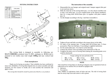 FITTING INSTRUCTION Clamp mark in acc. with ISO PN 1 L 2 + 3 31 4 R 5 58R 6 54 7 58L The instruction of the assembly 1. Disassemble the rear bumper and original metal bumper support (this part is not used any more). 2. Slide the main bar of the towing hitch (pos. 1) to the chassis members (do it such a way holes (pos. A) cover original holes in the chassis members), then fix it using bolts M10x35mm (pos. 6) together with plain washers (pos. 4). 3. Cut the bumper according to the fig. 2 and then reassemble it. Cables joining 6 Left directional lights Rear fog lights Ground Right directional lights Right side parking lights Stoplights Left side parking lights 4 A Cut out 1 13 85 14 A 110 15 5 7 4 Fig. 2 85 90 13 6 12 3 2 This towing hitch is designed to assembly in following car: SEAT CORDOBA, produced since 01.2003, catalogue no. SC41A and is prepared to tow trailers max total weight 1200kg and max vertical load 50kg. From manufacturer Thank you for buying our product. Their reliability has been confirmed in many tests. Reliability of towing hitch depends also on correct assembly and right operation. For this reasons we kindly ask to read carefully this instruction and apply to hints. The towing hitch should be install in points described by a car producer. 4. Tighten all nuts and bolts according to the torque shown in the table. 5. Fix body of the automat (pos. 7) using bolts M12x25mm (pos. 5) from accessories. Place tow-ball (pos. 2) according to supplied instruction. 6. Fix the socket plate (pos. 3) as shown on the drawing. 7. Connect the electric wires according to the instructions of the car 8. Complete the paint cover of towing hitch (during the mounting paint cover could be destroyed) Torque settings for nuts and bolts (8,8): M6 - 11 Nm M 8 - 25 Nm M 10 - 50 Nm M 12 - 87 Nm M 14 - 138 Nm M16 - 210 Nm NOTE After install the towing hitch you should get adequate note in registration book (at authorised service station).The car should be equipped with: • Indicators • Tow mirrors After 1000km of exploitation check all bolts and nuts. The ball of towing hitch must be always kept clear and conserve with a grease. PPUH AUTO-HAK Sp.J. Towing hitch accessories: Produkcja Zaczepów Kulowych Henryk & Zbigniew Nejman 76-200 SŁUPSK ul. Słoneczna 16K tel/fax (059) 8-414-414; 8-414-413 E-mail: [email protected] www. autohak.com.pl Towing hitch (without electrical set) Class: A50-X Cat. no. SC41A Designed for: Manufacturer: SEAT Model: CORDOBA produced since 01.2003 Technical data: D-value: 6,96 kN maximum trailer weight: 1200 kg maximum vertical cup load: 50 kg Approval number according to Directive 94/20/EC: e20*94/20*1128*00 Foreword This towing hitch is designed according to rules of safety traffic regulations. The towing hitch is a safety component and can be install only by qualified personnel. Any alteration or conversion of the towing hitch is prohibited and would lead to cancellation of design certification. Remove insulating compound and underseal from vehicle (if present) in the area of the matting surfaces of the towing hitch. The vehicle manufacturer’s specifications regarding trailer load and max. vertical cup load are decisive for driving, and values for the towing hitch cannot be exceeded. D-value formula: Max trailer weight [kg] x Max vehicle weight [kg] Max trailer weight [kg] + Max vehicle weight [kg] X 9,81 = 1000 D [kN] INSTRUKCJA MontaŜu i eksploatacji zaczepu kulowego Oznaczenie zacisku wg ISO PN 1 L 2 + 3 31 4 R 5 58R 6 54 7 58L Kolejność czynności przy montaŜu 1. 6 Łączenie przewodów 2. 4 Kierunkowskazy lewe Tylne światła przeciwmgłowe Masa Kierunkowskazy prawe Światła pozycyjne prawe Światła hamowania Światła pozycyjne lewe 3. Zdemontować zderzak, a następnie odkręcić fabryczną metalową czaszę zderzaka (nie będzie wykorzystana). Wsunąć belkę główną zaczepu (poz. 1) w tunele podłuŜnic tak aby otwory (poz. A) w zaczepie nałoŜyły się na fabryczne otwory w podłuŜnicy, a następnie skręcić śrubami M10x35mm (poz. 6) z wyposaŜenia, wykorzystując duŜe podkładki płaskie (poz. 4). Zamontować zderzak po uprzednim wycięciu fragmentu, jak pokazano na rys. 2. Wyciąć A 85 1 13 110 14 A 15 5 Rys. 2 85 90 7 4 4. 13 6 5. 6. 7. 12 3 2 8. Zaczep kulowy przeznaczony jest do zamontowania w samochodzie: SEAT CORDOBA, produkowanym od 01.2003r., nr katalogowy SC41A i słuŜy do ciągnięcia przyczep o masie całkowitej 1200 kg i nacisku na kulę max 50 kg. Przykręcić korpus automatu (poz. 7) śrubami M12x25mm (poz. 5). Zamocować kulę zgodnie z instrukcją dołączaną do zaczepu z końcówką szybkodemontowalną. Przykręcić blachę pod gniazdo (poz. 3) zgodnie z rysunkiem. Dokręcić wszystkie śruby z momentem jak pokazano w tabeli. Podłączyć przewody gniazdka 7 – bieg. do instalacji elektrycznej zgodnie z instrukcją fabryczną samochodu (zaleca się wykonanie w ASO). Uzupełnić ewentualne ubytki powłoki malarskiej zaczepu powstałe w trakcie montaŜu Zalecany moment skręcający dla śrub i nakrętek 8,8: M6 - 11 Nm M8 - 25 Nm M10 - 50 Nm M12 - 87 Nm M14 - 138 Nm M16 - 210 Nm OD PRODUCENTA UWAGA Dziękujemy za wybór produkowanego przez naszą firmę zaczepu kulowego. Jego niezawodność została potwierdzona licznymi testami oraz opiniami zadowolonych klientów. JednakŜe niezawodność zaczepów kulowych jest zaleŜna równieŜ od prawidłowego montaŜu oraz prawidłowej eksploatacji. Z tego powodu prosimy Państwa o staranne przeczytanie niniejszej instrukcji montaŜu oraz przestrzeganie zawartych wskazówek. Po zamontowaniu zaczepu kulowego naleŜy uzyskać wpis w dowodzie rejestracyjnym pojazdu na „stacji kontroli pojazdów” właściwej dla miejsca zamieszkania. Samochód powinien być wyposaŜony w : -kierunkowskazy boczne -lusterka boczne o rozstawie co najmniej szerokości przyczepy Sprawdzać śruby mocujące zaczepu kulowego po około 1 000 km przebiegu eksploatacji. Kula zaczepu musi być utrzymana w czystoś