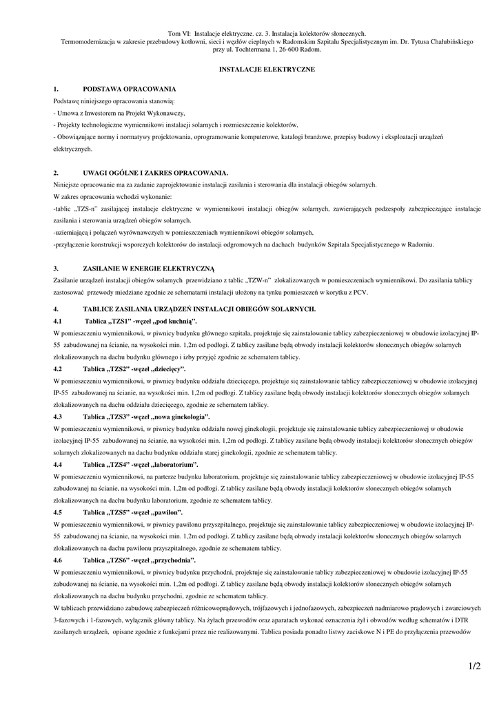 Tom VI: Instalacje elektryczne. cz. 3. Instalacja kolektorów słonecznych. Termomodernizacja w zakresie przebudowy kotłowni, sieci i węzłów cieplnych w Radomskim Szpitalu Specjalistycznym im. Dr. Tytusa Chałubińskiego przy ul. Tochtermana 1, 26-600 Radom. INSTALACJE ELEKTRYCZNE 1. PODSTAWA OPRACOWANIA Podstawę niniejszego opracowania stanowią: - Umowa z Inwestorem na Projekt Wykonawczy, - Projekty technologiczne wymiennikowi instalacji solarnych i rozmieszczenie kolektorów, - Obowiązujące normy i normatywy projektowania, oprogramowanie komputerowe, katalogi branżowe, przepisy budowy i eksploatacji urządzeń elektrycznych. 2. UWAGI OGÓLNE I ZAKRES OPRACOWANIA. Niniejsze opracowanie ma za zadanie zaprojektowanie instalacji zasilania i sterowania dla instalacji obiegów solarnych. W zakres opracowania wchodzi wykonanie: -tablic „TZS-n” zasilającej instalacje elektryczne w wymiennikowi instalacji obiegów solarnych, zawierających podzespoły zabezpieczające instalacje zasilania i sterowania urządzeń obiegów solarnych. -uziemiającą i połączeń wyrównawczych w pomieszczeniach wymiennikowi obiegów solarnych, -przyłączenie konstrukcji wsporczych kolektorów do instalacji odgromowych na dachach budynków Szpitala Specjalistycznego w Radomiu. 3. ZASILANIE W ENERGIE ELEKTRYCZNĄ Zasilanie urządzeń instalacji obiegów solarnych przewidziano z tablic „TZW-n” zlokalizowanych w pomieszczeniach wymiennikowi. Do zasilania tablicy zastosować przewody miedziane zgodnie ze schematami instalacji ułożony na tynku pomieszczeń w korytku z PCV. 4. TABLICE ZASILANIA URZĄDZEŃ INSTALACJI OBIEGÓW SOLARNYCH. 4.1 Tablica „TZS1” -węzeł „pod kuchnią”. W pomieszczeniu wymiennikowi, w piwnicy budynku głównego szpitala, projektuje się zainstalowanie tablicy zabezpieczeniowej w obudowie izolacyjnej IP55 zabudowanej na ścianie, na wysokości min. 1,2m od podłogi. Z tablicy zasilane będą obwody instalacji kolektorów słonecznych obiegów solarnych zlokalizowanych na dachu budynku głównego i izby przyjęć zgodnie ze schematem tablicy. 4.2 Tablica „TZS2” -węzeł „dziecięcy”. W pomieszczeniu wymiennikowi, w piwnicy budynku oddziału dziecięcego, projektuje się zainstalowanie tablicy zabezpieczeniowej w obudowie izolacyjnej IP-55 zabudowanej na ścianie, na wysokości min. 1,2m od podłogi. Z tablicy zasilane będą obwody instalacji kolektorów słonecznych obiegów solarnych zlokalizowanych na dachu oddziału dziecięcego, zgodnie ze schematem tablicy. 4.3 Tablica „TZS3” -węzeł „nowa ginekologia”. W pomieszczeniu wymiennikowi, w piwnicy budynku oddziału nowej ginekologii, projektuje się zainstalowanie tablicy zabezpieczeniowej w obudowie izolacyjnej IP-55 zabudowanej na ścianie, na wysokości min. 1,2m od podłogi. Z tablicy zasilane będą obwody instalacji kolektorów słonecznych obiegów solarnych zlokalizowanych na dachu budynku oddziału starej ginekologii, zgodnie ze schematem tablicy. 4.4 Tablica „TZS4” -węzeł „laboratorium”. W pomieszczeniu wymiennikowi, na parterze budynku laboratorium, projektuje się zainstalowanie tablicy zabezpieczeniowej w obudowie izolacyjnej IP-55 zabudowanej na ścianie, na wysokości min. 1,2m od podłogi. Z tablicy zasilane będą obwody instalacji kolektorów słonecznych obiegów solarnych zlokalizowanych na dachu budynku laboratorium, zgodnie ze schematem tablicy. 4.5 Tablica „TZS5” -węzeł „pawilon”. W pomieszczeniu wymiennikowi, w piwnicy pawilonu przyszpitalnego, projektuje się zainstalowanie tablicy zabezpieczeniowej w obudowie izolacyjnej IP55 zabudowanej na ścianie, na wysokości min. 1,2m od podłogi. Z tablicy zasilane będą obwody instalacji kolektorów słonecznych obiegów solarnych zlokalizowanych na dachu pawilonu przyszpitalnego, zgodnie ze schematem tablicy. 4.6 Tablica „TZS6” -węzeł „przychodnia”. W pomieszczeniu wymiennikowi, w piwnicy budynku przychodni, projektuje się zainstalowanie tablicy zabezpieczeniowej w obudowie izolacyjnej IP-55 zabudowanej na ścianie, na wysokości min. 1,2m od podłogi. Z tablicy zasilane będą obwody instalacji kolektorów słonecznych obiegów solarnych zlokalizowanych na dachu budynku przychodni, zgodnie ze schematem tablicy. W tablicach przewidziano zabudowę zabezpieczeń różnicowoprądowych, trójfazowych i jednofazowych, zabezpieczeń nadmiarowo prądowych i zwarciowych 3-fazowych i 1-fazowych, wyłącznik główny tablicy. Na żyłach przewodów oraz aparatach wykonać oznaczenia żył i obwodów według schematów i DTR zasilanych urządzeń, opisane zgodnie z funkcjami przez nie realizowanymi. Tablica posiada ponadto listwy zaciskowe N i PE do przyłączenia przewodów 1/2 Tom VI: Instalacje elektryczne. cz. 3. Instalacja kolektorów słonecznych. Termomodernizacja w zakresie przebudowy kotłowni, sieci i węzłów cieplnych w Radomskim Szpitalu Specjalistycznym im. Dr. Tytusa Chałubińskiego przy ul. Tochtermana 1, 26-600 Radom. neutralnych i ochronnych. Listwę PE tablicy połączyć poprzez zacisk kontrolny ZZK z instalacją połączeń wyrównawczych budynku szpitala w którym znajduje się wymiennikownia. 2/2 Tom VI: Instalacje elektryczne. cz. 3. Instalacja kolektorów słonecznych. Termomodernizacja w zakresie przebudowy kotłowni, sieci i węzłów cieplnych w Radomskim Szpitalu Specjalistycznym im. Dr. Tytusa Chałubińskiego przy ul. Tochtermana 1, 26-600 Radom. 5. STEROWANIE URZĄDZENIAMI Skrzynka sterownicza pomp zasilać będą pompy obiegowe sterowane na podstawie wskazań czujników temperatury. Regulatory współpracować będą także z zaworami trójdrogowymi w obiegach grzewczych. Regulatory wypracowywać będą funkcje pracy pomp na podstawie wskazań temperatury w poszczególnych obiegach i na podstawie temperatury zewnętrznej kolektorów słonecznych. Pompy elektroniczne nie wymagają dodatkowego zabezpieczenia poza zastosowanymi w regulatorach. Z tablic bezpośrednio sterowane są 