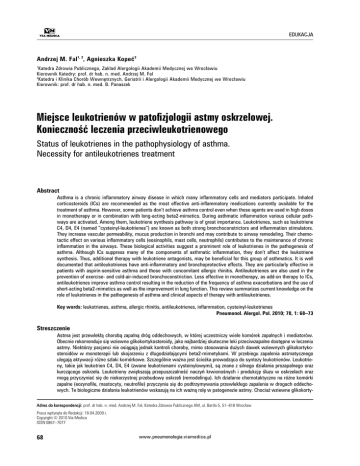 PRACA ORYGINALNA EDUKACJA Andrzej M. Fal 1, 2, Agnieszka Kopeć 2 1 Katedra Zdrowia Publicznego, Zakład Alergologii Akademii Medycznej we Wrocławiu Kierownik Katedry: prof. dr hab. n. med. Andrzej M. Fal 2 Katedra i Klinika Chorób Wewnętrznych, Geriatrii i Alergologii Akademii Medycznej we Wrocławiu Kierownik: prof. dr hab. n. med. B. Panaszek Miejsce leukotrienów w patofizjologii astmy oskrzelowej. Konieczność leczenia przeciwleukotrienowego Status of leukotrienes in the pathophysiology of asthma. Necessity for antileukotrienes treatment Abstract Asthma is a chronic inflammatory airway disease in which many inflammatory cells and mediators participate. Inhaled corticosteroids (ICs) are recommended as the most effective anti-inflammatory medications currently available for the treatment of asthma. However, some patients don’t achieve asthma control even when these agents are used in high doses in monotherapy or in combination with long-acting beta2-mimetics. During asthmatic inflammation various cellular pathways are activated. Among them, leukotriene synthesis pathway is of great importance. Leukotrienes, such as leukotriene C4, D4, E4 (named “cysteinyl-leukotrienes”) are known as both strong bronchoconstrictors and inflammation stimulators. They increase vascular permeability, mucus production in bronchi and may contribute to airway remodeling. Their chemotactic effect on various inflammatory cells (eosinophils, mast cells, neutrophils) contributes to the maintenance of chronic inflammation in the airways. These biological activities suggest a prominent role of leukotrienes in the pathogenesis of asthma. Although ICs suppress many of the components of asthmatic inflammation, they don’t affect the leukotriene synthesis. Thus, additional therapy with leukotriene antagonists, may be beneficial for this group of asthmatics. It is well documented that antileukotrienes have anti-inflammatory and bronchoprotective effects. They are particularly effective in patients with aspirin-sensitive asthma and those with concomitant allergic rhinitis. Antileukotrienes are also used in the prevention of exercise- and cold-air-induced bronchoconstriction. Less effective in monotherapy, as add-on therapy to ICs, antileukotrienes improve asthma control resulting in the reduction of the frequency of asthma exacerbations and the use of short-acting beta2-mimetics as well as the improvement in lung function. This review summarizes current knowledge on the role of leukotrienes in the pathogenesis of asthma and clinical aspects of therapy with antileukotrienes. Key words: leukotrienes, asthma, allergic rhinitis, antileukotrienes, inflammation, cysteinyl-leukotrienes Pneumonol. Alergol. Pol. 2010; 78, 1: 68–73 Streszczenie Astma jest przewlekłą chorobą zapalną dróg oddechowych, w której uczestniczy wiele komórek zapalnych i mediatorów. Obecnie rekomenduje się wziewne glikokortykosteroidy, jako najbardziej skuteczne leki przeciwzapalne dostępne w leczeniu astmy. Niektórzy pacjenci nie osiągają jednak kontroli choroby, mimo stosowania dużych dawek wziewnych glikokortykosteroidów w monoterapii lub skojarzeniu z długodziałającymi beta2-mimetykami. W przebiegu zapalenia astmatycznego ulegają aktywacji różne szlaki komórkowe. Szczególnie ważna jest ścieżka prowadząca do syntezy leukotrienów. Leukotrieny, takie jak leukotrien C4, D4, E4 (zwane leukotrienami cysteinylowymi), są znane z silnego działania prozapalnego oraz kurczącego oskrzela. Leukotrieny zwiększają przepuszczalność naczyń krwionośnych i produkcję śluzu w oskrzelach oraz mogą przyczyniać się do niekorzystnej przebudowy oskrzeli (remodelingu). Ich działanie chemotaktyczne na różne komórki zapalne (eozynofile, mastocyty, neutrofile) przyczynia się do podtrzymywania przewlekłego zapalenia w drogach oddechowych. Te biologiczne działania leukotrienów wskazują na ich ważną rolę w patogenezie astmy. Chociaż wziewne glikokortyAdres do korespondencji: prof. dr hab. n. med. Andrzej M. Fal, Katedra Zdrowia Publicznego AM, ul. Bartla 5, 51–618 Wrocław Praca wpłynęła do Redakcji: 19.04.2009 r. Copyright © 2010 Via Medica ISSN 0867–7077 68 www.pneumonologia.viamedica.pl Andrzej M. Fal, Agnieszka Kopeć, Miejsce leukotrienów w patofizjologii astmy oskrzelowej kosteroidy hamują wiele składowych zapalenia astmatycznego, to nie wpływają one na syntezę leukotrienów. W związku z tym dodatkowa terapia za pomocą antagonistów leukotrienów może okazać się korzystna dla tej grupy astmatyków. Dobrze udokumentowano działanie przeciwzapalne i bronchoprotekcyjne antyleukotrienów. Są one szczególnie skuteczne u pacjentów z astmą aspirynową i tych ze współistniejącym alergicznym nieżytem nosa. Leki antyleukotrienowe są także stosowane w zapobieganiu skurczowi oskrzeli wywołanym wysiłkiem i zimnym powietrzem. Mniej skuteczne w monoterapii, jako terapia dodana do wziewnych glikokortykosteroidów, poprawiają kontrolę astmy, powodując zmniejszenie liczby zaostrzeń choroby, zużycia krótkodziałających beta2-mimetyków oraz poprawę funkcji płuc. Artykuł podsumowuje obecną wiedzę na temat roli leukotrienów w patogenezie astmy oraz aspektów klinicznych terapii lekami antyleukotrienowymi. Słowa kluczowe: leukotrieny, astma, alergiczny nieżyt nosa, antyleukotrieny, zapalenie, cysteinylowe leukotrieny Pneumonol. Alergol. Pol. 2010; 78, 1: 68–73 Współczesna terapia astmy jest ukierunkowana na jak najlepszą kontrolę zapalenia astmatycznego w drogach oddechowych. Niewątpliwie najistotniejsze znaczenie w terapii przeciwzapalnej choroby mają wziewne glikokortykosteroidy (wGKS), uznawane od lat za leki pierwszego rzutu w leczeniu astmy. Wiadomo jednak, że wGKS nie kontrolują wszystkich torów zapalenia astmatycznego, a zwłaszcza nie wpływają na syntezę leukotrienów — mediatorów odgrywających ważną rolę w patogenezie astmy i alergicznego nieżytu nosa [1]. 