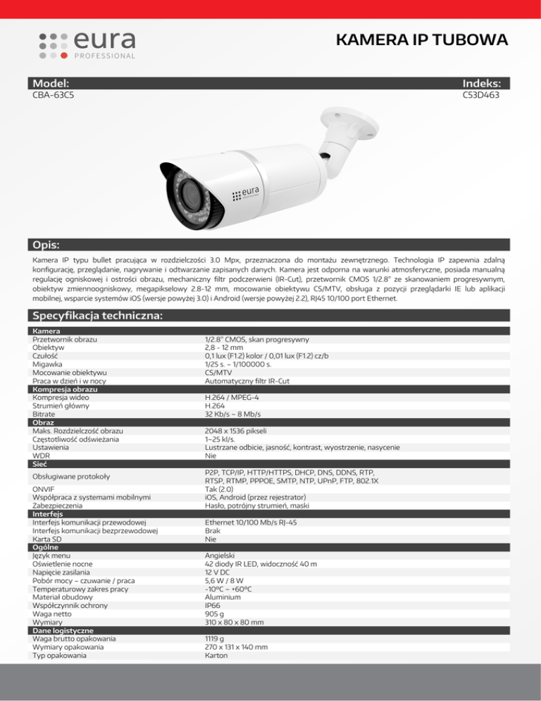 KAMERA IP TUBOWA Model: Indeks: CBA-63C5 C53D463 Opis: Kamera IP typu bullet pracująca w rozdzielczości 3.0 Mpx, przeznaczona do montażu zewnętrznego. Technologia IP zapewnia zdalną konfigurację, przeglądanie, nagrywanie i odtwarzanie zapisanych danych. Kamera jest odporna na warunki atmosferyczne, posiada manualną regulację ogniskowej i ostrości obrazu, mechaniczny filtr podczerwieni (IR-Cut), przetwornik CMOS 1/2.8" ze skanowaniem progresywnym, obiektyw zmiennoogniskowy, megapikselowy 2.8-12 mm, mocowanie obiektywu CS/MTV, obsługa z pozycji przeglądarki IE lub aplikacji mobilnej, wsparcie systemów iOS (wersje powyżej 3.0) i Android (wersje powyżej 2.2), RJ45 10/100 port Ethernet. Specyfikacja techniczna: Kamera Przetwornik obrazu Obiektyw Czułość Migawka Mocowanie obiektywu Praca w dzień i w nocy Kompresja obrazu Kompresja wideo Strumień główny Bitrate Obraz Maks. Rozdzielczość obrazu Częstotliwość odświeżania Ustawienia WDR Sieć Obsługiwane protokoły ONVIF Współpraca z systemami mobilnymi Zabezpieczenia Interfejs Interfejs komunikacji przewodowej Interfejs komunikacji bezprzewodowej Karta SD Ogólne Język menu Oświetlenie nocne Napięcie zasilania Pobór mocy – czuwanie / praca Temperaturowy zakres pracy Materiał obudowy Współczynnik ochrony Waga netto Wymiary Dane logistyczne Waga brutto opakowania Wymiary opakowania Typ opakowania 1/2.8'' CMOS, skan progresywny 2,8 - 12 mm 0,1 lux (F1.2) kolor / 0,01 lux (F1.2) cz/b 1/25 s. – 1/100000 s. CS/MTV Automatyczny filtr IR-Cut H.264 / MPEG-4 H.264 32 Kb/s ~ 8 Mb/s 2048 x 1536 pikseli 1~25 kl/s. Lustrzane odbicie, jasność, kontrast, wyostrzenie, nasycenie Nie P2P, TCP/IP, HTTP/HTTPS, DHCP, DNS, DDNS, RTP, RTSP, RTMP, PPPOE, SMTP, NTP, UPnP, FTP, 802.1X Tak (2.0) iOS, Android (przez rejestrator) Hasło, potrójny strumień, maski Ethernet 10/100 Mb/s RJ-45 Brak Nie Angielski 42 diody IR LED, widoczność 40 m 12 V DC 5,6 W / 8 W -10ºC ~ +60ºC Aluminium IP66 905 g 310 x 80 x 80 mm 1119 g 270 x 131 x 140 mm Karton