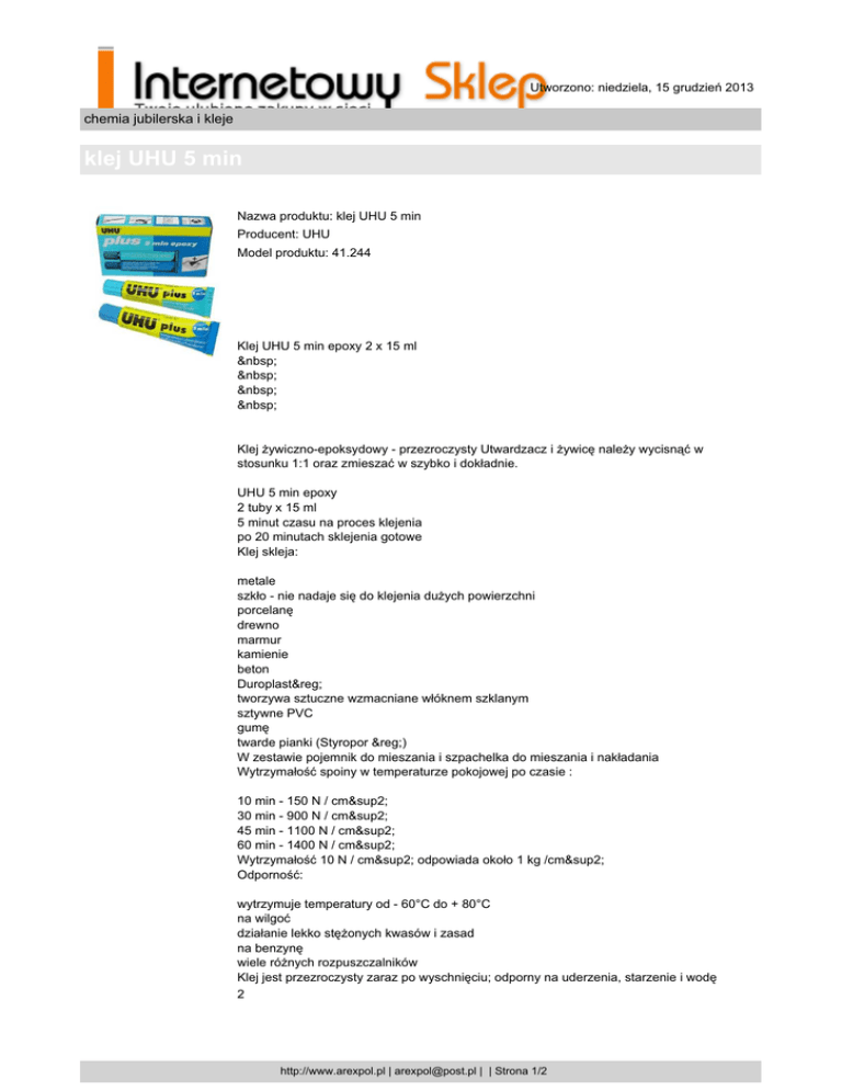 Utworzono: niedziela, 15 grudzień 2013 chemia jubilerska i kleje klej UHU 5 min Nazwa produktu: klej UHU 5 min Producent: UHU Model produktu: 41.244 Klej UHU 5 min epoxy 2 x 15 ml Klej żywiczno-epoksydowy - przezroczysty Utwardzacz i żywicę należy wycisnąć w stosunku 1:1 oraz zmieszać w szybko i dokładnie. UHU 5 min epoxy 2 tuby x 15 ml 5 minut czasu na proces klejenia po 20 minutach sklejenia gotowe Klej skleja: metale szkło - nie nadaje się do klejenia dużych powierzchni porcelanę drewno marmur kamienie beton Duroplast® tworzywa sztuczne wzmacniane włóknem szklanym sztywne PVC gumę twarde pianki (Styropor ®) W zestawie pojemnik do mieszania i szpachelka do mieszania i nakładania Wytrzymałość spoiny w temperaturze pokojowej po czasie : 10 min - 150 N / cm² 30 min - 900 N / cm² 45 min - 1100 N / cm² 60 min - 1400 N / cm² Wytrzymałość 10 N / cm² odpowiada około 1 kg /cm² Odporność: wytrzymuje temperatury od - 60°C do + 80°C na wilgoć działanie lekko stężonych kwasów i zasad na benzynę wiele różnych rozpuszczalników Klej jest przezroczysty zaraz po wyschnięciu; odporny na uderzenia, starzenie i wodę 2 http://www.arexpol.pl | [email protected] | | Strona 1/2 Utworzono: niedziela, 15 grudzień 2013 chemia jubilerska i kleje klej UHU 5 min Cena: 24.60zł z VAT (20.00zł bez VAT) Dostępność: Ten produkt został dodany do sklepu w dniu niedziela, 28 październik 2007 http://www.arexpol.pl | [email protected] | | Strona 2/2