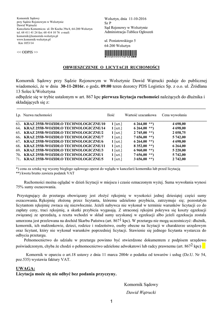 Komornik Sądowy przy Sądzie Rejonowym w Wolsztynie Dawid Wątrucki Kancelaria Komornicza ul. Dr Kocha 39a/4, 64-200 Wolsztyn tel. 68 411 41 24 fax: 68 414 10 76 e-mail: [email protected] www.komornik-wolsztyn.pl Km 1053/14 Wolsztyn, dnia 11-10-2016 Sz P Sąd Rejonowy w Wolsztynie Administracja-Tablica Ogłoszeń << ODPIS >> *0020000121238* ul. Poniatowskiego 5 64-200 Wolsztyn OBWIESZCZENIE O LICYTACJI RUCHOMOŚCI Komornik Sądowy przy Sądzie Rejonowym w Wolsztynie Dawid Wątrucki podaje do publicznej wiadomości, że w dniu 30-11-2016r. o godz. 09:00 teren dozorcy PDS Logistics Sp. z o.o. ul. Źródlana 13 Solec k/Wolsztyna odbędzie się w trybie ustalonym w art. 867 kpc pierwsza licytacja ruchomości należących do dłużnika i składających się z: ____________________________________________________________________________________________________ Lp. Nazwa ruchomości Ilość Wartość szacunkowa Cena wywołania _____________________________________________________________________________________________________ 63. KRAZ 255B-WOZIDŁO TECHNOLOGICZNE/10 1 [szt.] 6 264,00 **) 4 698,00 64. KRAZ 255B-WOZIDŁO TECHNOLOGICZNE/14 1 [szt.] 6 264,00 **) 4 698,00 65. KRAZ 255B-WOZIDŁO TECHNOLOGICZNE/2 1 [szt.] 2 745,00 **) 2 058,75 66. KRAZ 255B-WOZIDŁO TECHNOLOGICZNE/7 1 [szt.] 7 656,00 **) 5 742,00 67. KRAZ 255B-WOZIDŁO TECHNOLOGICZNE/6 1 [szt.] 6 264,00 **) 4 698,00 68. KRAZ 255B-WOZIDŁO TECHNOLOGICZNE/11 1 [szt.] 8 352,00 **) 6 264,00 69. KRAZ 255B-WOZIDŁO TECHNOLOGICZNE/3 1 [szt.] 6 960,00 **) 5 220,00 70. KRAZ 255B-WOZIDŁO TECHNOLOGICZNE/1 1 [szt.] 7 656,00 **) 5 742,00 71. KRAZ 255B-WOZIDŁO TECHNOLOGICZNE/5 1 [szt.] 3 656,00 **) 2 742,00 _______________________________________________________________________________________________________________________ *) cena za sztukę wg wyceny biegłego sądowego operat do wglądu w kancelarii komornika lub przed licytacją **) kwota brutto zawiera podatek VAT Ruchomości można oglądać w dzień licytacji w miejscu i czasie oznaczonym wyżej. Suma wywołania wynosi 75% sumy oszacowania. Przystępujący do przetargu obowiązany jest złożyć rękojmię w wysokości jednej dziesiątej części sumy oszacowania. Rękojmię złożoną przez licytanta, któremu udzielono przybicia, zatrzymuje się; pozostałym licytantom rękojmię zwraca się niezwłocznie. Jeżeli nabywca nie wykonał w terminie warunków licytacji co do zapłaty ceny, traci rękojmię, a skutki przybicia wygasają. Z utraconej rękojmi pokrywa się koszty egzekucji związanej ze sprzedażą, a reszta wchodzi w skład sumy uzyskanej w egzekucji albo jeżeli egzekucja została umorzona jest przelewana na dochód Skarbu Państwa (art. 8671 kpc). W przetargu nie mogą uczestniczyć: dłużnik, komornik, ich małżonkowie, dzieci, rodzice i rodzeństwo, osoby obecne na licytacji w charakterze urzędowym oraz licytant, który nie wykonał warunków poprzedniej licytacji. Stawienie się jednego licytanta wystarcza do odbycia przetargu. Pełnomocnictwo do udziału w przetargu powinno być stwierdzone dokumentem z podpisem urzędowo poświadczonym, chyba że chodzi o pełnomocnictwo udzielone adwokatowi lub radcy prawnemu (art. 8672 kpc) Komornik w oparciu o art.18 ustawy z dnia 11 marca 2004r o podatku od towarów i usług (Dz.U. Nr 54, poz.535) wystawia faktury VAT. UWAGA: Licytacja może się nie odbyć bez podania przyczyny. Komornik Sądowy Dawid Wątrucki 1 Adresat oryginału: dłużnik Do wiadomości: 1. r. pr. Patrycja Rudnik Kancelaria Radcy Prawnego, 77-400 Złotów 2. Sąd Rejonowy w Wolsztynie Administracja-Tablica Ogłoszeń, 64-200 Wolsztyn 3. BANK BGŻ BNP PARIBAS S.A., Warszawa, 01-211 Warszawa 4. adw. Żanna Dembska Kancelaria Adwokacka, 61-806 Poznań 5. Bank Polska Kasa Opieki S.A. w Warszawie Terenowy Zespół Deprtamentu Kredytów Trudnych w Poznaniu, 61-807 Poznań 6. adw. Jarosław Smolarek Kancelaria Prawna FIELD J. Smolarek sp. k., 42-200 Częstochowa 7. r. pr. Marta Czternastek Koksztys Kancelaria Prawa Gospodarczego Spółka komandytowa, 54-513 Wrocław 8. PDS LOGISTICS SP. Z O.O., Solec, 64-234 Przemęt 9. Urząd Skarbowy w Grodzisku Wlkp., 62-065 Grodzisk Wlkp. 10. GETIN Noble Bank S.A. Departament Postępowania Sądowego i Egzekucyjnego Zespół Monitorowania i Sprzedaży Zabezpiec, 53-413 Wrocław 11. a/a 2