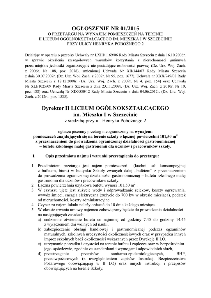 OGŁOSZENIE NR 01/2015 O PRZETARGU NA WYNAJEM POMIESZCZEŃ NA TERENIE II LICEUM OGÓLNOKSZTAŁCACEGO IM. MIESZKA I W SZCZECINIE PRZY ULICY HENRYKA POBOŻNEGO 2 Działając w oparciu o przepisy Uchwały nr LXIII/1169/06 Rady Miasta Szczecin z dnia 16.10.2006r. w sprawie określenia szczegółowych warunków korzystania z nieruchomości gminnych przez miejskie jednostki organizacyjne nie posiadające osobowości prawnej (Dz. Urz. Woj. Zach. z 2006r. Nr 108, poz. 2078), zmienionej Uchwałą Nr XII/344/07 Rady Miasta Szczecin z dnia 30.07.2007r. (Dz. Urz. Woj. Zach. z 2007r. Nr 95, poz. 1677), Uchwałą nr XXX/749/08 Rady Miasta Szczecin z 18.12.2008r. (Dz. Urz. Woj. Zach. z 2009r. Nr 4, poz. 154) oraz Uchwałą Nr XLI/1025/09 Rady Miasta Szczecin z dnia 23.11.2009r. (Dz. Urz. Woj. Zach. z 2010r. Nr 10, poz. 188) oraz Uchwałą Nr XIX/530/12 Rady Miasta Szczecin z dnia 04.06.2012r. (Dz. Urz. Woj. Zach. z 2012r., poz. 1535). Dyrektor II LICEUM OGÓLNOKSZTAŁCĄCEGO im. Mieszka I w Szczecinie z siedzibą przy ul. Henryka Pobożnego 2 ogłasza pisemny przetarg nieograniczony na wynajem: pomieszczeń znajdujących się na terenie szkoły o łącznej powierzchni 101,50 m2 z przeznaczeniem do prowadzenia ograniczonej działalności gastronomicznej – bufetu szkolnego małej gastronomii dla uczniów i pracowników szkoły. I. Opis przedmiotu najmu i warunki przystąpienia do przetargu: 1. Przedmiotem przetargu jest najem pomieszczeń (kuchni, sali konsumpcyjnej z bufetem, biura) w budynku Szkoły zwanych dalej „bufetem” z przeznaczeniem do prowadzenia ograniczonej działalności gastronomicznej – bufetu szkolnego małej gastronomii dla uczniów i pracowników szkoły. 2. Łączna powierzchnia użytkowa bufetu wynosi 101,50 m2 . 3. W czynszu ujęte jest zużycie wody i odprowadzanie ścieków, koszty ogrzewania, wywóz śmieci, energia elektryczna (zużycie do 700 kw w okresie miesiąca), podatek od nieruchomości, koszty administracyjne. 4. Czynsz za najem lokalu należy opłacać do 10 dnia każdego miesiąca. 5. W okresie trwania umowy najemca zobowiązany będzie do prowadzenia działalności na następujących zasadach: a) codzienne otwieranie bufetu co najmniej od godziny 7.45 do godziny 14.45 z wyłączeniem dni wolnych od nauki, b) zabezpieczenie obsługi handlowej i gastronomicznej podczas egzaminów maturalnych, szkolnych uroczystości okolicznościowych oraz w przypadku innych imprez szkolnych bądź okoliczności wskazanych przez Dyrekcję II LO, c) utrzymanie porządku i czystości na terenie bufetu i zaplecza oraz w bezpośrednim jego sąsiedztwie, zgodnie ze standardami i wymogami odpowiednich służb, d) przestrzeganie przepisów sanitarno-epidemiologicznych, BHP, przeciwpożarowych (z uwzględnieniem zapisów Instrukcji Bezpieczeństwa Pożarowego obowiązującej w II LO) oraz innych instrukcji i przepisów obowiązujących na terenie Szkoły, e) prowadzona działalność musi być zgodna z obowiązującym prawem w tym zakresie, czyli uwzględniać zapisy Rozporządzenia Ministra Zdrowia w sprawie grup środków spożywczych przeznaczonych do sprzedaży dzieciom i młodzieży w jednostkach systemu oświaty oraz wymagań, jakie muszą spełniać środki spożywcze stosowane w ramach żywienia zbiorowego dzieci i młodzieży w tych jednostkach wydanego na podstawie art. 52c ust. 6 ustawy z dnia 25 sierpnia 2006 r. o bezpieczeństwie żywności i żywienia (Dz. U. z 2015 r. poz. 594). f) w bufecie mogą również być sprzedawane artykuły szkolne , np. zeszyty, długopisy, ołówki linijki itp. 6. Orientacyjna ilość uczniów i pracowników szkoły to ok. 900 osób. II. Warunki przetargu. 1. Oferta winna być złożona na piśmie w siedzibie II LO w sekretariacie szkoły w zamkniętej i opisanej kopercie: „Nie otwierać przed dniem 04 sierpnia 2015 r . do godz. 1200”. 2. Termin składania ofert – do dnia 04 sierpnia 2015 r . do godz. 1200. 3. Otwarcie ofert nastąpi w dniu 04 sierpnia 2015 r . o godz. 1215 w siedzibie II Liceum Ogólnokształcącego im. Mieszka I w Szczecinie w sekretariacie szkoły. 4. W celu uzyskania dodatkowych informacji dotyczących przetargu, zapoznania się ze stanem technicznym pomieszczeń proszę kontaktować się z działem administracji II LO pod numerem telefonu: 91 433 81 64 w godzinach od 9.00 do 14.00. 5. Minimalna stawka czynszu netto w zł/m2 najmu za miesiąc: - kwota ……….. (słownie: …………………) Do podanych cen doliczony zostanie podatek VAT w wysokości zgodnej z obowiązującymi przepisami. Minimalne postąpienie 5% ceny wywoławczej. 6. Wynajem pomieszczeń może dotyczyć prowadzenia działalności nie mającej negatywnego wpływu na działanie Szkoły. 7. Do oferty należy załączyć: 1. wypełniony kompletnie Formularz Ofertowy - (Załącznik Nr 1 do Ogłoszenia Nr 01/2015), 2. dokumenty: kserokopie zaświadczenia o wpisie do ewidencji działalności gospodarczej lub wyciąg z rejestru KRS, kserokopie decyzji o nadaniu NIP i REGON, kserokopia dowodu osobistego w przypadku osób fizycznych, zaświadczenie z ZUS-u o nie zaleganiu w opłacaniu składek ( ważne 90 dni), zaświadczenie z Urzędu Skarbowego o nie zaleganiu w zobowiązaniach podatkowych (ważne 90 dni), zaświadczenie o nie zaleganiu z opłatami wobec Gminy Miasto Szczecin (podatek od nieruchomości, wieczyste użytkowanie gruntu z tytułu czynszu lub dzierżawy) wydane maks. na 30 dni przed przetargiem. 8. Składana oferta winna zostać podpisana przez osobę uprawnioną do reprezentacji podmiotu. 9. Przed przystąpieniem do przetargu należy zapoznać się z tekstem umowy najmu, który nie podlega negocjacjom. Stanowi on załącznik do niniejszego Ogłoszenia. Złożenie swojej oferty w przetargu jest jednoznaczne z akceptacją treści umowy. Istnieje możliwość dodatkowych zapisów, na które strony wyrażą zgodę. 10. Kryterium wyboru oferty stanowić będzie zaproponowana najwyższa stawka czynszu netto w złotych za m2 najmu za miesiąc. Wy