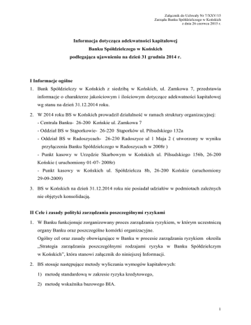 Załącznik do Uchwały Nr 7/XXV/15 Zarządu Banku Spółdzielczego w Końskich z dnia 26 czerwca 2015 r. Informacja dotycząca adekwatności kapitałowej Banku Spółdzielczego w Końskich podlegająca ujawnieniu na dzień 31 grudnia 2014 r. I Informacje ogólne 1. Bank Spółdzielczy w Końskich z siedzibą w Końskich, ul. Zamkowa 7, przedstawia informacje o charakterze jakościowym i ilościowym dotyczące adekwatności kapitałowej wg stanu na dzień 31.12.2014 roku. 2. W 2014 roku BS w Końskich prowadził działalność w ramach struktury organizacyjnej: - Centrala Banku- 26-200 Końskie ul. Zamkowa 7 - Oddział BS w Stąporkowie- 26-220 Stąporków ul. Piłsudskiego 132a - Oddział BS w Radoszycach- 26-230 Radoszyce ul 1 Maja 2 ( utworzony w wyniku przyłączenia Banku Spółdzielczego w Radoszycach w 2008r ) - Punkt kasowy w Urzędzie Skarbowym w Końskich ul. Piłsudskiego 156b, 26-200 Końskie ( uruchomiony 01-07- 2008r) - Punkt kasowy w Końskich ul. Spółdzielcza 8b, 26-200 Końskie (uruchomiony 29-09-2009) 3. BS w Końskich na dzień 31.12.2014 roku nie posiadał udziałów w podmiotach zależnych nie objętych konsolidacją. II Cele i zasady polityki zarządzania poszczególnymi ryzykami 1. W Banku funkcjonuje zorganizowany proces zarządzania ryzykiem, w którym uczestniczą organy Banku oraz poszczególne komórki organizacyjne. Ogólny cel oraz zasady obowiązujące w Banku w procesie zarządzania ryzykiem określa „Strategia zarządzania poszczególnymi rodzajami ryzyka w Banku Spółdzielczym w Końskich”, która stanowi załącznik do niniejszej Informacji. 2. BS stosuje następujące metody wyliczania wymogów kapitałowych: 1) metodę standardową w zakresie ryzyka kredytowego, 2) metodę wskaźnika bazowego BIA. 1 2. Bank uznał ryzyka za istotne w działalności Banku. Podlegają one szczególnemu nadzorowi. Zgodnie z Uchwałą Zarządu Nr 6/IV/14 z dnia 20 lutego 2014 r. zalicza się do nich: 1) ryzyko kredytowe, 2) ryzyko rynkowe, 3) ryzyko operacyjne, 4) ryzyko koncentracji zaangażowań, 5) ryzyko progu koncentracji kapitałowej, 6) ryzyko koncentracji branżowej, 7) ryzyko koncentracji przyjętych form zabezpieczenia, 8) ryzyko koncentracji zaangażowań w jednorodny instrument finansowy, 9) ryzyko stopy procentowej w księdze bankowej, 10) ryzyko płynności, 11) ryzyko braku zgodności, 12) ryzyko wyniku finansowego. Szczegółowy opis procesów zarządzania ryzykiem zawierają Instrukcje zarządzania poszczególnymi ww. ryzykami oraz Instrukcja sporządzania i monitorowania planów strategicznych oraz planu ekonomiczno – finansowego Banku Spółdzielczego w Końskich. Informacje dotyczące : procesów zarządzania poszczególnymi rodzajami ryzyka, identyfikacji, przyjętych przez Bank rozwiązań organizacyjnych w procesie zarządzania ryzykami, systemów pomiaru, monitorowania i raportowania ryzyk, zasad polityki stosowania zabezpieczeń i ograniczania ryzyka oraz procesów monitorowania skuteczności zabezpieczeń i metod redukcji ryzyka, zawierają regulacje zatwierdzone przez odpowiednie organy Banku – instrukcje i polityki zarządzania następującymi rodzajami ryzyk: 1) Ryzyko kredytowe 2) Ryzyko płynności 2 3) Ryzyko operacyjne 4) Ryzyko stopy procentowej 5) Ryzyko walutowe 6) Ryzyko kapitałowe 7) Ryzyko braku zgodności 8) Ryzyko angażowania środków w inwestycje finansowe 9) Ryzyko wyniku finansowego 3. Podstawowe zadania organów Banku w zakresie zarządzania ryzykiem zostały określone w „Strategii zarządzania poszczególnymi rodzajami ryzyka w Banku Spółdzielczym w Końskich”. W procesie zarządzania ryzykiem w Banku uczestniczą następujące organy i komórki organizacyjne: Rada Nadzorcza – poziom nadzorczy, Zarząd Banku- poziom zarządczy, Zespół ryzyk i analiz ekonomicznych – poziom analityczny, Stanowisko ds. kontroli wewnętrznej – poziom kontrolny, Pozostali pracownicy i komórki organizacyjne Banku – poziom operacyjny. 4. Wyodrębniony w strukturze organizacyjnej Banku Zespół ryzyk i analiz ekonomicznych, na dzień 31.12.2014 roku obejmował swoim zakresem działania monitorowanie poszczególnych rodzajów ryzyk. III Fundusze własne 1. Fundusze własne ujmowane są w księgach rachunkowych z podziałem na fundusze podstawowe i fundusze uzupełniające. Fundusze podstawowe obejmują : - wpłacony fundusz udziałowy, - fundusz zasobowy tworzony z odpisów z zysku, - fundusz rezerwowy tworzony z odpisów z zysku, - pozycje dodatkowe funduszy podstawowych: - fundusz ogólnego ryzyka na niezidentyfikowane ryzyko działalności bankowej, - zysk w trakcie zatwierdzenia, - pozycje pomniejszające fundusze podstawowe: 3 - wartości niematerialne i prawne w kwocie netto. Fundusze uzupełniające obejmują: - fundusz z aktualizacji majątku trwałego. 2. Poniższe zestawienie przedstawia poziom poszczególnych pozycji funduszy własnych Banku według stanu na dzień 31.12.2014 roku w zł. Wyszczególnienie Fundusze podstawowe Kwota 14.764.521,84 fundusze zasadnicze fundusz udziałowy 443.900,00 fundusz zasobowy 14.250.421,84 fundusz rezerwowy 50.200,00 pozycje dodatkowe funduszy podstawowych niepodzielony zysk z lat ubiegłych fundusz ogólnego ryzyka bankowego 20.000,00 zysk w trakcie zatwierdzania oraz zysk netto bieżącego okresu sprawozdawczego (pomniejszone o przewidywane obciążenia i 1.140.986,07 dywidendy) inne pozycje bilansu Banku, określone przez KNF pozycje pomniejszające fundusze podstawowe wartości niematerialne i prawne 16.260,91 niepodzielona strata z lat ubiegłych strata na koniec okresu sprawozdawczego strata w trakcie zatwierdzania inne pomniejszenia funduszy podstawowych, określone przez KNF pozycje pomniejszające fundusze podstawowe 0 brakująca kwota rezerw celowych inwestycje kapitałowe w podmiotach finansowych Fundusze uzupełniające fundusz z aktualizacji majątku trwałego 23.979,10 zobowiązania podporządkowane fundusze tworzone ze środków własnych lub obcych zobowiązan