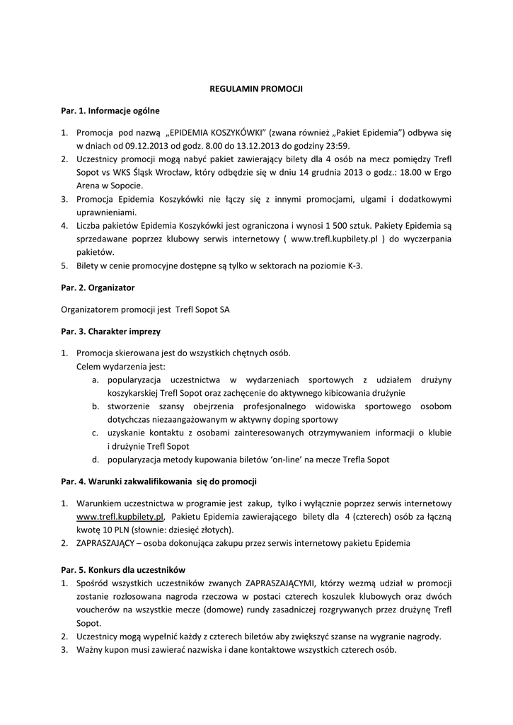 REGULAMIN PROMOCJI Par. 1. Informacje ogólne 1. Promocja pod nazwą „EPIDEMIA KOSZYKÓWKI” (zwana również „Pakiet Epidemia”) odbywa się w dniach od 09.12.2013 od godz. 8.00 do 13.12.2013 do godziny 23:59. 2. Uczestnicy promocji mogą nabyć pakiet zawierający bilety dla 4 osób na mecz pomiędzy Trefl Sopot vs WKS Śląsk Wrocław, który odbędzie się w dniu 14 grudnia 2013 o godz.: 18.00 w Ergo Arena w Sopocie. 3. Promocja Epidemia Koszykówki nie łączy się z innymi promocjami, ulgami i dodatkowymi uprawnieniami. 4. Liczba pakietów Epidemia Koszykówki jest ograniczona i wynosi 1 500 sztuk. Pakiety Epidemia są sprzedawane poprzez klubowy serwis internetowy ( www.trefl.kupbilety.pl ) do wyczerpania pakietów. 5. Bilety w cenie promocyjne dostępne są tylko w sektorach na poziomie K-3. Par. 2. Organizator Organizatorem promocji jest Trefl Sopot SA Par. 3. Charakter imprezy 1. Promocja skierowana jest do wszystkich chętnych osób. Celem wydarzenia jest: a. popularyzacja uczestnictwa w wydarzeniach sportowych z udziałem drużyny koszykarskiej Trefl Sopot oraz zachęcenie do aktywnego kibicowania drużynie b. stworzenie szansy obejrzenia profesjonalnego widowiska sportowego osobom dotychczas niezaangażowanym w aktywny doping sportowy c. uzyskanie kontaktu z osobami zainteresowanych otrzymywaniem informacji o klubie i drużynie Trefl Sopot d. popularyzacja metody kupowania biletów ‘on-line’ na mecze Trefla Sopot Par. 4. Warunki zakwalifikowania się do promocji 1. Warunkiem uczestnictwa w programie jest zakup, tylko i wyłącznie poprzez serwis internetowy www.trefl.kupbilety.pl, Pakietu Epidemia zawierającego bilety dla 4 (czterech) osób za łączną kwotę 10 PLN (słownie: dziesięć złotych). 2. ZAPRASZAJĄCY – osoba dokonująca zakupu przez serwis internetowy pakietu Epidemia Par. 5. Konkurs dla uczestników 1. Spośród wszystkich uczestników zwanych ZAPRASZAJĄCYMI, którzy wezmą udział w promocji zostanie rozlosowana nagroda rzeczowa w postaci czterech koszulek klubowych oraz dwóch voucherów na wszystkie mecze (domowe) rundy zasadniczej rozgrywanych przez drużynę Trefl Sopot. 2. Uczestnicy mogą wypełnić każdy z czterech biletów aby zwiększyć szanse na wygranie nagrody. 3. Ważny kupon musi zawierać nazwiska i dane kontaktowe wszystkich czterech osób. 4. Po odbiór nagrody muszą zgłosić się wszystkie cztery osoby których nazwiska znalazły się na kuponie oraz odpowiedzieć na pytanie jakie miasto jest siedzibą naszego klubu. 5. Losowanie odbędzie się w długiej przerwie meczu Trefl Sopot - WKS Śląska Wrocław w dniu 14.12.2013. Par. 6. Obowiązki uczestników promocji 1. Zakup pakietu Epidemia zwierającego cztery bilety jest równoznaczne z deklaracją obecności na meczu Trefl Sopot – WKS Śląsk Wrocław czterech osób. 2. Uczestnik zobowiązany jest do wypełnienia na wydrukowanym bilecie elektronicznym danych osób korzystających z zakupu promocyjnego: a. Imię i Nazwisko b. Wiek c. Kontakt e-mailowy d. Zawód / wykonywane zajęcie 3. Uczestnik zobowiązany jest do : a. Wejścia na widowisko sportowe poprzez specjalnie wydzielone i oznakowane wejście b. Wrzucenia do dedykowanej urny, części wydruku elektronicznego biletu, zawierające dane o których mowa w par.5 pkt.2 4. Organizator zastrzega sobie prawo wykluczenia z programu uczestnika, który zagraża bezpieczeństwu innych osób lub nie stosuje się do regulaminu hali i poleceń organizatora. 5. Za wszelkie szkody wyrządzone przez uczestników programu wyłączną odpowiedzialność ponoszą uczestnicy lub ich opiekunowie ustawowi. Więcej informacji na stronie www.sport.trefl.com/koszykowka W przypadku jakichkolwiek wątpliwości prosimy o kontakt: Jarosław Piernicki: e-mail: [email protected]