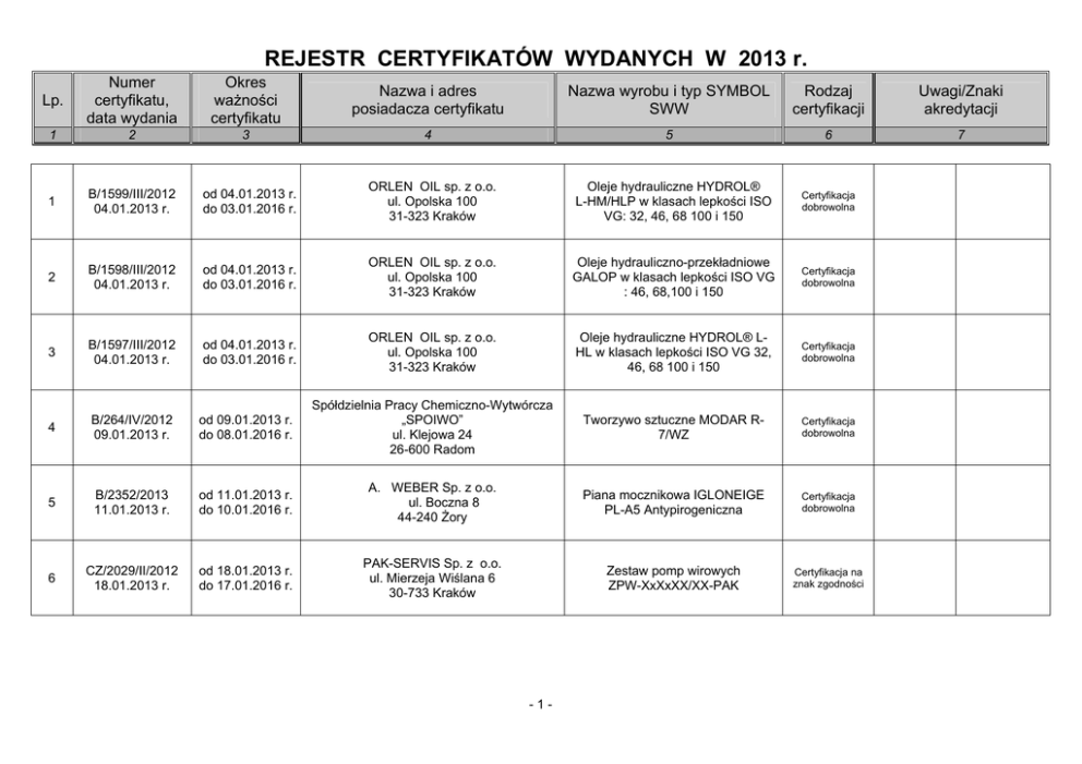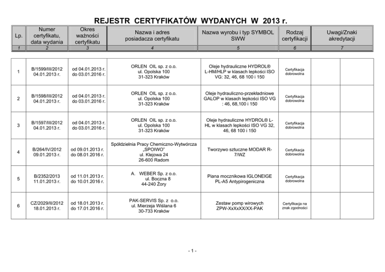 REJESTR CERTYFIKATÓW WYDANYCH W 2013 r.