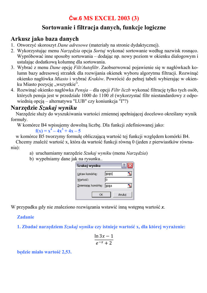 Ćw.6 MS EXCEL 2003 (3) Sortowanie i filtracja danych, funkcje logiczne Arkusz jako baza danych 1. Otworzyć skoroszyt Dane adresowe (materiały na stronie dydaktycznej). 2. Wykorzystując menu Narzędzia opcja Sortuj wykonać sortowanie według nazwisk rosnąco. Wypróbować inne sposoby sortowania – dodając np. nowy poziom w okienku dialogowym i ustalając dodatkową kolumnę dla sortowania. 3. Wybrać z menu Dane opcję Filt/Autofiltr. Zaobserwować pojawienie się w nagłówkach kolumn bazy adresowej strzałek dla rozwijania okienek wyboru algorytmu filtracji. Rozwinąć okienko nagłówka Miasto i wybrać Kraków. Powrócić do pełnej tabeli wybierając w okienku Miasto pozycję „wszystkie”. 4. Rozwinąć okienko nagłówka Pensja – dla opcji Filtr liczb wykonać filtrację tylko tych osób, których pensja jest w przedziale 1000 do 1100 zł (wykorzystać filtr niestandardowy z odpowiednią opcją – alternatywa "LUB" czy koniunkcja "I"?) Narzędzie Szukaj wyniku Narzędzie służy do wyszukiwania wartości zmiennej spełniającej docelowo określany wynik formuły. W komórce B4 wpisujemy dowolną liczbę. Dla funkcji zdefiniowanej jako: f(x) = x4 – 4x3 + 4x – 5 w komórce B5 tworzymy formułę obliczającą wartość tej funkcji względem komórki B4. Chcemy znaleźć wartość x, która da wartość funkcji równą 0 (jeden z pierwiastków równania): a) uruchamiamy narzędzie Szukaj wyniku (menu Narzędzia) b) wypełniamy dane jak na rysunku.. W przypadku gdy nie znaleziono rozwiązania wstawić inną wstępną wartość x. Zadanie 1. Zbadać narzędziem Szukaj wyniku czy istnieje wartość x, dla której wyrażenie: ln 3 ݔ− 1 ݁ ି௫ + 2 będzie miało wartość 2,53. Funkcje logiczne 1. ZADANIE: Sprawdzić czy zadana kwota mieści się w żądanym przedziale. A. W dwóch komórkach ustalamy granice przedziału: nazywamy komórki dolna i gorna. B. Wpisujemy poniżej w kolumnie kilka kwot C. Obok pierwszej kwoty Wpisujemy formułę: =JEŻELI(ORAZ(kwota>dolna; kwota<gorna) ; "tak"; "nie") D. Kopiujemy formułę do komórek poniżej – dla pozostałych kwot 2. ZADANIE: Zsumować tylko kwoty zakresu przekraczające 10 zł. Wpisać w nowym arkuszu kilka liczb w kolumnie A w formacie walutowym. Następnie w innej komórce sporządzić formułę: =SUMA . JEŻELI( zakres; ">10") Zakres to nazwa zakresu komórek lub dwa adresy komórek skrajnych zakresu oddzielone dwukropkiem. 3. ZADANIE: Obliczyć ile kwot przekracza 10 zł. Dla tego samego zakresu kwot wpisać formułę: =LICZ . JEŻELI( zakres; ">10") 4. Wykorzystać funkcje MAX i MIN do znalezienia największej i najmniejszej liczby w wypełnionym liczbami zakresie komórek. 5. Umieścić w arkuszu klika formuł dających wynik logiczny, np.: =5>4 =G5=8 =A3<>4 (różne od) Następnie utworzyć formuły z użyciem funkcji NIE, LUB, ORAZ wykorzystujące jako argumenty wyniki poprzednich formuł. Zanalizować wyniki. 6. ZADANIE: Sporządzić formuły obliczeniowe, których zadaniem jest wyznaczenie odsetek karnych dla kilku kontrahentów przy założeniu: - odsetki płacone są tylko wtedy, gdy od daty transakcji minęło do dziś więcej niż 2 tygodnie, - wysokość procentowa odsetek karnych wynosi 20% w skali roku. Wykonujemy następujące czynności: A. Umieszczamy w arkuszu datę dzisiejszą: =dziś( ) – nazwać komórkę data_dz B. Obliczamy odsetki za 1 dzień: =20%/365 ; nazwać komórkę stopa_dz C. Dla kilku kontrahentów wpisujemy w arkuszu dowolne daty z niedalekiej przeszłości, obok dowolne kwoty transakcji, D. Wykorzystujemy funkcję JEŻELI do warunkowego obliczenia odsetek w postaci: =JEŻELI(data_dz-data <= 14; 0 ; ( data_dz-data-14)*stopa_dz*kwota) UWAGA: jeżeli nie nadano nazw komórkom stopa_dz i data_dz należy użyć ich adresu bezwzględnego, np. $G$12. 7. ZADANIE: W kolejnej komórce napisać formułę: =JEŻELI(x>0; "większe od zera"; "mniejsze lub równe zero") Wstawiać do komórki A1 (nazwanej uprzednio jako x) wartości ujemne i dodatnie kolejno je zatwierdzając, obserwując wynik formuły JEŻELI. Zwrócić uwagę na zapis stałych tekstowych jako argumentów formuły (w cudzysłowie). Zanalizować postać formuły: =JEŻELI(x>0 ; "większe od zera" ; JEŻELI(x=0 ; "równe zero" ; "mniejsze od zera")) Wypróbować formułę. Zadania 1. Dla kilku osób o imionach podanych w kolumnie A wpisać ich wiek w latach w kolumnie B – dowolne liczby całkowite w przedziale (0 ; 100). 2. W kolumnie C wykonać odpowiednią klasyfikację osób do przedziału wiekowego, zakładając: wiek<= 50 – młody wiek>50 – stary. 3. W kolumnie D wykonać klasyfikację osób do jednego z czterech przedziałów: wiek<= 18 – dziecko 18>wiek>30 – młodzież 30>wiek>50 – średni wiek>50 – stary. 4. Obliczyć ile osób jest dzieckiem (wykorzystać funkcję LICZ.JEŻELI). 5. Obliczyć średnią wieku dzieci (wykorzystać funkcję SUMA.JEŻELI oraz uprzednio obliczoną liczbę dzieci).