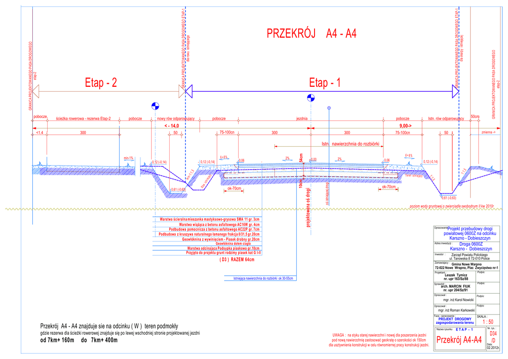 ścieżka rowerowa - rezerwa Etap-2 pobocze Etap - 1 nowy rów odparowujący pobocze jezdnia pobocze < - 14,0 <1.4 300 Istn. rów odparowujący GRANICA PROJEKTOWANEGO PASA DROGOWEGO etap-2 pobocze GRANICA PROJEKTOWANEGO PASA DROGOWEGO ETAP-1 dla skarpy istniejącej GRANICA PROJEKTOWANEGO PASA DROGOWEGO ETAP-1 dla rowu istniejącego GRANICA PROJEKTOWANEGO PASA DROGOWEGO etap-2 Etap - 2 PRZEKRÓJ A4 - A4 50cm 9,00-> 75-100cn 50 300 300 75-100cn zmienna -> 50 6÷8% 2% 2% + 0,00 6÷8% - 0,06 - 0,12 (-0,14) ,5 - 0,12 (-0,14) - 0,12 (-0,14) - 0,06 Warstwa ścieralna mieszanka mastyksowo-grysowa SMA 11 gr. 3cm Warstwa wiążąca z betonu asfaltowego AC16W gr. 4cm Podbudowa pomocnicza z betonu asfaltowego AC22P gr. 7cm Podbudowa z kruszywa naturalnego łamanego frakcja 0/31,5 gr.20cm Geowłóknina z wywinięciem - Piasek drobny gr.20cm oś istniejącej drogi projektowana oś drogi ok-70cm 10cm ieją istn Rów 0,61 (-0,63) 1:1 ,5 min cy Teren istniej ący 1:1 -1:1 ,5 min-1% 54cm Istn. nawierzchnia do rozbiórki ok-70cm - 0,61 (-0,63) poziom wody gruntowej o zwierciadle swobodnym II kw 2010r Projekt przebudowy drogi powiatowej 0600Z na odcinku Karszno - Dobieszczyn Adres inwestycji : Droga 0600Z Karszno - Dobieszczyn Opracowanie : Geowłóknina dołem ciagła Warstwa odcinająca Podsypka piaskowa gr.10cm Przyjęto do projektu grunt rodzimy piasek kat G I-II Inwestor : ( D3 ) RAZEM 64cm Zarząd Powiatu Polickiego ul. Tanowska 8 72-010 Police Zamawiajacy : Gmina Nowe Warpno 72-022 Nowe Wrapno, Plac Zwycięstwa nr-1 Projektant : Podpis: Sprawdził : Podpis: Opracował : Podpis: Leszek Tymicz nr. upr 163/Sz/88 Istniejąca nawierzchnia do rozbiórki ok 30-55cm arch. MARCIN FIUK nr. upr 204/Sz/91 mgr. inż Karol Nowicki Podpis: Opracował : mgr. inż Roman Karkowski Faza - opracowanie : PROJEKT DROGOWY zagospodarowania terenu Przekrój A4 - A4 znajduje sie na odcinku ( W ) teren podmokły gdzie rezerwa dla ścieżki rowerowej znajduje się po lewej wschodniej stronie projektowanej jezdni od 7km+ 160m do 7km+ 400m Nazwa rysunku UWAGA : na styku starej nawierzchni i nowej dla poszerzenia jezdni pod nową nawierzchnię zastosować geokratę o szerokości ok 150cm dla usztywnienia konstrukcji w celu równomiernej pracy konstrukcji jezdni. SKALA : ETAP - 1 Przekrój A4-A4 1 : 50 Nr. rys. : D34 /D Data: 02.2012r.