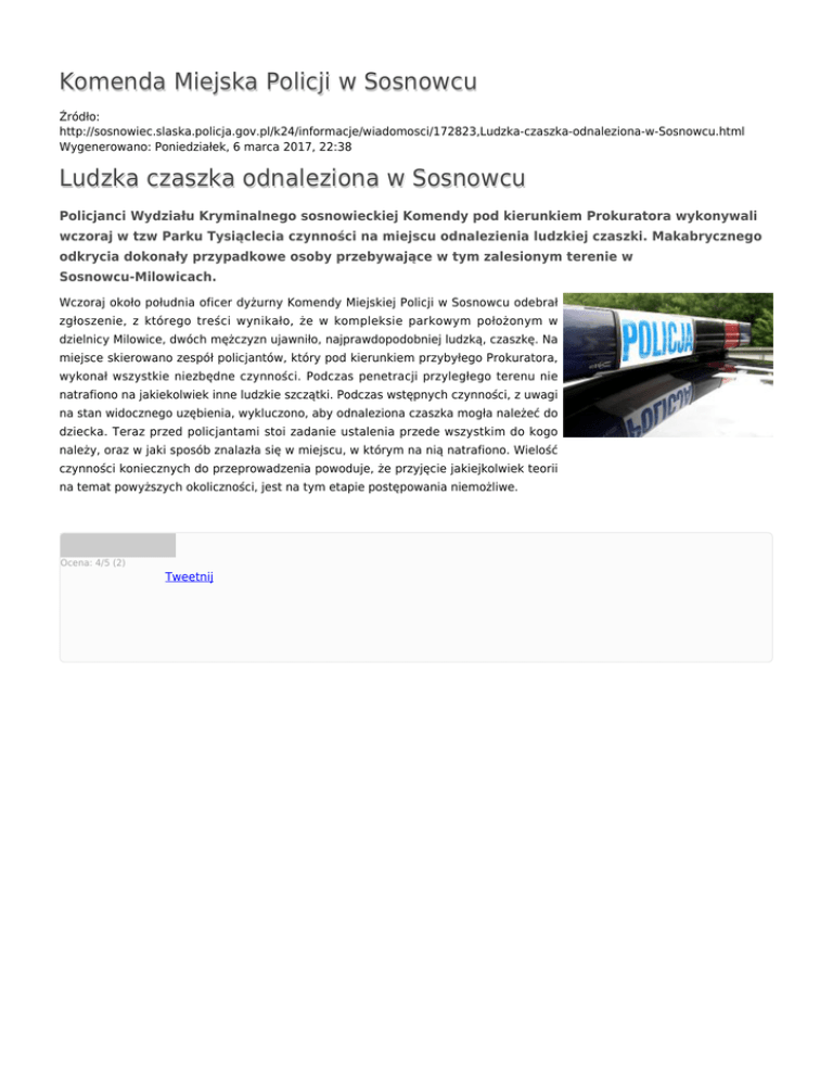 Komenda Miejska Policji w Sosnowcu Źródło: http://sosnowiec.slaska.policja.gov.pl/k24/informacje/wiadomosci/172823,Ludzka-czaszka-odnaleziona-w-Sosnowcu.html Wygenerowano: Poniedziałek, 6 marca 2017, 22:38 Ludzka czaszka odnaleziona w Sosnowcu Policjanci Wydziału Kryminalnego sosnowieckiej Komendy pod kierunkiem Prokuratora wykonywali wczoraj w tzw Parku Tysiąclecia czynności na miejscu odnalezienia ludzkiej czaszki. Makabrycznego odkrycia dokonały przypadkowe osoby przebywające w tym zalesionym terenie w Sosnowcu-Milowicach. Wczoraj około południa oficer dyżurny Komendy Miejskiej Policji w Sosnowcu odebrał zgłoszenie, z którego treści wynikało, że w kompleksie parkowym położonym w dzielnicy Milowice, dwóch mężczyzn ujawniło, najprawdopodobniej ludzką, czaszkę. Na miejsce skierowano zespół policjantów, który pod kierunkiem przybyłego Prokuratora, wykonał wszystkie niezbędne czynności. Podczas penetracji przyległego terenu nie natrafiono na jakiekolwiek inne ludzkie szczątki. Podczas wstępnych czynności, z uwagi na stan widocznego uzębienia, wykluczono, aby odnaleziona czaszka mogła należeć do dziecka. Teraz przed policjantami stoi zadanie ustalenia przede wszystkim do kogo należy, oraz w jaki sposób znalazła się w miejscu, w którym na nią natrafiono. Wielość czynności koniecznych do przeprowadzenia powoduje, że przyjęcie jakiejkolwiek teorii na temat powyższych okoliczności, jest na tym etapie postępowania niemożliwe. Ocena: 4/5 (2) Tweetnij