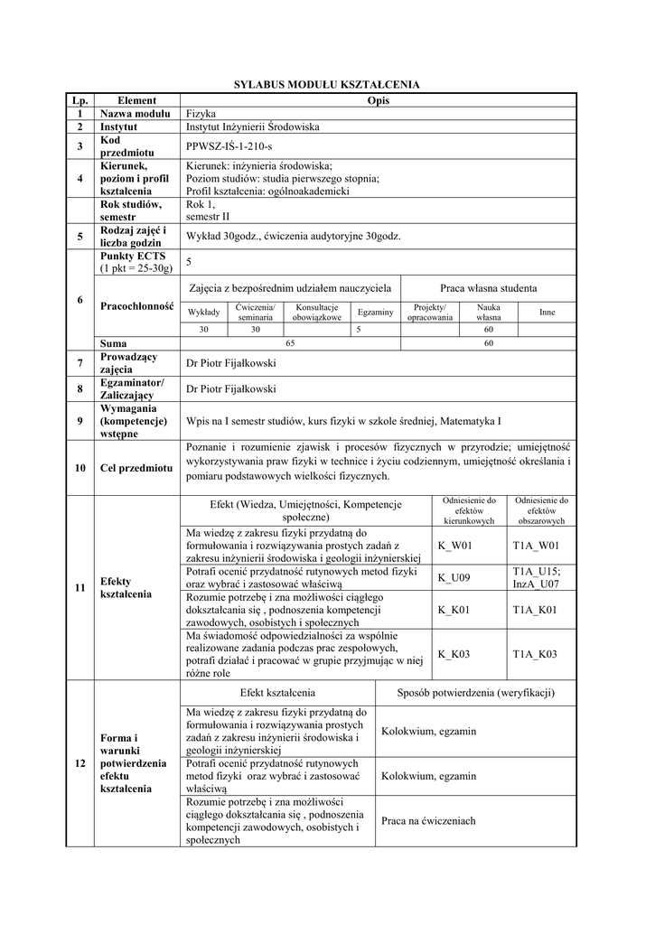 Lp. 1 2 3 4 5 Element Nazwa modułu Instytut Kod przedmiotu Kierunek, poziom i profil kształcenia Rok studiów, semestr Rodzaj zajęć i liczba godzin Punkty ECTS (1 pkt = 25-30g) SYLABUS MODUŁU KSZTAŁCENIA Opis Fizyka Instytut Inżynierii Środowiska PPWSZ-IŚ-1-210-s Kierunek: inżynieria środowiska; Poziom studiów: studia pierwszego stopnia; Profil kształcenia: ogólnoakademicki Rok 1, semestr II Wykład 30godz., ćwiczenia audytoryjne 30godz. 5 Zajęcia z bezpośrednim udziałem nauczyciela 6 Pracochłonność Wykłady 30 7 8 9 10 11 Suma Prowadzący zajęcia Egzaminator/ Zaliczający Wymagania (kompetencje) wstępne Cel przedmiotu Efekty kształcenia Ćwiczenia/ seminaria 30 Konsultacje obowiązkowe Egzaminy 12 Projekty/ opracowania 5 65 Nauka własna 60 Inne 60 Dr Piotr Fijałkowski Dr Piotr Fijałkowski Wpis na I semestr studiów, kurs fizyki w szkole średniej, Matematyka I Poznanie i rozumienie zjawisk i procesów fizycznych w przyrodzie; umiejętność wykorzystywania praw fizyki w technice i życiu codziennym, umiejętność określania i pomiaru podstawowych wielkości fizycznych. Efekt (Wiedza, Umiejętności, Kompetencje społeczne) Ma wiedzę z zakresu fizyki przydatną do formułowania i rozwiązywania prostych zadań z zakresu inżynierii środowiska i geologii inżynierskiej Potrafi ocenić przydatność rutynowych metod fizyki oraz wybrać i zastosować właściwą Rozumie potrzebę i zna możliwości ciągłego dokształcania się , podnoszenia kompetencji zawodowych, osobistych i społecznych Ma świadomość odpowiedzialności za wspólnie realizowane zadania podczas prac zespołowych, potrafi działać i pracować w grupie przyjmując w niej różne role Efekt kształcenia Forma i warunki potwierdzenia efektu kształcenia Praca własna studenta Ma wiedzę z zakresu fizyki przydatną do formułowania i rozwiązywania prostych zadań z zakresu inżynierii środowiska i geologii inżynierskiej Potrafi ocenić przydatność rutynowych metod fizyki oraz wybrać i zastosować właściwą Rozumie potrzebę i zna możliwości ciągłego dokształcania się , podnoszenia kompetencji zawodowych, osobistych i społecznych Odniesienie do efektów kierunkowych Odniesienie do efektów obszarowych K_W01 T1A_W01 K_U09 T1A_U15; InzA_U07 K_K01 T1A_K01 K_K03 T1A_K03 Sposób potwierdzenia (weryfikacji) Kolokwium, egzamin Kolokwium, egzamin Praca na ćwiczeniach 13 Treści merytoryczne przedmiotu 14 Wykaz literatury podstawowej 15 Wykaz literatury uzupełniającej (pomocniczej) Ma świadomość odpowiedzialności za wspólnie realizowane zadania podczas prac zespołowych, potrafi działać i Praca na ćwiczeniach pracować w grupie przyjmując w niej różne role 1. Podstawy mechaniki klasycznej 2. Podstawy termodynamiki 3. Elementy hydromechaniki. 4. Grawitacja. 5. Drgania i fale w ośrodkach sprężystych. 6. Elektryczne i magnetyczne właściwości materii. Fale elektromagnetyczne. Polaryzacja, interferencja i dyfrakcja fal. Elementy optyki falowej i geometrycznej. 7. Elementy akustyki, hałas. 8. Elementy fizyki ciała stałego. 9. Promieniotwórczość naturalna i sztuczna. Elementy fizyki jądrowej 1. Feynman R. P., Leighton R. B., Sands M., Feynmana wykłady z fizyki, t. 1, 2, 3. 2. Fijałkowski P., Fizyka, skrypt niepublikowany. 3. Halliday D., Resnick R., J. Walker, Podstawy fizyki t. 1, 2, 3, 4, 5. 1. 2. Cedrik L., Zbiór zadań z fizyki. Halliday D., Resnick R., Fizyka t. 1, 2.