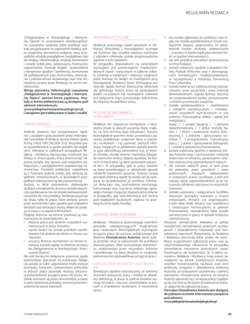 Regulamin Redakcji „Pielęgniarstwo w Anestezjologii i Intensywnej Opiece” to recenzowane interdyscyplinarne czasopismo naukowe, które publikuje artykuły przygotowane na zaproszenie redakcji, prace oryginalne, doniesienia wstępne, opisy przypadków, artykuły przeglądowe i poglądowe, listy do redakcji, rekomendacje, artykuły, komentarze i notatki redakcyjne, opracowania historyczne, wspomnienia, recenzje książek, sprawozdania z kongresów zjazdów i konferencji, komentarze do publikowanych prac, komunikaty, streszczenia z piśmiennictwa światowego oraz inne doniesienia uznane przez Redakcję za cenne merytorycznie. Wersję pierwotną (referencyjną) czasopisma „Pielęgniarstwo w Anestezjologii i Intensywnej Opiece” stanowi forma papierowa. Artykuły w formie elektronicznej są dostępne pod adresem internetowym: www.pielegniarstwoanestezjologiczne.pl Czasopismo jest indeksowane w bazie CrossRef. UWAGI OGÓLNE Artykuły powinny być przygotowane zgodnie z zasadami opracowanymi przez International Committee of Medical Journal Editors (patrz N Eng J Med 1997;336:309–315). Wszystkie prace są publikowane w języku polskim lub angielskim. Jednakże w niektórych przypadkach Redakcja i Wydawca dopuszczają możliwość publikacji w innym języku. Praca powinna być napisana zwięźle, bez zarzutu pod względem stylistycznym, z uwzględnieniem poprawnego nazewnictwa. Poprawki redakcyjne uzgadniane są z Autorami jedynie wtedy, gdy dotyczą zagadnień merytorycznych; w pozostałych przypadkach dokonywane są bez porozumienia. Autorzy w liście przewodnim zobowiązani są złożyć oświadczenie, że praca nie była dotychczas publikowana i że nie została skierowana jednocześnie do innej redakcji. Redakcja przyjmuje do druku tylko te prace, które zostaną uznane przez recenzentów jako zgodne pod względem tematyki oraz wnoszące istotny wkład do postępu w nauce i w aspekcie klinicznym. Podpisy Autorów na stronie tytułowej są równoznaczne ze stwierdzeniem, że: • złożona praca jest dziełem wszystkich wymienionych w pracy Autorów; • wyniki badań nie zostały przedtem opublikowane lub złożone do druku w innym czasopiśmie; • wszyscy Autorzy wymienieni na stronie tytułowej wyrazili zgodę na złożenie tej pracy do „Pielęgniarstwa w Anestezjologii i Intensywnej Opiece”. Nie jest konieczne dołączanie pisemnej zgody kierowników placówek na publikację. Redakcja uznaje, że takie uzgodnienie miało miejsce pomiędzy Autorami i kierownikami jednostek, w których praca powstała. Autorzy otrzymują potwierdzenie przyjęcia pracy do oceny. Artykuły oceniane są przez recenzentów, a także, w razie zaistnienia potrzeby, również przez konsultanta do spraw statystyki. © Evereth Publishing, 2016 konwencje etyczne Redakcja przestrzega zasad zawartych w Deklaracji Helsińskiej i bezwzględnie wymaga od Autorów, aby wszelkie badania wykonane z udziałem człowieka zostały przeprowadzone zgodnie z tymi zasadami. W przypadku doświadczeń na zwierzętach wymogiem jest przestrzeganie międzynarodowych zasad i wytycznych w zakresie udziału zwierząt w badaniach i edukacji, wydanych przez Komisję ds. Badań na Zwierzętach przy Nowojorskiej Akademii Nauk. Wymagana jest również zgoda komisji bioetycznej właściwej dla głównego Autora pracy na prowadzenie badań na ludziach lub zwierzętach. Zalecane jest dołączenie kopii powyższego dokumentu do złożonej do publikacji pracy. Poufność informacji o pacjencie Redakcja nie dopuszcza manipulacji i nanoszenia zmian w danych pacjenta, które miałyby na celu ochronę jego tożsamości. Autorzy bezwzględnie powinni strzec prywatności pacjenta, publikować wyłącznie dane o znaczeniu naukowym i nie ujawniać żadnych informacji mogących w jakikolwiek sposób pomóc w jego identyfikacji personalnej (np. nr historii choroby, inicjały imienia i nazwiska, fotografia wizerunku twarzy, zdjęcia wyników, na których umieszczone są dane personalne pacjenta etc.). W przypadku, gdy w pracy zawarte są dane umożliwiające w jakikolwiek sposób ustalenie tożsamości pacjenta, Autorzy muszą posiadać pisemną zgodę tej osoby lub jej opiekuna na opublikowanie jej wyników. Informacje dotyczące rasy, pochodzenia etnicznego, kulturowego oraz wyznania religijnego opisanego chorego mogą być dopuszczalne jedynie w przypadku, gdy taka informacja jest istotna pod względem naukowym, wpływa na przebieg leczenia bądź choroby. Oświadczenie autorów Redakcja i Wydawca przestrzegają wszelkich procedur zabezpieczających oryginalność prac naukowych. Bezwzględnym wymogiem przyjęcia pracy do procesu redakcyjnego jest złożenie Oświadczenia Autorów, które należy przesłać wraz ze zgłoszonym do publikacji manuskryptem. Brak powyższego dokumentu, podpisanego przez wszystkich Autorów i przesłanego na adres Redakcji w oryginale, jednoznacznie dyskwalifikuje przyjęcie pracy. Oświadczenie ma następujące brzmienie: Niniejszym zgodnie oświadczamy, że jesteśmy Autorami powyższej pracy i solidarnie składamy deklarację, iż praca ta spełnia wszelkie wymogi formalne i etyczne, przewidziane w pracach o charakterze naukowym. A mianowicie praca: 1. nie została zgłoszona do publikacji oraz nigdy nie została opublikowana w innym czasopiśmie, książce, opracowaniu (w jakiejkolwiek formie: drukiem, elektronicznie – w postaci e-booka bądź jako element treści w zasobie internetowym); 2. nie jest poddana procesowi recenzyjnemu w innej Redakcji; 3. została wykonana zgodnie z zasadami Dobrej Praktyki Klinicznej oraz z obowiązującymi konwencjami międzynarodowymi, w szczególności z Helsińską Konwencją Praw Człowieka; 4. została wykonana z należytą troską o poszanowanie praw pacjentów i praw zwierząt doświadczalnych (zgoda komisji etycznej na przeprowadzenie badań, poszanowanie i ochrona prywatności pacjenta); 5. została przeprowadzona i zrealizowana z udziałem merytorycznym i intelektual