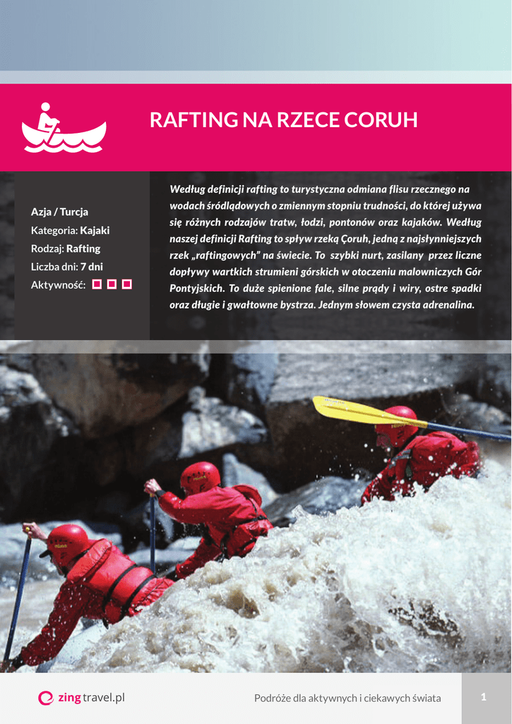 RAFTING NA RZECE CORUH Według definicji rafting to turystyczna odmiana flisu rzecznego na Azja / Turcja Kategoria: Kajaki Rodzaj: Rafting Liczba dni: 7 dni Aktywność: wodach śródlądowych o zmiennym stopniu trudności, do której używa się różnych rodzajów tratw, łodzi, pontonów oraz kajaków. Według naszej definicji Rafting to spływ rzeką Çoruh, jedną z najsłynniejszych rzek „raftingowych” na świecie. To szybki nurt, zasilany przez liczne dopływy wartkich strumieni górskich w otoczeniu malowniczych Gór Pontyjskich. To duże spienione fale, silne prądy i wiry, ostre spadki oraz długie i gwałtowne bystrza. Jednym słowem czysta adrenalina. zing travel.pl Podróże dla aktywnych i ciekawych świata 1 Rafting na rzece Coruh Trochę fal i piany na dobry początek Dzień 1 Dzień 3 Warszawa – Erzurum - Maden Ispir – Camlikaya (długość trasy – ok. 25km) Zbiórka na lotnisku w Warszawie. Przelot do Erzurum z przesiadką w Istambule. Po wylądowaniu formalności wizowe na lotnisku, spotkanie z przedstawicielem lokalnego kontrahenta i ok. 3-godzinny transfer do Maden, skąd rozpocznie się spływ. Kolacja i nocleg w obozowisku. Dzień 2 Maden – Ispir (długość trasy – ok. 23km) Po śniadaniu, krótkie zapoznanie się z trasą raftingu oraz procedurami bezpieczeństwa i rozpoczęcie spływu do miejscowości Ispir (klasa trudności odcinka II i III – średnio trudna - nurt trochę szybszy niż w klasie I i niewielkie fale na całym odcinku rzeki. Można spotkać niewielkie przeszkody w postaci skał lub krzaków co wymaga od załogi większego zgrania i umiejętności manewrowania). Wieczorem, po zakończeniu spływu czas wolny. Zachęcamy do zwiedzenia miasteczka Ispir z urokliwym zameczkiem. Następnie kolacja i nocleg. zing travel.pl Po śniadaniu kolejny dzień spływu – dzisiejsza trasa rozpoczyna się w spektakularnym kanionie. „Białe Konie” czy „Koszmar” to tylko niektóre z groźnie brzmiących nazw progów, które dzisiaj pokonamy (klasa trudności odcinka III i IV - trudna - szybki nurt, więcej fal, piana, niewielkie spadki i coraz więcej przeszkód, skały, wiry i bystrza z przejściami, wymagające umiejętności manewrowania i wiosłowania). Po zakończeniu spływu, kolacja i nocleg w obozowisku na terenie urokliwego sadu w Camlikaya. Dzień 4 Camlikaya – Tekkale (długość trasy – ok. 40km) Kolejny, najdłuższy dzień raftingu prowadzi coraz szybszym odcinkiem rzeki Coruh, zasilanej przez liczne dopływy wartkich strumieni górskich, w otoczeniu malowniczych wzgórz Gór Pontyjskich i tarasowych pól uprawnych (klasa trudności odcinka IV i V - bardzo trudna - silny nurt, duże fale, często niewidoczne skały. Rzeki kręte, z długimi bystrzami i ostrymi spadkami). Kolacja i nocleg w obozowisku w wiosce Tekkale. Ważne informacje: do Turcji wymagana jest wiza (15 EUR lub 20 USD) wiza wydawana jest na lotnisku w Turcji na podstawie paszportu (paszport musi być ważny min. 6 miesięcy od planowanej daty wylotu z Turcji) Podróże dla aktywnych i ciekawych świata Podróże dla aktywnych i ciekawych świata 2 2 Rafting na rzece Coruh Uff, płyniemy dalej... Próg „Białe Konie” Dzień 5 Tekkale - Yusufeli (długość trasy – ok. 15km) W dniu dzisiejszym zaplanowany jest spływ w górę jednego z dopływów rzeki Coruh – rzeką Barhal. Trasa prowadzi krystalicznymi, rwącymi wodami rzeki o charakterze górskiego potoku, w kierunków malowniczych krajobrazów gór Altiparmak (klasa trudności odcinka III i IV - trudna - szybki nurt, więcej fal, piana, niewielkie spadki i coraz więcej przeszkód, skały, wiry i bystrza z przejściami, wymagające umiejętności manewrowania i wiosłowania). Wieczorem przewidziana jest wspólna kolacja w lokalnej tawernie w Yusufeli. Nie ma czasu na podziwianie krajobrazu ści technicznych. Tasa obfituje w długie i gwałtowne bystrza następujące jeden po drugim, duże i liczne skały, silne prądy związane z dużymi spadkami). Po zakończeniu raftingu, transfer do Erzurum i wieczorny przelot do Istambułu. Po wylądowaniu, spotkanie z przedstawicielem lokalnego kontrahenta i transfer do hotelu. Dzień 7 Istambuł - Warszawa Po śniadaniu transfer na lotnisko i bezpośredni lot do Warszawy. Dodatkowe wycieczki w trakcie wyjazdu: Dzień 6 Yusufeli – Erzurum – Istambuł (długość trasy – ok. 20km) Istnieje możliwość przedłużenia pobytu w Istambule oraz zorganizowania zwiedzania miasta z przewodnikiem Ostatni, najbardziej ekscytujący dzień spływu odbywa się w obrębie kanionu Yusufeli (klasa trudności odcinka V - ekstremalnie trudna - wymaga dużej sprawności fizycznej i doskonałych umiejętno- Ważne informacje: zalecany ekwipunek: śpiwór, karimata, 2 pary butów sportowych lub sportowych sandałów, latarka, strój kąpielowy, kurtka przeciwdeszczowa, czapka oraz ochrona głowy przed słońcem, okulary słoneczne, krem z dużym filtrem UV, leki, przybory toaletowe, maść na komary bagaż w czasie spływu jest przewożony drogą lądową na kolejne miejsca biwakowania Prezentowany program ma charakter poglądowy i nie stanowi oferty w rozumieniu kodeksu cywilnego. Materiał reklamowy zingtravel.pl, maj 2012. zing travel.pl Podróże dla aktywnych i ciekawych świata Podróże dla aktywnych i ciekawych świata 3 3