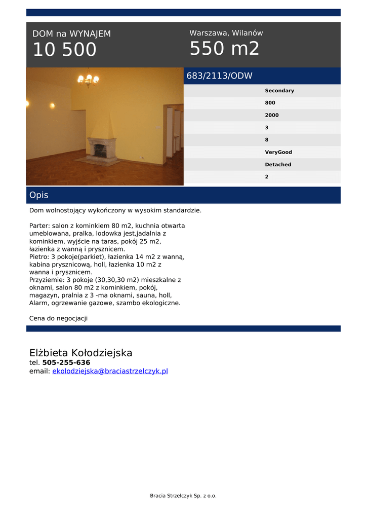Warszawa, Wilanów DOM na WYNAJEM 550 m2 10 500 683/2113/ODW Secondary 800 2000 3 8 VeryGood Detached 2 Opis Dom wolnostojący wykończony w wysokim standardzie. Parter: salon z kominkiem 80 m2, kuchnia otwarta umeblowana, pralka, lodowka jest,jadalnia z kominkiem, wyjście na taras, pokój 25 m2, łazienka z wanną i prysznicem. Pietro: 3 pokoje(parkiet), łazienka 14 m2 z wanną, kabina prysznicową, holl, łazienka 10 m2 z wanna i prysznicem. Przyziemie: 3 pokoje (30,30,30 m2) mieszkalne z oknami, salon 80 m2 z kominkiem, pokój, magazyn, pralnia z 3 -ma oknami, sauna, holl, Alarm, ogrzewanie gazowe, szambo ekologiczne. Cena do negocjacji Elżbieta Kołodziejska tel. 505-255-636 email: [email protected] Bracia Strzelczyk Sp. z o.o. Powered by TCPDF (www.tcpdf.org)