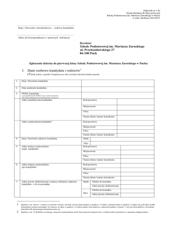 Załącznik nr 1 do Zasad rekrutacji do klasy pierwszej Szkoły Podstawowej im. Mariusza Zaruskiego w Pucku w roku szkolnym 2014/2015 ……………………………………………... Imię i Nazwisko wnioskodawcy – rodzica kandydata ……………………………………………. Adres do korespondencji w sprawach rekrutacji Dyrektor Szkoły Podstawowej im. Mariusza Zaruskiego ul. Przebendowskiego 27 84-100 Puck Zgłoszenie dziecka do pierwszej klasy Szkoły Podstawowej im. Mariusza Zaruskiego w Pucku I. Dane osobowe kandydata i rodziców1 (Tabelę należy wypełnić komputerowo lub czytelnie literami drukowanymi) 1. Imię i Nazwisko kandydata 2. Data urodzenia kandydata 3. PESEL kandydata w przypadku braku PESEL serię i numer paszportu lub innego dokumentu potwierdzającego tożsamość Adres zameldowania kandydata Kod pocztowy Miejscowość Ulica Numer domu /numer mieszkania Adres zamieszkania kandydata2 Kod pocztowy Miejscowość Ulica Numer domu /numer mieszkania 4. Imię i Nazwiska rodziców kandydata Matki 5. Adres miejsca zamieszkania matki kandydata² Kod pocztowy Ojca Miejscowość Ulica Numer domu /numer mieszkania 6. Adres miejsca zamieszkania ojca kandydata² Kod pocztowy Miejscowość Ulica Numer domu /numer mieszkania 7. Adres poczty elektronicznej i numery telefonów rodziców kandydata - o ile je posiadają Matki Telefon do kontaktu Adres poczty elektronicznej Telefon do kontaktu Ojca Adres poczty elektronicznej 1 Zgodnie z art. 20t ust. 1 ustawy o systemie oświaty, wniosek zawiera dane podane w punkcie 1-6 tabeli, natomiast dane w punkcie 7 podaje się, jeśli takie środki komunikacji rodzice posiadają. To oznacza, że dane w punkcie 1-6 należy podac obowiązkowo, natomiast podane w puncie 7, nie jest obowiązkowe, ale bardzo potrzebne dla skutecznego komunikowania się. 2 Zgodnie z art. 25 Kodeksu cywilnego, miejscem zamieszkania osoby fizycznej jest miejscowość, w której osoba ta przebywa z zamiarem stałego pobytu. II. Informacja o złożeniu wniosku o przyjęcie kandydata do publicznych szkół podstawowych 3 Jeżeli wnioskodawca skorzystał z prawa składania wniosku o przyjęcie kandydata do więcej niż jednej publicznej szkoły podstawowej, zobowiązany jest wpisać nazwy i adresy tych szkół w kolejności od najbardziej do najmniej preferowanych.4 1. Pierwszy wybór …..................................................................................................................................................................... 2. Drugi wybór …..................................................................................................................................................................... 3. Trzeci wybór …..................................................................................................................................................................... Oświadczenie wnioskodawcy Oświadczam, że przedstawione przeze mnie w niniejszym zgłoszeniu informacje są zgodne ze stanem faktycznym. Jednocześnie oświadczam, że zostałam/em poinformowana/y o tym, że administratorem moich danych jest szkoła, oraz o przysługujących mi na podstawie ustawy o ochronie danych z 29 sierpnia 1997 r. (tekst jednolity: Dz. U. 2002 nr 101, poz. 926 ze zm.) uprawnieniach, w tym o prawie dostępu do treści moich danych osobowych oraz o prawie do ich poprawiania. Oświadczam również, że podałam/łem moje dane osobowe dobrowolnie. ….................................................. (data) 3 4 ….......................................................... (czytelny podpis rodziców kandydata) Zgodnie z art. 20za 1 ustawy o systemie oświaty, wniosek o przyjęcie do publicznej szkoły, może być złożony do nie więcej niż trzech szkół. Zgodnie z art. 20t ust. 1 pkt 5 ustawy o systemie oświaty, wniosek zawiera wskazania kolejnych wybranych szkół w porządku od najbardziej do najmniej preferowanych. To ozancza, że wnioskodawca jest zobowiązany taką informację podać.
