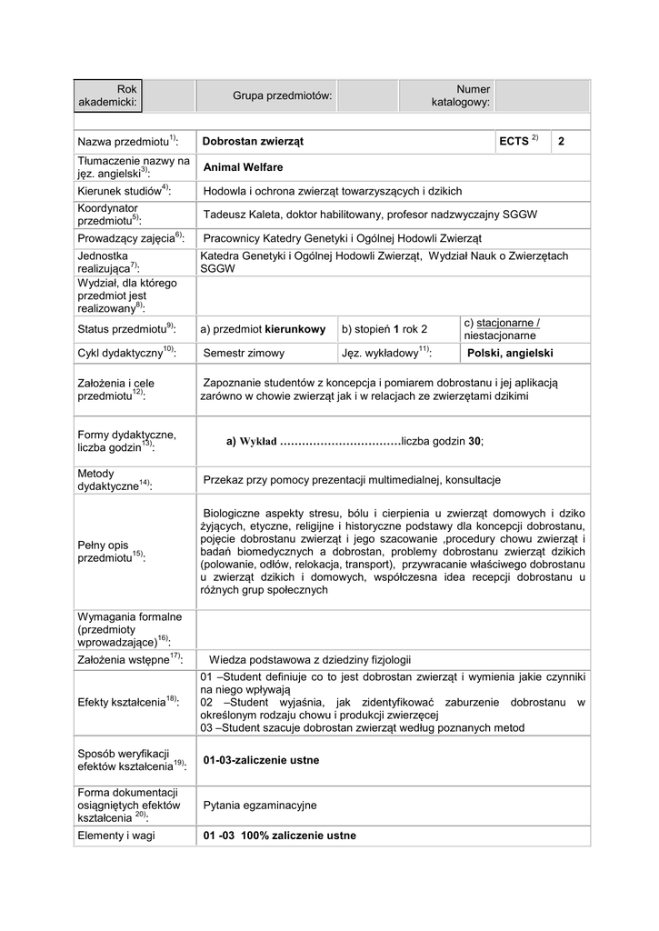 Rok akademicki: Numer katalogowy: Grupa przedmiotów: 1) Nazwa przedmiotu : Dobrostan zwierząt Tłumaczenie nazwy na 3) jęz. angielski : Animal Welfare 4) ECTS 2) Kierunek studiów : Hodowla i ochrona zwierząt towarzyszących i dzikich Koordynator 5) przedmiotu : Tadeusz Kaleta, doktor habilitowany, profesor nadzwyczajny SGGW 6) 2 Prowadzący zajęcia : Pracownicy Katedry Genetyki i Ogólnej Hodowli Zwierząt Jednostka 7) realizująca : Wydział, dla którego przedmiot jest 8) realizowany : Katedra Genetyki i Ogólnej Hodowli Zwierząt, Wydział Nauk o Zwierzętach SGGW 9) c) stacjonarne / niestacjonarne a) przedmiot kierunkowy b) stopień 1 rok 2 Cykl dydaktyczny : Semestr zimowy Jęz. wykładowy : Założenia i cele 12) przedmiotu : Zapoznanie studentów z koncepcja i pomiarem dobrostanu i jej aplikacją zarówno w chowie zwierząt jak i w relacjach ze zwierzętami dzikimi Status przedmiotu : 10) Formy dydaktyczne, 13) liczba godzin : 11) Polski, angielski a) Wykład ……………………………liczba godzin 30; Metody 14) dydaktyczne : Przekaz przy pomocy prezentacji multimedialnej, konsultacje Pełny opis 15) przedmiotu : Biologiczne aspekty stresu, bólu i cierpienia u zwierząt domowych i dziko żyjących, etyczne, religijne i historyczne podstawy dla koncepcji dobrostanu, pojęcie dobrostanu zwierząt i jego szacowanie ,procedury chowu zwierząt i badań biomedycznych a dobrostan, problemy dobrostanu zwierząt dzikich (polowanie, odłów, relokacja, transport), przywracanie właściwego dobrostanu u zwierząt dzikich i domowych, współczesna idea recepcji dobrostanu u różnych grup społecznych Wymagania formalne (przedmioty 16) wprowadzające) : 17) Założenia wstępne : Wiedza podstawowa z dziedziny fizjologii Efekty kształcenia : 01 –Student definiuje co to jest dobrostan zwierząt i wymienia jakie czynniki na niego wpływają 02 –Student wyjaśnia, jak zidentyfikować zaburzenie dobrostanu w określonym rodzaju chowu i produkcji zwierzęcej 03 –Student szacuje dobrostan zwierząt według poznanych metod Sposób weryfikacji 19) efektów kształcenia : 01-03-zaliczenie ustne Forma dokumentacji osiągniętych efektów 20) kształcenia : Pytania egzaminacyjne Elementy i wagi 01 -03 100% zaliczenie ustne 18) mające wpływ na 21) ocenę końcową : Miejsce realizacji Sala wykładowa 22) zajęć : 23) Literatura podstawowa i uzupełniająca : 1.Podstawowa Paton W. Człowiek i mysz. Badania medyczne na zwierzętach. PWN, Warszawa 1997 Singer P. Wyzwolenie zwierząt. PIW, Warszawa 2004 Uzupełniająca 1. Broom D. The scientific assessment of animal welfare. Applied Animal Behaviour Science 20 (1988), 5-19 2.Fraser A. The behaviour of suffering in animals. Applied Animal Behaviour Science 13 (1984) 1-6 24) UWAGI : Wskaźniki ilościowe charakteryzujące moduł/przedmiot25) : Szacunkowa sumaryczna liczba godzin pracy studenta (kontaktowych i pracy własnej) 18) niezbędna dla osiągnięcia zakładanych efektów kształcenia - na tej podstawie należy 2 wypełnić pole ECTS : Łączna liczba punktów ECTS, którą student uzyskuje na zajęciach wymagających bezpośredniego udziału nauczycieli akademickich: Łączna liczba punktów ECTS, którą student uzyskuje w ramach zajęć o charakterze praktycznym, takich jak zajęcia laboratoryjne, projektowe, itp.: 26) Tabela zgodności kierunkowych efektów kształcenia efektami przedmiotu Nr /symbol efektu 01/W 02/W 03/U Wymienione w wierszu efekty kształcenia: Zna pojęcie dobrostanu zwierząt i wie jakie czynniki na niego wpływają Zna zaburzenie dobrostanu w określonym rodzaju chowu i produkcji zwierzęcej Umie szacować dobrostan zwierząt 50 H 1 ECTS ……. ECTS Odniesienie do efektów dla programu kształcenia na kierunku KW_13 KW_13 K_U13