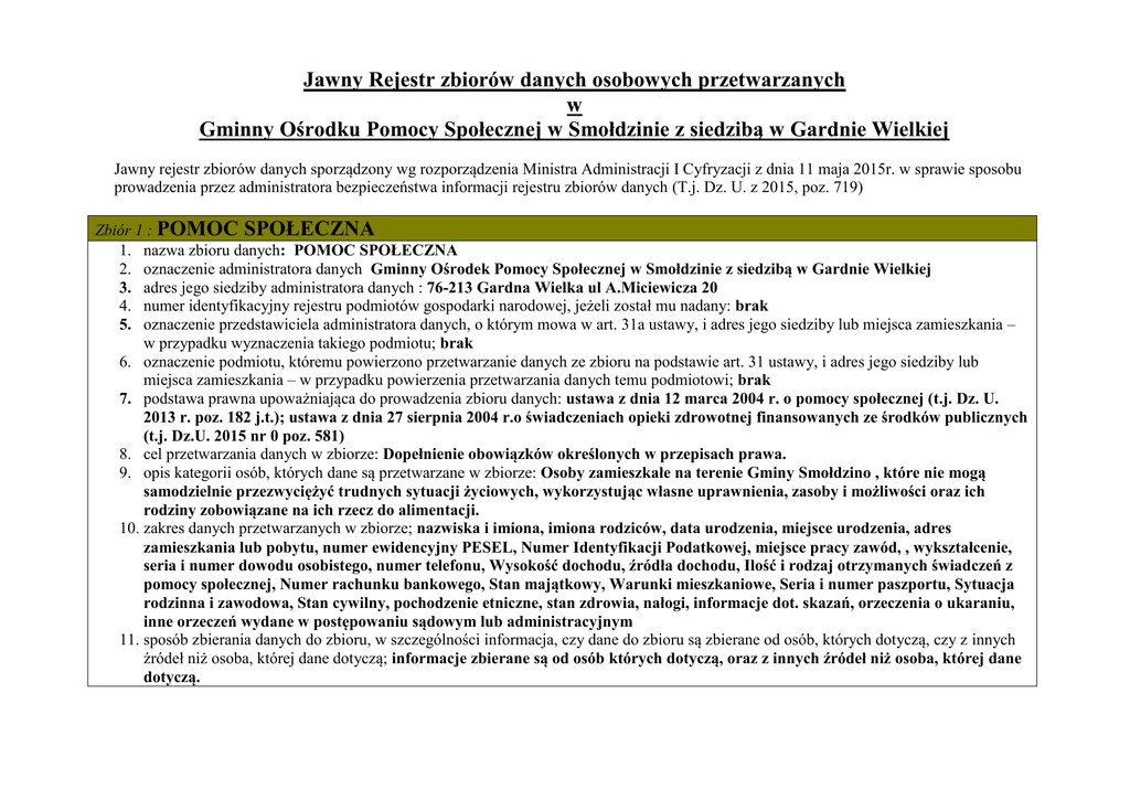 Jawny Rejestr zbiorów danych osobowych przetwarzanych w Gminny Ośrodku Pomocy Społecznej w Smołdzinie z siedzibą w Gardnie Wielkiej Jawny rejestr zbiorów danych sporządzony wg rozporządzenia Ministra Administracji I Cyfryzacji z dnia 11 maja 2015r. w sprawie sposobu prowadzenia przez administratora bezpieczeństwa informacji rejestru zbiorów danych (T.j. Dz. U. z 2015, poz. 719) Zbiór 1 : POMOC SPOŁECZNA 1. nazwa zbioru danych: POMOC SPOŁECZNA 2. oznaczenie administratora danych Gminny Ośrodek Pomocy Społecznej w Smołdzinie z siedzibą w Gardnie Wielkiej 3. adres jego siedziby administratora danych : 76-213 Gardna Wielka ul A.Miciewicza 20 4. numer identyfikacyjny rejestru podmiotów gospodarki narodowej, jeżeli został mu nadany: brak 5. oznaczenie przedstawiciela administratora danych, o którym mowa w art. 31a ustawy, i adres jego siedziby lub miejsca zamieszkania – w przypadku wyznaczenia takiego podmiotu; brak 6. oznaczenie podmiotu, któremu powierzono przetwarzanie danych ze zbioru na podstawie art. 31 ustawy, i adres jego siedziby lub miejsca zamieszkania – w przypadku powierzenia przetwarzania danych temu podmiotowi; brak 7. podstawa prawna upoważniająca do prowadzenia zbioru danych: ustawa z dnia 12 marca 2004 r. o pomocy społecznej (t.j. Dz. U. 2013 r. poz. 182 j.t.); ustawa z dnia 27 sierpnia 2004 r.o świadczeniach opieki zdrowotnej finansowanych ze środków publicznych (t.j. Dz.U. 2015 nr 0 poz. 581) 8. cel przetwarzania danych w zbiorze: Dopełnienie obowiązków określonych w przepisach prawa. 9. opis kategorii osób, których dane są przetwarzane w zbiorze: Osoby zamieszkałe na terenie Gminy Smołdzino , które nie mogą samodzielnie przezwyciężyć trudnych sytuacji życiowych, wykorzystując własne uprawnienia, zasoby i możliwości oraz ich rodziny zobowiązane na ich rzecz do alimentacji. 10. zakres danych przetwarzanych w zbiorze; nazwiska i imiona, imiona rodziców, data urodzenia, miejsce urodzenia, adres zamieszkania lub pobytu, numer ewidencyjny PESEL, Numer Identyfikacji Podatkowej, miejsce pracy zawód, , wykształcenie, seria i numer dowodu osobistego, numer telefonu, Wysokość dochodu, źródła dochodu, Ilość i rodzaj otrzymanych świadczeń z pomocy społecznej, Numer rachunku bankowego, Stan majątkowy, Warunki mieszkaniowe, Seria i numer paszportu, Sytuacja rodzinna i zawodowa, Stan cywilny, pochodzenie etniczne, stan zdrowia, nałogi, informacje dot. skazań, orzeczenia o ukaraniu, inne orzeczeń wydane w postępowaniu sądowym lub administracyjnym 11. sposób zbierania danych do zbioru, w szczególności informacja, czy dane do zbioru są zbierane od osób, których dotyczą, czy z innych źródeł niż osoba, której dane dotyczą; informacje zbierane są od osób których dotyczą, oraz z innych źródeł niż osoba, której dane dotyczą. 12. sposób udostępniania danych ze zbioru, w szczególności informacja, czy dane ze zbioru są udostępniane innym podmiotom niż upoważnione na podstawie przepisów prawa; informacje zawarte w zbiorze są udostępniane wyłącznie podmiotom upoważnionym na podstawie prawa 13. oznaczenie odbiorcy danych lub kategorii odbiorców, którym dane mogą być przekazywane: nie dotyczy 14. przekazywanie danych do państwa trzeciego: nie dotyczy 15. data wpisu zbioru danych do rejestru,:1 czerwiec 2015 16. data ostatniej aktualizacji informacji.: 1 czerwiec 2015 Zbiór 2 : ŚWIADCZENIA RODZINNE nazwa zbioru danych: ŚWIADCZENIA RODZINNE oznaczenie administratora danych Gminny Ośrodek Pomocy Społecznej w Smołdzinie z siedzibą w Gardnie Wielkiej adres jego siedziby administratora danych : 76-213 Gardna Wielka ul A.Miciewicza 20 numer identyfikacyjny rejestru podmiotów gospodarki narodowej, jeżeli został mu nadany: brak oznaczenie przedstawiciela administratora danych, o którym mowa w art. 31a ustawy, i adres jego siedziby lub miejsca zamieszkania – w przypadku wyznaczenia takiego podmiotu; brak 6. oznaczenie podmiotu, któremu powierzono przetwarzanie danych ze zbioru na podstawie art. 31 ustawy, i adres jego siedziby lub miejsca zamieszkania – w przypadku powierzenia przetwarzania danych temu podmiotowi; brak 7. podstawa prawna upoważniająca do prowadzenia zbioru danych: ustawa z dnia 28 listopada 2003 r. o świadczeniach rodzinnych (t.j. Dz. U. Nr 228, poz. 2255 z późn. zm.) 8. cel przetwarzania danych w zbiorze; Dopełnienie obowiązków określonych w przepisach prawa. 9. opis kategorii osób, których dane są przetwarzane w zbiorze: Osoby i członkowie ich rodzin zamieszkałe na terenie gminy Smołdzino , które ubiegają się o przyznanie świadczeń rodzinnych.. 10. zakres danych przetwarzanych w zbiorze: nazwiska i imiona, data urodzenia, adres zamieszkania lub pobytu, numer ewidencyjny PESEL, Numer Identyfikacji Podatkowej, miejsce pracy, zawód, wykształcenie, seria i numer dowodu osobistego, numer telefonu, stan zdrowia, 11. sposób zbierania danych do zbioru, w szczególności informacja, czy dane do zbioru są zbierane od osób, których dotyczą, czy z innych źródeł niż osoba, której dane dotyczą; informacje zbierane są od osób których dotyczą, oraz z innych źródeł niż osoba, której dane dotyczą. 12. sposób udostępniania danych ze zbioru, w szczególności informacja, czy dane ze zbioru są udostępniane innym podmiotom niż upoważnione na podstawie przepisów prawa: informacje zawarte w zbiorze są udostępniane wyłącznie podmiotom upoważnionym na podstawie prawa 13. oznaczenie odbiorcy danych lub kategorii odbiorców, którym dane mogą być przekazywane: nie dotyczy 14. przekazywania danych do państwa trzeciego: nie dotyczy 15. data wpisu zbioru danych do rejestru: 1 czerwiec 2015 1. 2. 3. 4. 5. 16. data ostatniej aktualizacji informacji: 1 czerwiec 2015 Zbiór 3 : POMOC OSOBOM UPRAWNIONYM DO ALIMENTÓW nazwa zbioru danych: POMOC OSOBOM UPRAWNIONYM DO ALIMENTÓW oznaczenie administratora danych Gminny Ośrodek Pomocy Społecznej w S