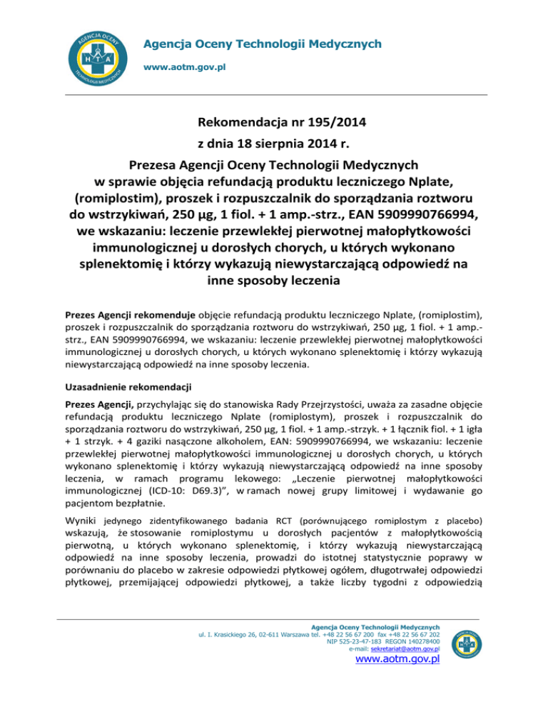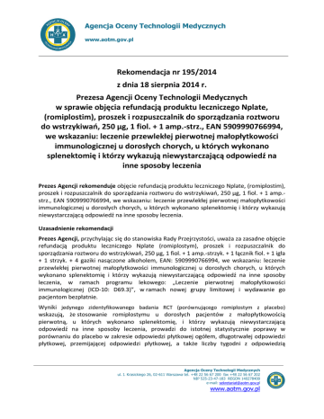 Agencja Oceny Technologii Medycznych www.aotm.gov.pl Rekomendacja nr 195/2014 z dnia 18 sierpnia 2014 r. Prezesa Agencji Oceny Technologii Medycznych w sprawie objęcia refundacją produktu leczniczego Nplate, (romiplostim), proszek i rozpuszczalnik do sporządzania roztworu do wstrzykiwań, 250 µg, 1 fiol. + 1 amp.-strz., EAN 5909990766994, we wskazaniu: leczenie przewlekłej pierwotnej małopłytkowości immunologicznej u dorosłych chorych, u których wykonano splenektomię i którzy wykazują niewystarczającą odpowiedź na inne sposoby leczenia Prezes Agencji rekomenduje objęcie refundacją produktu leczniczego Nplate, (romiplostim), proszek i rozpuszczalnik do sporządzania roztworu do wstrzykiwań, 250 µg, 1 fiol. + 1 amp.strz., EAN 5909990766994, we wskazaniu: leczenie przewlekłej pierwotnej małopłytkowości immunologicznej u dorosłych chorych, u których wykonano splenektomię i którzy wykazują niewystarczającą odpowiedź na inne sposoby leczenia. Uzasadnienie rekomendacji Prezes Agencji, przychylając się do stanowiska Rady Przejrzystości, uważa za zasadne objęcie refundacją produktu leczniczego Nplate (romiplostym), proszek i rozpuszczalnik do sporządzania roztworu do wstrzykiwań, 250 µg, 1 fiol. + 1 amp.-strzyk. + 1 łącznik fiol. + 1 igła + 1 strzyk. + 4 gaziki nasączone alkoholem, EAN: 5909990766994, we wskazaniu: leczenie przewlekłej pierwotnej małopłytkowości immunologicznej u dorosłych chorych, u których wykonano splenektomię i którzy wykazują niewystarczającą odpowiedź na inne sposoby leczenia, w ramach programu lekowego: „Leczenie pierwotnej małopłytkowości immunologicznej (ICD-10: D69.3)”, w ramach nowej grupy limitowej i wydawanie go pacjentom bezpłatnie. Wyniki jedynego zidentyfikowanego badania RCT (porównującego romiplostym z placebo) wskazują, że stosowanie romiplostymu u dorosłych pacjentów z małopłytkowością pierwotną, u których wykonano splenektomię, i którzy wykazują niewystarczającą odpowiedź na inne sposoby leczenia, prowadzi do istotnej statystycznie poprawy w porównaniu do placebo w zakresie odpowiedzi płytkowej ogółem, długotrwałej odpowiedzi płytkowej, przemijającej odpowiedzi płytkowej, a także liczby tygodni z odpowiedzią Agencja Oceny Technologii Medycznych ul. I. Krasickiego 26, 02-611 Warszawa tel. +48 22 56 67 200 fax +48 22 56 67 202 NIP 525-23-47-183 REGON 140278400 e-mail: [email protected] www.aotm.gov.pl Rekomendacja nr 195/2014 Prezesa AOTM z dnia 18 sierpnia 2014 r. płytkową. Analiza bezpieczeństwa stosowania romiplostymu wykazała podobny profil bezpieczeństwa w stosunku do placebo. Wprowadzenie terapii romiplostymem, będzie wiązało się z oszczędnościami dla płatnika publicznego, jednakże dodatkowa analiza wrażliwości, przeprowadzona przez AOTM, wskazuje na niepewność w tym zakresie, zwłaszcza przy stosowaniu wyższych dawek i zużywaniu większej liczby opakowań leku. Równocześnie, w związku z niepewnością w zakresie obciążeń dla budżetu po wprowadzeniu finansowania wnioskowanej technologii, zasadnym jest zastosowanie mechanizmu zabezpieczającego przed wzrostem wydatków budżetowych, np. w postaci instrumentu podziału ryzyka. Prezes Agencji popiera propozycję Rady odnośnie wprowadzenia następujących uściśleń w programie lekowym: określenie progowej liczby płytek, świadczącej o nieskuteczności splenektomii, zawarcia informacji dotyczących stosowania leczenia w ciąży i podczas karmienia piersią, określenie sposobu stosowania leczenia u pacjentów z zaburzeniami funkcji nerek oraz u pacjentów powyżej 60 roku życia z objawami układowymi, jak również bardziej dokładne monitorowanie leczenia, np. monitorowanie funkcji wątroby. Romiplostym we wnioskowanym wskazaniu jest powszechnie stosowany w światowej praktyce klinicznej, co potwierdzają rekomendacje krajowych i międzynarodowych organizacji i towarzystw naukowych. Przedmiot wniosku Wnioskodawca, we wniosku o objęcie refundacją i ustalenie urzędowej ceny zbytu produktu leczniczego Nplate (romiplostym), proszek i rozpuszczalnik do sporządzania roztworu do wstrzykiwań, 250 µg, EAN: 5909990766994 wnosi o uzyskanie refundacji ww. produktu leczniczego w leczeniu przewlekłej pierwotnej małopłytkowości immunologicznej u dorosłych chorych, u których wykonano splenektomię i którzy wykazują niewystarczającą odpowiedź na inne sposoby leczenia, w ramach programu lekowego: „Leczenie pierwotnej małopłytkowości immunologicznej (ICD-10: D69.3)”, oraz utworzenie nowej grupy limitowej z deklarowanym poziomem odpłatności – bezpłatnie. Wnioskodawca zaproponował cenę zbytu netto . Wnioskodawca nie zaproponował instrumentu podziału ryzyka. Problem zdrowotny Pierwotna małopłytkowość immunologiczna (ITP, Immune/Idiopathic Thrombocytopenic Purpura) (kod ICD-10: D69.3) jest nabytym schorzeniem immunologicznym, przebiegającym z izolowanym obniżeniem liczby płytek we krwi obwodowej do wartości poniżej 100 × 109/l, przy braku znanych czynników wywołujących małopłytkowość i/lub zaburzeń przebiegających z małopłytkowością. Zachorowalność roczną w ogólnej populacji dorosłych w Polsce szacuje się na 3,5/100 000. Wśród chorych w wieku 30-60 lat więcej jest kobiet. Opis wnioskowanego świadczenia Romiplostym jest białkiem fuzyjnym (przeciwciałem) złożonym z peptydu przyłączonego do fragmentu Fc, które sygnalizuje i aktywuje za pomocą receptora trombopoetyny (znanego również jako cMpl) wewnątrzkomórkowe szlaki transkrypcji, zwiększając w ten sposób wytwarzanie płytek krwi. Cząsteczka przeciwciała składa się z domeny Fc ludzkiej immunoglobuliny klasy IgG1, której jednołańcuchowe podjednostki przyłączone są za pomocą wiązania kowalencyjnego do końca C łańcucha peptydowego, zawierającego 2 domeny wiążące receptory trombopoetyny. 2 Rekomendacja nr 195/2014 Prezesa AOTM z dnia 18 sierpnia 2014 r. Sekwencja a