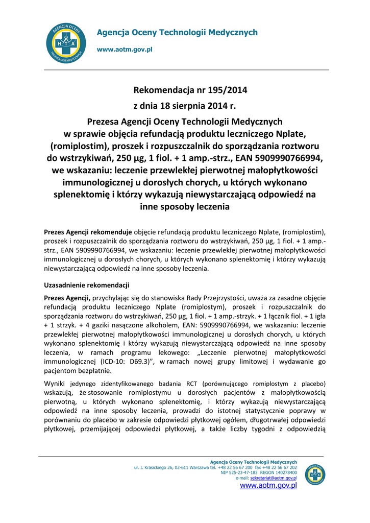 Rekomendacja nr 195/2014 z dnia 18 sierpnia 2014 r. Nplate