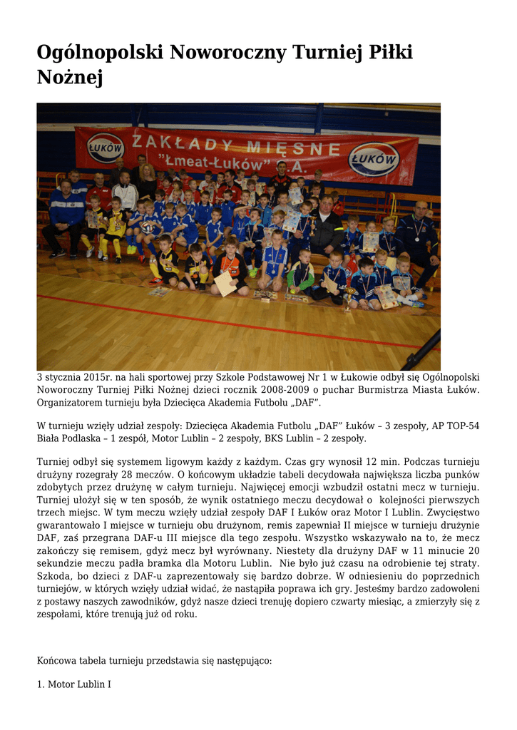 Ogólnopolski Noworoczny Turniej Piłki Nożnej 3 stycznia 2015r. na hali sportowej przy Szkole Podstawowej Nr 1 w Łukowie odbył się Ogólnopolski Noworoczny Turniej Piłki Nożnej dzieci rocznik 2008-2009 o puchar Burmistrza Miasta Łuków. Organizatorem turnieju była Dziecięca Akademia Futbolu „DAF”. W turnieju wzięły udział zespoły: Dziecięca Akademia Futbolu „DAF” Łuków – 3 zespoły, AP TOP-54 Biała Podlaska – 1 zespół, Motor Lublin – 2 zespoły, BKS Lublin – 2 zespoły. Turniej odbył się systemem ligowym każdy z każdym. Czas gry wynosił 12 min. Podczas turnieju drużyny rozegrały 28 meczów. O końcowym układzie tabeli decydowała największa liczba punków zdobytych przez drużynę w całym turnieju. Najwięcej emocji wzbudził ostatni mecz w turnieju. Turniej ułożył się w ten sposób, że wynik ostatniego meczu decydował o kolejności pierwszych trzech miejsc. W tym meczu wzięły udział zespoły DAF I Łuków oraz Motor I Lublin. Zwycięstwo gwarantowało I miejsce w turnieju obu drużynom, remis zapewniał II miejsce w turnieju drużynie DAF, zaś przegrana DAF-u III miejsce dla tego zespołu. Wszystko wskazywało na to, że mecz zakończy się remisem, gdyż mecz był wyrównany. Niestety dla drużyny DAF w 11 minucie 20 sekundzie meczu padła bramka dla Motoru Lublin. Nie było już czasu na odrobienie tej straty. Szkoda, bo dzieci z DAF-u zaprezentowały się bardzo dobrze. W odniesieniu do poprzednich turniejów, w których wzięły udział widać, że nastąpiła poprawa ich gry. Jesteśmy bardzo zadowoleni z postawy naszych zawodników, gdyż nasze dzieci trenuję dopiero czwarty miesiąc, a zmierzyły się z zespołami, które trenują już od roku. Końcowa tabela turnieju przedstawia się następująco: 1. Motor Lublin I 2.Motor Lublin II 3.DAF Łuków I 4.BKS Lublin I 5.DAF Łuków II 6.AP Top-54 Biała Podlaska 7.BKS Lublin II 8.DAF Łuków III Podczas turnieju przyznano indywidualne nagrody i wyróżnienia. Najlepszym zawodnikiem turnieju został uznany Tomasz Cisiak (DAF I Łuków). Najlepszym strzelcem turnieju został Damian Czerniak (Motor Lublin I). Tytuł Najlepszego bramkarza turnieju otrzymał Piotr Watrak (Motor Lublin II). Najlepszym obrońcą turnieju został Krystian Goral (BKS Lublin I). Wyróżnieni zawodnicy otrzymali statuetki i nagrody rzeczowe. Dodatkowo w każdej drużynie trener dokonał wyboru najlepszego zawodnika, który od organizatorów turnieju otrzymał nagrodę rzeczową. Tymi zawodnikami byli: 1.Aleksander Szady –BKS Lublin I 2.Franciszek Maj –BKS Lublin II 3.Bartosz Mazurek – Motor Lublin I 4.Wiktor Samonek – Motor Lublin II 5.Marceli Ochijewicz - Top-54 Biała Podlaska 6.Wiktor Mościcki – DAF Łuków I 7.Mateusz Filipczak – DAF Łuków II 8.Igor Gryczka – DAF Łuków III. Wszyscy uczestnicy turnieju otrzymali dyplomy za udział, medale za zajęte miejsce, a każda drużyna puchar za zajęte miejsce. Sponsorami turnieju byli: Burmistrz Miasta Łuków, Zakłady Mięsne „Łmeat-Łuków”, abcRowery Piotr Prokop, Axer Sport, Łukplast, „Mięs-Hurt” sp.j. Cz.Oleksiński, P.Wereszczyński. W DAF grali: Gabriel Żyłka, Mateusz Michalak, Franciszek Świerczewski, Wiktor Mościcki, Mateusz Wiśniewski, Tomasz Cisiak, Grzegorz Popiel, Kacper Woch, Franciszek Rosa, Mateusz Filipczak, Paweł Krakowski, Konrad Zalewski, Kamil Baniak, Jakub Kopiejek, Igor Gryczka, Wiktor Hryciuk, Dawid Sulej, Oliwier Chruściel, Bartosz Strzelec, Maciej Oleskiej. Turniej ten zapoczątkował cykl turniejów o charakterze ogólnopolskim, które DAF zaplanował na miesiąc styczeń 2015r. Za tydzień (10.01.2014r.) zagrają dzieci z rocznika 2006-2007, w dniu 17 stycznia 2015r. odbędzie się turniej rocznika 2004-2005, a tydzień później tj.24 stycznia 2015r. zagrają dzieci z rocznika 2002-2003.