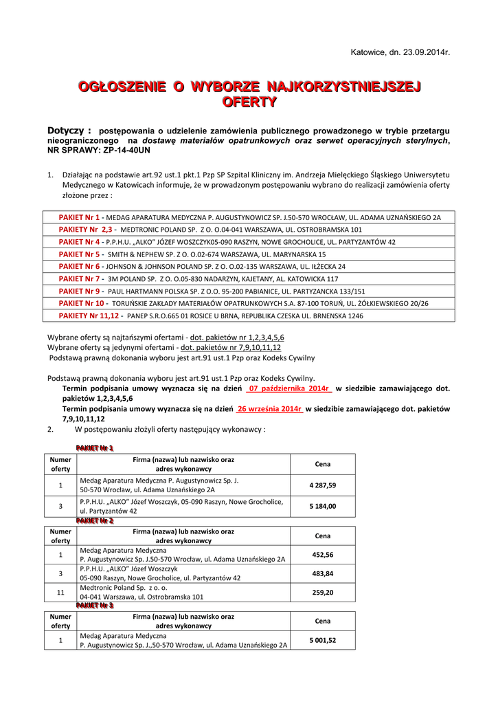 Katowice, dn. 23.09.2014r. O OG GŁŁO OS SZZE EN NIIE E O O W WY YB BO OR RZZE E N NA AJJK KO OR RZZY YS STTN NIIE EJJS SZZE EJJ O OFFE ER RTTY Y Dotyczy : postępowania o udzielenie zamówienia publicznego prowadzonego w trybie przetargu nieograniczonego na dostawę materiałów opatrunkowych oraz serwet operacyjnych sterylnych,, NR SPRAWY: ZP-14-40UN 1. Działając na podstawie art.92 ust.1 pkt.1 Pzp SP Szpital Kliniczny im. Andrzeja Mielęckiego Śląskiego Uniwersytetu Medycznego w Katowicach informuje, że w prowadzonym postępowaniu wybrano do realizacji zamówienia oferty złożone przez : PAKIET Nr 1 - MEDAG APARATURA MEDYCZNA P. AUGUSTYNOWICZ SP. J.50-570 WROCŁAW, UL. ADAMA UZNAOSKIEGO 2A PAKIETY Nr 2,3 - MEDTRONIC POLAND SP. Z O. O.04-041 WARSZAWA, UL. OSTROBRAMSKA 101 PAKIET Nr 4 - P.P.H.U. „ALKO” JÓZEF WOSZCZYK05-090 RASZYN, NOWE GROCHOLICE, UL. PARTYZANTÓW 42 PAKIET Nr 5 - SMITH & NEPHEW SP. Z O. O.02-674 WARSZAWA, UL. MARYNARSKA 15 PAKIET Nr 6 - JOHNSON & JOHNSON POLAND SP. Z O. O.02-135 WARSZAWA, UL. IŁŻECKA 24 PAKIET Nr 7 - 3M POLAND SP. Z O. O.05-830 NADARZYN, KAJETANY, AL. KATOWICKA 117 PAKIET Nr 9 - PAUL HARTMANN POLSKA SP. Z O.O. 95-200 PABIANICE, UL. PARTYZANCKA 133/151 PAKIET Nr 10 - TORUOSKIE ZAKŁADY MATERIAŁÓW OPATRUNKOWYCH S.A. 87-100 TORUO, UL. ŻÓŁKIEWSKIEGO 20/26 PAKIETY Nr 11,12 - PANEP S.R.O.665 01 ROSICE U BRNA, REPUBLIKA CZESKA UL. BRNENSKA 1246 Wybrane oferty są najtaoszymi ofertami - dot. pakietów nr 1,2,3,4,5,6 Wybrane oferty są jedynymi ofertami - dot. pakietów nr 7,9,10,11,12 Podstawą prawną dokonania wyboru jest art.91 ust.1 Pzp oraz Kodeks Cywilny Podstawą prawną dokonania wyboru jest art.91 ust.1 Pzp oraz Kodeks Cywilny. Termin podpisania umowy wyznacza się na dzieo 07 października 2014r w siedzibie zamawiającego dot. pakietów 1,2,3,4,5,6 Termin podpisania umowy wyznacza się na dzieo 26 września 2014r w siedzibie zamawiającego dot. pakietów 7,9,10,11,12 2. W postępowaniu złożyli oferty następujący wykonawcy : PPPAAAKKKIIIEEETTTN N Nrrr111 Numer oferty 1 3 Numer oferty 1 3 11 Numer oferty 1 Firma (nazwa) lub nazwisko oraz adres wykonawcy Medag Aparatura Medyczna P. Augustynowicz Sp. J. 50-570 Wrocław, ul. Adama Uznaoskiego 2A P.P.H.U. „ALKO” Józef Woszczyk, 05-090 Raszyn, Nowe Grocholice, ul. Partyzantów 42 PPPAAAKKKIIIEEETTTN N Nrrr222 Firma (nazwa) lub nazwisko oraz adres wykonawcy Medag Aparatura Medyczna P. Augustynowicz Sp. J.50-570 Wrocław, ul. Adama Uznaoskiego 2A P.P.H.U. „ALKO” Józef Woszczyk 05-090 Raszyn, Nowe Grocholice, ul. Partyzantów 42 Medtronic Poland Sp. z o. o. 04-041 Warszawa, ul. Ostrobramska 101 PPPAAAKKKIIIEEETTTN N Nrrr333 Firma (nazwa) lub nazwisko oraz adres wykonawcy Medag Aparatura Medyczna P. Augustynowicz Sp. J.,50-570 Wrocław, ul. Adama Uznaoskiego 2A Cena 4 287,59 5 184,00 Cena 452,56 483,84 259,20 Cena 5 001,52 Numer oferty P.P.H.U. „ALKO” Józef Woszczyk 05-090 Raszyn, Nowe Grocholice, ul. Partyzantów 42 Promedica Toruo Sp. z o.o. 87-100 Toruo, ul. Grudziądzka 159A Medtronic Poland Sp. z o. o. 04-041 Warszawa, ul. Ostrobramska 101 PPPAAAKKKIIIEEETTTN N Nrrr444 Firma (nazwa) lub nazwisko oraz adres wykonawcy Medag Aparatura Medyczna P. Augustynowicz Sp. J.,50-570 Wrocław, ul. Adama Uznaoskiego 2A P.P.H.U. „ALKO” Józef Woszczyk05-090 Raszyn, Nowe Grocholice, ul. Partyzantów 42 Medtronic Poland Sp. z o. o. 04-041 Warszawa, ul. Ostrobramska 101 PPPAAAKKKIIIEEETTTN N Nrrr555 Firma (nazwa) lub nazwisko oraz adres wykonawcy 6 3M Poland Sp. z o. o.05-830 Nadarzyn, Kajetany, al. Katowicka 117 64 800,00 8 Smith & Nephew Sp. z o. o.02-674 Warszawa, ul. Marynarska 15 28 080,00 AYKON s.c.25-540 Kielce, ul. Jesionowa 31 B 42 984,00 3 5 11 Numer oferty 1 3 11 10 4 989,60 3 132,00 3 672,00 Cena 1 763,60 1 166,40 453,60 Cena PPPAAAKKKIIIEEETTTN N Nrrr666 Numer oferty 2 5 Firma (nazwa) lub nazwisko oraz adres wykonawcy JOHNSON & JOHNSON Poland Sp. z o. o., 02-135 Warszawa, ul. Iłżecka 24 Promedica Toruo Sp. z o.o., 87-100 Toruo, ul. Grudziądzka 159A Cena 109 900,80 196 992,00 PPPAAAKKKIIIEEETTTN N Nrrr777 Numer oferty 6 Firma (nazwa) lub nazwisko oraz adres wykonawcy Cena 3M Poland Sp. z o. o.05-830 Nadarzyn, Kajetany, Al. Katowicka 117 22 524,48 PPPAAAKKKIIIEEETTTN N Nrrr999 Numer oferty 4 Numer oferty 7 Numer oferty 9 Numer oferty 9 3. Firma (nazwa) lub nazwisko oraz adres wykonawcy Paul Hartmann Polska Sp. z o.o. 95-200 Pabianice, ul. Partyzancka 133/151 PPPAAAKKKIIIEEETTTN N Nrrr111000 Firma (nazwa) lub nazwisko oraz adres wykonawcy Toruoskie Zakłady Materiałów Opatrunkowych S.A. 87-100 Toruo, ul. Żółkiewskiego 20/26 PPPAAAKKKIIIEEETTTN N Nrrr111111 Firma (nazwa) lub nazwisko oraz adres wykonawcy PANEP S.R.O.665 01 Rosice u Brna, Republika Czeska ul. Brnenska 1246 PPPAAAKKKIIIEEETTTN N Nrrr111222 Firma (nazwa) lub nazwisko oraz adres wykonawcy PANEP S.R.O.665 01 Rosice u Brna, Republika Czeska ul. Brnenska 1246 Cena 10 209,00 Cena 14 722,56 Cena 64 135,00 Cena 22 358,00 Działając na podstawie art. 92 ust.1 pkt. 3 Pzp Zamawiający informuje, że w prowadzonym postępowaniu nie został wykluczony żaden Wykonawca. 4. Działając na podstawie art.92 ust.1 pkt.2 Pzp Zamawiający informuje, że w prowadzonym postępowaniu zostały odrzucone oferty: w zakresie Pakietu: 3 - Promedica Toruo Sp. z o.o.87-100 Toruo, ul. Grudziądzka 159A na podst art.89 ust.1 pkt.2 ustawy Pzp. - przedmiot zamówienia nie spełnia wymogów SIWZ. w zakresie Pakietu: 4 - Medtronic Poland Sp. z o. o. 04-041 Warszawa, ul. Ostrobramska 101 na podst art.89 ust.1 pkt.2 ustawy Pzp. przedmiot zamówienia nie spełnia wymogów SIWZ. Ogłoszenie podpisał w dniu 24.09.2014r Z upoważnienia Dyrektora SPSKM Z-ca Dyr. Ds. Ekonomicznych - Główny Księgowy mgr Ewa Mołek