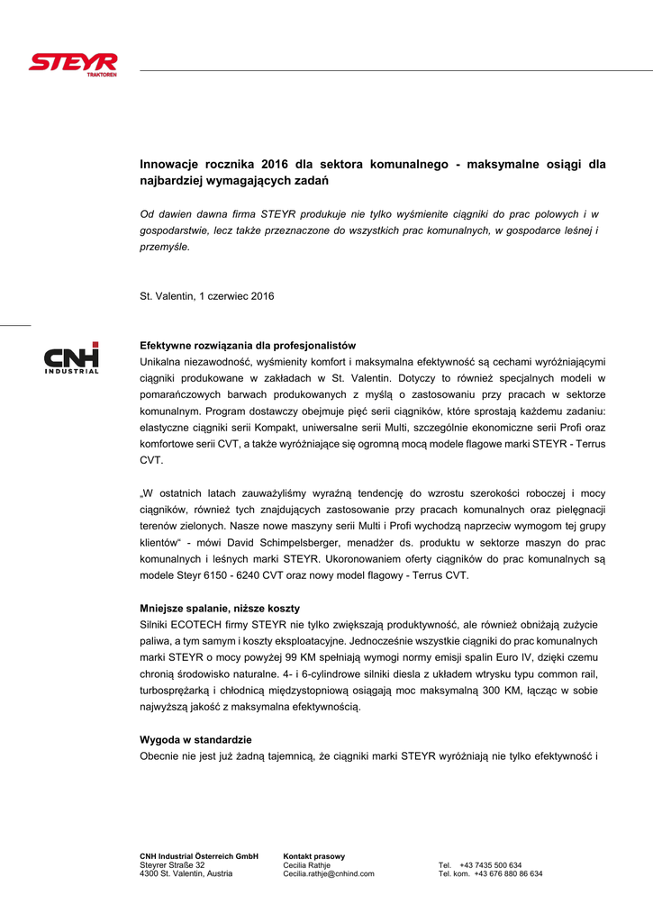 Innowacje rocznika 2016 dla sektora komunalnego - maksymalne osiągi dla najbardziej wymagających zadań Od dawien dawna firma STEYR produkuje nie tylko wyśmienite ciągniki do prac polowych i w gospodarstwie, lecz także przeznaczone do wszystkich prac komunalnych, w gospodarce leśnej i przemyśle. St. Valentin, 1 czerwiec 2016 Efektywne rozwiązania dla profesjonalistów Unikalna niezawodność, wyśmienity komfort i maksymalna efektywność są cechami wyróżniającymi ciągniki produkowane w zakładach w St. Valentin. Dotyczy to również specjalnych modeli w pomarańczowych barwach produkowanych z myślą o zastosowaniu przy pracach w sektorze komunalnym. Program dostawczy obejmuje pięć serii ciągników, które sprostają każdemu zadaniu: elastyczne ciągniki serii Kompakt, uniwersalne serii Multi, szczególnie ekonomiczne serii Profi oraz komfortowe serii CVT, a także wyróżniające się ogromną mocą modele flagowe marki STEYR - Terrus CVT. „W ostatnich latach zauważyliśmy wyraźną tendencję do wzrostu szerokości roboczej i mocy ciągników, również tych znajdujących zastosowanie przy pracach komunalnych oraz pielęgnacji terenów zielonych. Nasze nowe maszyny serii Multi i Profi wychodzą naprzeciw wymogom tej grupy klientów“ - mówi David Schimpelsberger, menadżer ds. produktu w sektorze maszyn do prac komunalnych i leśnych marki STEYR. Ukoronowaniem oferty ciągników do prac komunalnych są modele Steyr 6150 - 6240 CVT oraz nowy model flagowy - Terrus CVT. Mniejsze spalanie, niższe koszty Silniki ECOTECH firmy STEYR nie tylko zwiększają produktywność, ale również obniżają zużycie paliwa, a tym samym i koszty eksploatacyjne. Jednocześnie wszystkie ciągniki do prac komunalnych marki STEYR o mocy powyżej 99 KM spełniają wymogi normy emisji spalin Euro IV, dzięki czemu chronią środowisko naturalne. 4- i 6-cylindrowe silniki diesla z układem wtrysku typu common rail, turbosprężarką i chłodnicą międzystopniową osiągają moc maksymalną 300 KM, łącząc w sobie najwyższą jakość z maksymalna efektywnością. Wygoda w standardzie Obecnie nie jest już żadną tajemnicą, że ciągniki marki STEYR wyróżniają nie tylko efektywność i CNH Industrial Österreich GmbH Steyrer Straße 32 4300 St. Valentin, Austria Kontakt prasowy Cecilia Rathje [email protected] Tel. +43 7435 500 634 Tel. kom. +43 676 880 86 634 niezawodność, lecz równie wysoki poziom komfortu i prostoty obsługi. Wielofunkcyjne kabiny poszczególnych modeli zapewniają doskonałą widoczność we wszystkich kierunkach, ergonomiczne fotele i elementy sterowania, jak również nadzwyczaj solidną izolację akustyczną - zapewnia to operatorowi komfortową pracę przez długie godziny. Wszystkie modele ciągników marki STEYR dla sektora komunalnego posiadają uniwersalną dźwignię sterowania Multicontroller, która umożliwia perfekcyjne sterowanie każdego z nich. Umożliwia ona kierowcy łatwą i wygodną obsługę pojazdu i podłączonych do niego narzędzi. Prostota obsługi Multicontrollera zapewnia operatorom ciągników marki STEYR łatwy dostęp do poszczególnych funkcji ciągnika. Modele do prac leśnych są wyposażone fabrycznie w sprawdzone w praktyce elementy ochronne: 4-słupkową kabinę w serii Multi i 6-słupkową w serii Profi, a ponadto bezpieczną szybę tylną. Umożliwia to eliminację tradycyjnie stosowanej kratki ochronnej i zapewnia optymalny widok na tył maszyny. „Nasi inżynierowie przykładają dużą wagę do ogólnej koncepcji maszyny i już w fazie konstrukcyjnej uwzględniają wymogi klientów. Jako przykład może służyć nowy ciągnik Terrus CVT, w którym zoptymalizowano odległość pomiędzy osią przednią a przednim TUZ-em. Dzięki nowej konstrukcji osiągnęliśmy kompaktowe gabaryty i wyśmienity rozdział masy, co przekłada się na maksymalny komfort jazdy. Ponadto zmodyfikowana konstrukcja i specjalny kształt zbiornika paliwa pozwoliły uzyskać bardzo duży kąt skrętu kół." - podkreśla Schimpelsberger. Niezwykle uniwersalna rama Rama ciągników do prac komunalnych marki STEYR 2.0 pozwala na osiągnięcie nowego poziomu wydajności w tym sektorze. Nowy model przeznaczony do prac komunalnych, z EURO III System Adapter oparty jest na stabilnej, a tym samym jeszcze wydajniejszej konstrukcji. "EURO III" oznacza wielkość płyty konstrukcyjnej, "system" - różne warianty wyposażenia, takie jak trzy różne długości, zaś "adapter" - zintegrowany interfejs umożliwiający montaż narzędzi powszechnie stosowanych do prac komunalnych, optymalnie dostosowany do ciągnika. Modułowa seria maszyn do prac komunalnych marki STEYR posiada na wyposażeniu nie tylko zintegrowaną belkę holowniczą, lecz także na przykład zdejmowane nakładki zabezpieczające obrotowe złącza śrubowe do narzędzi. Cała rama do prac komunalnych bazuje na sztywnej konstrukcji łączonej śrubami bez stosowania sworzni, a dzięki trzem długościom: 210 mm (standardowo), 330 mm i 450 mm jest doskonale przystosowana do podłączenia wszystkich powszechnie stosowanych narzędzi. Nowa, wzmocniona wersja gwarantuje lepsze zabezpieczenie momentu skręcającego. Ponadto z nowej ramy do prac komunalnych można korzystać wymiennie z przednim układem zawieszenia; w tym celu dostępne jest specjalne ośrubowanie lub elementy mocujące. Rama do prac komunalnych firmy STEYR 2.0 jest fabrycznie przygotowana do montażu ładowacza czołowego i posiada także elektryczny przełącznik do pracy z ładowaczem. Optymalną wszechstronność ciągnika zapewnia wyposażenie obejmujące 4 lub 6 przyłączy, bezciśnieniowy obieg powrotny oraz seryjnie montowane 7-biegunowe gniazdo. Wyposażenie opcjonalne obejmuje przed WOM, przekładnia pośrednia oraz blokada osi przedniej. Oferta maszyn do pracy komunalnych marki Steyr w telegraficznym skrócie: 5 serii ciągników o mocy od 58 do 300 KM System selektywnej redukcji katalitycznej Hi-eSCR w modela