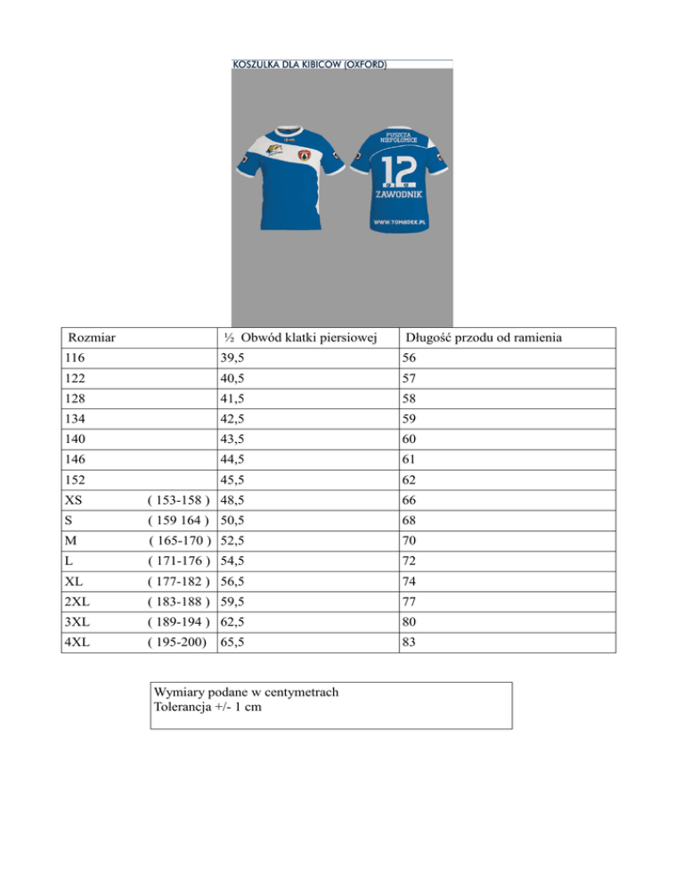 Rozmiar ½ Obwód klatki piersiowej Długość przodu od ramienia 116 39,5 56 122 40,5 57 128 41,5 58 134 42,5 59 140 43,5 60 146 44,5 61 152 45,5 62 XS ( 153-158 ) 48,5 66 S ( 159 164 ) 50,5 68 M ( 165-170 ) 52,5 70 L ( 171-176 ) 54,5 72 XL ( 177-182 ) 56,5 74 2XL ( 183-188 ) 59,5 77 3XL ( 189-194 ) 62,5 80 4XL ( 195-200) 83 65,5 Wymiary podane w centymetrach Tolerancja +/- 1 cm