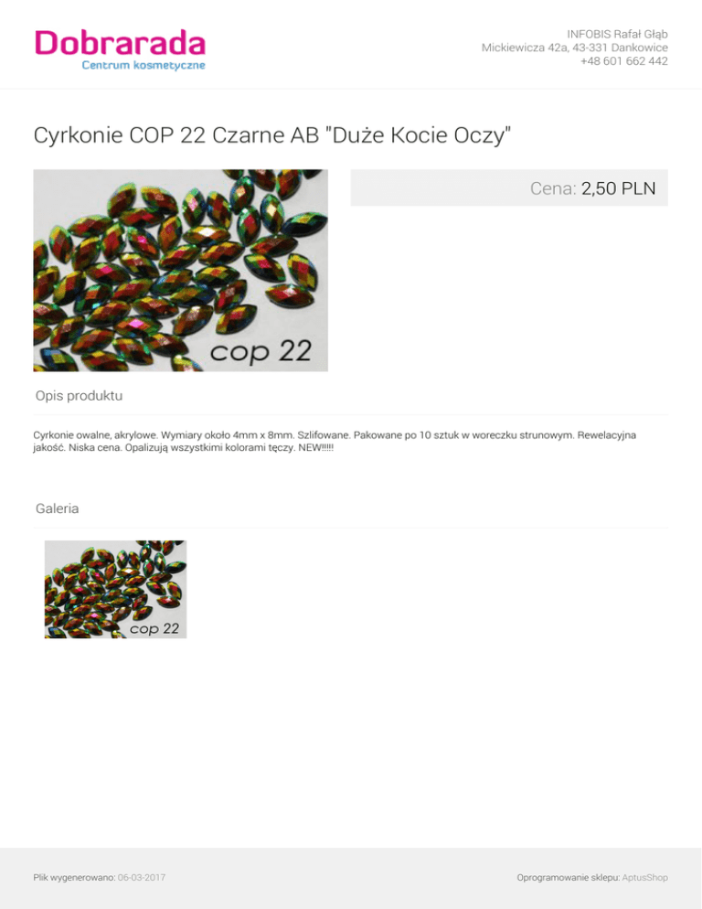INFOBIS Rafał Głąb Mickiewicza 42a, 43-331 Dankowice +48 601 662 442 Cyrkonie COP 22 Czarne AB "Duże Kocie Oczy" Cena: 2,50 PLN Opis produktu Cyrkonie owalne, akrylowe. Wymiary około 4mm x 8mm. Szlifowane. Pakowane po 10 sztuk w woreczku strunowym. Rewelacyjna jakość. Niska cena. Opalizują wszystkimi kolorami tęczy. NEW!!!!! Galeria Plik wygenerowano: 06-03-2017 Powered by TCPDF (www.tcpdf.org) Oprogramowanie sklepu: AptusShop