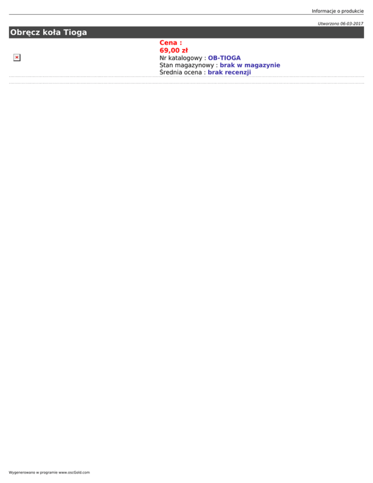 Informacje o produkcie Utworzono 06-03-2017 Obręcz koła Tioga Cena : 69,00 zł Nr katalogowy : OB-TIOGA Stan magazynowy : brak w magazynie Średnia ocena : brak recenzji Wygenerowano w programie www.oscGold.com