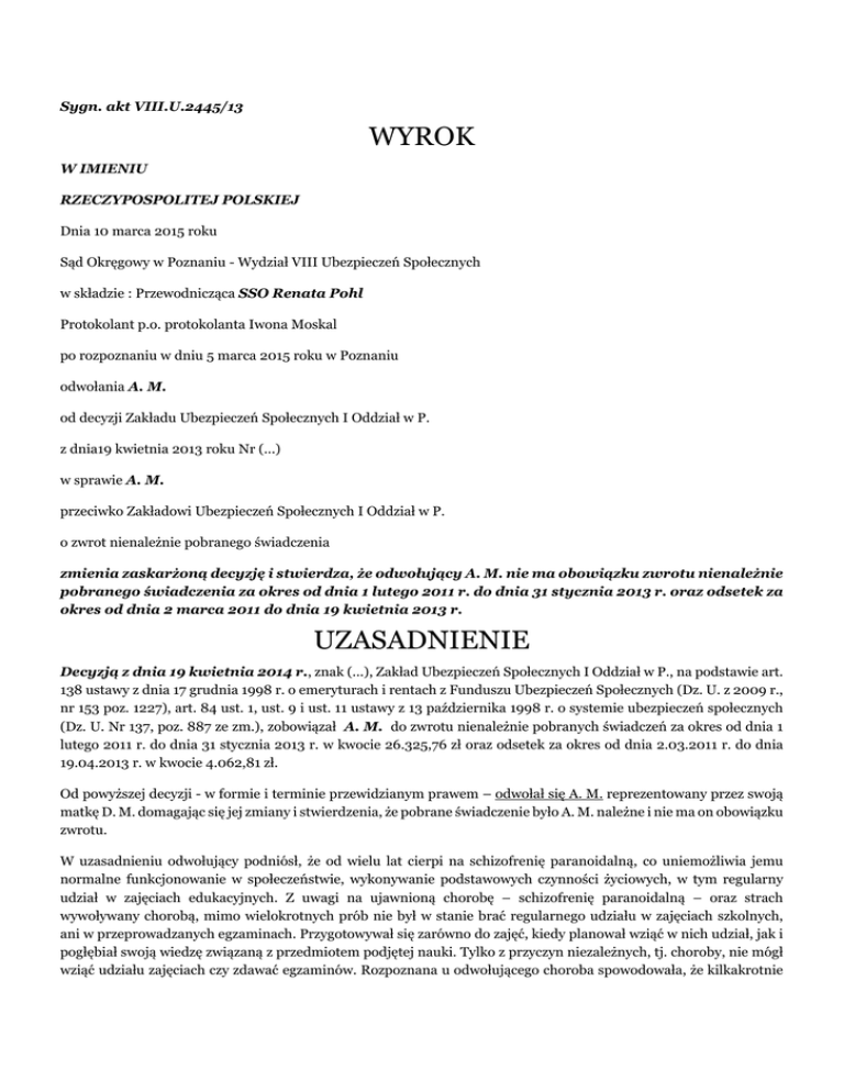 Sygn. akt VIII.U.2445/13 WYROK W IMIENIU RZECZYPOSPOLITEJ POLSKIEJ Dnia 10 marca 2015 roku Sąd Okręgowy w Poznaniu - Wydział VIII Ubezpieczeń Społecznych w składzie : Przewodnicząca SSO Renata Pohl Protokolant p.o. protokolanta Iwona Moskal po rozpoznaniu w dniu 5 marca 2015 roku w Poznaniu odwołania A. M. od decyzji Zakładu Ubezpieczeń Społecznych I Oddział w P. z dnia19 kwietnia 2013 roku Nr (...) w sprawie A. M. przeciwko Zakładowi Ubezpieczeń Społecznych I Oddział w P. o zwrot nienależnie pobranego świadczenia zmienia zaskarżoną decyzję i stwierdza, że odwołujący A. M. nie ma obowiązku zwrotu nienależnie pobranego świadczenia za okres od dnia 1 lutego 2011 r. do dnia 31 stycznia 2013 r. oraz odsetek za okres od dnia 2 marca 2011 do dnia 19 kwietnia 2013 r. UZASADNIENIE Decyzją z dnia 19 kwietnia 2014 r., znak (...), Zakład Ubezpieczeń Społecznych I Oddział w P., na podstawie art. 138 ustawy z dnia 17 grudnia 1998 r. o emeryturach i rentach z Funduszu Ubezpieczeń Społecznych (Dz. U. z 2009 r., nr 153 poz. 1227), art. 84 ust. 1, ust. 9 i ust. 11 ustawy z 13 października 1998 r. o systemie ubezpieczeń społecznych (Dz. U. Nr 137, poz. 887 ze zm.), zobowiązał A. M. do zwrotu nienależnie pobranych świadczeń za okres od dnia 1 lutego 2011 r. do dnia 31 stycznia 2013 r. w kwocie 26.325,76 zł oraz odsetek za okres od dnia 2.03.2011 r. do dnia 19.04.2013 r. w kwocie 4.062,81 zł. Od powyższej decyzji - w formie i terminie przewidzianym prawem – odwołał się A. M. reprezentowany przez swoją matkę D. M. domagając się jej zmiany i stwierdzenia, że pobrane świadczenie było A. M. należne i nie ma on obowiązku zwrotu. W uzasadnieniu odwołujący podniósł, że od wielu lat cierpi na schizofrenię paranoidalną, co uniemożliwia jemu normalne funkcjonowanie w społeczeństwie, wykonywanie podstawowych czynności życiowych, w tym regularny udział w zajęciach edukacyjnych. Z uwagi na ujawnioną chorobę – schizofrenię paranoidalną – oraz strach wywoływany chorobą, mimo wielokrotnych prób nie był w stanie brać regularnego udziału w zajęciach szkolnych, ani w przeprowadzanych egzaminach. Przygotowywał się zarówno do zajęć, kiedy planował wziąć w nich udział, jak i pogłębiał swoją wiedzę związaną z przedmiotem podjętej nauki. Tylko z przyczyn niezależnych, tj. choroby, nie mógł wziąć udziału zajęciach czy zdawać egzaminów. Rozpoznana u odwołującego choroba spowodowała, że kilkakrotnie był hospitalizowany w Wojewódzkim Szpitalu dla Nerwowo i Psychicznie Chorych (...) w G., co także uniemożliwiło udział w zajęciach szkolnych czy zdawanie egzaminów. Zakład Ubezpieczeń Społecznych I Oddział w P. w odpowiedzi na odwołanie wniósł o jego oddalenie, podtrzymując argumentację faktyczną i prawną przedstawioną w zaskarżonej decyzji. Organ wyjaśnił, że odwołujący miał przyznane prawo do renty od dnia 1 maja 2004 r. Na podstawie przedłożonego zaświadczenia Zaocznego Liceum Uzupełniającego (...) z którego wynika, że odwołujący w roku szkolnym 2010/2011 jest słuchaczem szkoły od dnia 2.02.2011 r., decyzją z dnia 2.03.2011 r. organ rentowy wznowił wypłatę renty rodzinnej od dnia 1.02.2011 r. na okres do dnia 31.01.2013 r. Następnie decyzją z dnia 7.01.2013 r. wstrzymano wypłatę renty rodzinnej od dnia 1.02.2013 r. W wyniku postępowania wyjaśniającego z (...) Sp. z o.o. w P. ustalono, że A. M. był słuchaczem szkoły w okresach: • 02.02.2011 r. do 31.08.2011 r. - skreślenie z listy słuchaczy, • 28.09.2011r. do 27.01.2012 r. - skreślony z listy słuchaczy, • 28.01.2012r. do 31.08.2012 r. - skreślenie z listy słuchaczy. Odwołujący nie uzyskał wymaganej przez szkołę 50% frekwencji, która na zajęciach wynosiła 0%. Odwołujący nie powiadomił organu rentowego o tych faktach, mimo pouczenia znajdującego się w decyzjach. Wobec powyższego Oddział ZUS decyzją z dnia 19 kwietnia 2013 r. ustalił, że za okres od dnia 1.02.2011 r. do dnia 31.01.2013 r. zostało wypłacone nienależne świadczenie, które winno zostać zwrócone. Sąd ustalił następujący stan faktyczny: A. M. urodził się w dniu (...) W związku ze zgonem w dniu 1 maja 2004 r. jego ojca W., w dniu 2 czerwca 2004 r. matka odwołującego D. M. złożyła wniosek o przyznanie prawa do renty rodzinnej na rzecz odwołującego. Do wniosku dołączyła zaświadczenie wystawione przez Gimnazjum nr 9 w P. potwierdzające, iż odwołujący jest uczniem tej szkoły. Decyzją z dnia 18 czerwca 2004 r. organ rentowy przyznał A. M. prawo do renty rodzinnej i to od dnia 1 maja 2004 r. tj. od dnia śmierci do końca sierpnia 2004 roku. Termin płatności ustalono na 20 dzień każdego miesiąca. Wysokość świadczenia ustalona została na kwotę 823,33 zł. Jako adresata decyzji wskazano matkę odwołującego D. M. (osobę upoważnioną – opiekuna odwołującego). Decyzja zawierała pouczenie o tym, że prawo do renty ustaje, gdy ustanie którykolwiek z warunków wymaganych do uzyskania prawa do świadczenia (pkt III), a nadto że osoba uprawniona do renty rodzinnej powinna powiadomić organ rentowy o okolicznościach powodujących zawieszenie prawa do renty, a mianowicie zaprzestaniu uczęszczania do szkoły przez osobę powyżej 16 lat, a jeżeli uczy się w szkole lub uczelni należy nadesłać zaświadczenie o kontynuowaniu nauki i dacie programowego jej ukończenia (pkt X 1.1). Jednocześnie wskazano, że osoba, która nienależnie pobrała świadczenia, jest zobowiązana do ich zwrotu – za nienależnie pobrane świadczenie uważa się m.in. świadczenia wypłacone mimo zaistnienia okoliczności powodujących ustanie lub zawieszenie do nich prawa (pkt IV. 1.). Dowód: bezsporne, wniosek o rentę rodzinną wraz z zaświadczeniem, decyzja ZUS z dnia 18 czerwca 2004 r. w aktach rentowych Po ukończeniu gimnazjum odwołujący kontynuował naukę w Zespole Szkół (...) w P. (w roku szkolnym 2004