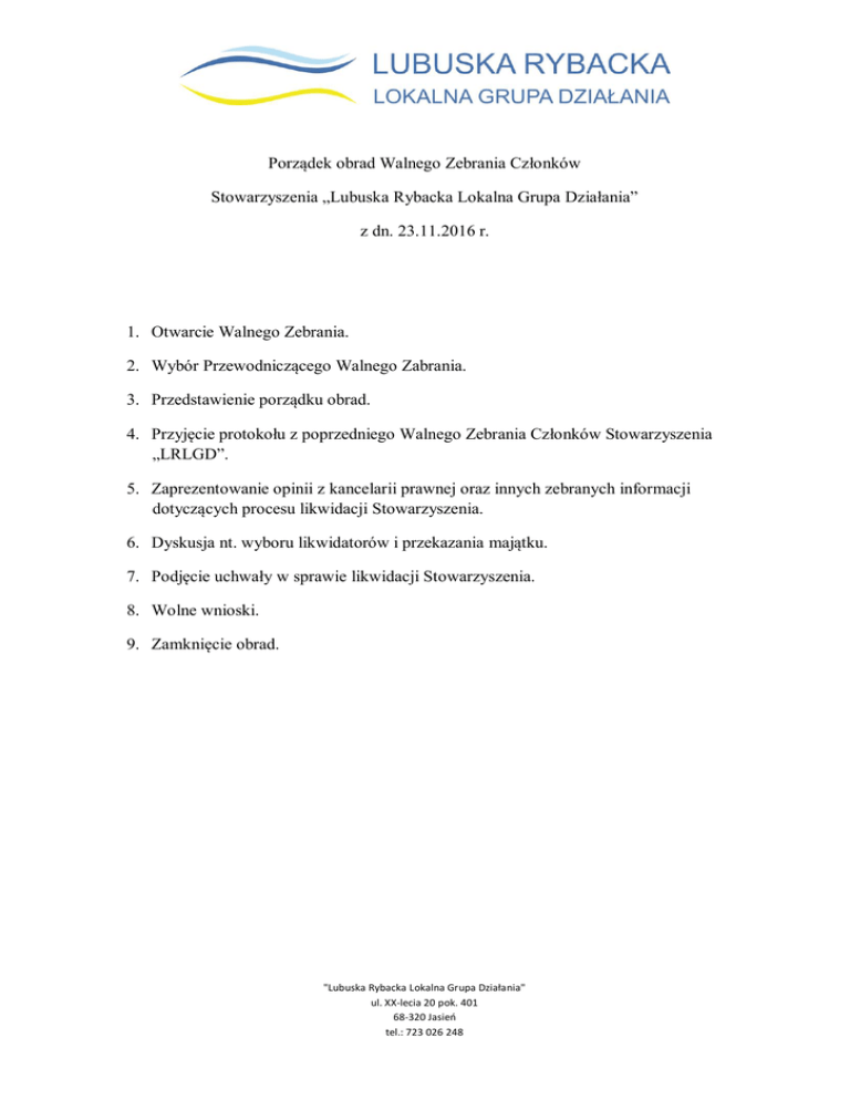 Porządek obrad Walnego Zebrania Członków Stowarzyszenia „Lubuska Rybacka Lokalna Grupa Działania” z dn. 23.11.2016 r. 1. Otwarcie Walnego Zebrania. 2. Wybór Przewodniczącego Walnego Zabrania. 3. Przedstawienie porządku obrad. 4. Przyjęcie protokołu z poprzedniego Walnego Zebrania Członków Stowarzyszenia „LRLGD”. 5. Zaprezentowanie opinii z kancelarii prawnej oraz innych zebranych informacji dotyczących procesu likwidacji Stowarzyszenia. 6. Dyskusja nt. wyboru likwidatorów i przekazania majątku. 7. Podjęcie uchwały w sprawie likwidacji Stowarzyszenia. 8. Wolne wnioski. 9. Zamknięcie obrad. "Lubuska Rybacka Lokalna Grupa Działania" ul. XX-lecia 20 pok. 401 68-320 Jasień tel.: 723 026 248