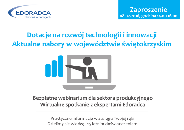 Zaproszenie 08.02.2016, godzina 14.00‐16.00 Dotacje na rozwój technologii i innowacji Aktualne nabory w województwie świętokrzyskim Bezpłatne webinarium dla sektora produkcyjnego Wirtualne spotkanie z ekspertami Edoradca Praktyczne informacje w zasięgu Twojej ręki Dzielimy się wiedzą i 15 letnim doświadczeniem Firma konsultingowa Edoradca ma przyjemność zaprosić Państwa na webinarium poświęcone aktualnym naborom w Województwie Świętokrzyskim – „Dotacje na rozwój technologii i innowacji”. Prowadzący Grzegorz Topór ‐ Manager ds. Kluczowych Klientów Jakub Głód ‐ Manager ds. Kluczowych Klientów Obecny kierunek rozwoju przedsiębiorstw opiera się na innowacyjności oraz wzmacnianiu współpracy firm z jednostkami naukowymi. Udział w webinarium wskaże jak pobudzić innowacyjność oraz właściwie przygotować się do aplikowania o środki na inwestycje i projekty badawczo rozwojowe. Data 08 luty 2016r Podczas spotkania online zostaną omówione w sposób przystępny i praktyczny założenia Programów Krajowych i Regionalnego Programu Operacyjnego dla Województwa Świętokrzyskiego wspierającego działalność badawczo‐rozwojową oraz ukierunkowanego na wspieranie działań inwestycyjnych w przedsiębiorstwach. Webinarium przeznaczone jest dla przedsiębiorców z sektora małych, średnich i dużych przedsiębiorstw produkcyjnych, właścicieli i kadry zarządzającej oraz osób odpowiedzialnych za inwestycje, innowacje i wdrożenia w Firmie. Godzina 14.00‐16.00 Rejestracja oraz dodatkowe informacje Dostępne na stronie www.edoradca.pl Kontakt Kamila Kwiatkowska tel. 883 100 042 [email protected] Omówione zostaną: Szczegółowe kwestie dotyczące RPO Świętokrzyskiego dla konkursów umożliwiających dofinansowanie projektów inwestycyjnych i B+R Kluczowe czynniki decydujące o przyznawaniu dotacji w ZAREJESTRUJ SIĘ JUŻ DZIŚ konkursach Praktyczne wskazówki, na co przedsiębiorcy powinni zwrócić szczególną uwagę podczas przygotowania aplikacji o dofinansowanie projektów Co zrobić, aby zwiększyć szansę na uzyskanie dotacji Uzupełnij formularz zgłoszeniowy i potwierdź udział w webinarium Więcej na temat naszej firmy znajdziesz na stronie: www.edoradca.pl