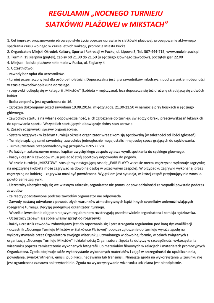 REGULAMIN „NOCNEGO TURNIEJU SIATKÓWKI PLAŻOWEJ w MIKSTACH” 1. Cel imprezy: propagowanie zdrowego stylu życia poprzez uprawianie siatkówki plażowej, propagowanie aktywnego spędzania czasu wolnego w czasie letnich wakacji, promocja Miasta Pucka. 2. Organizator: Miejski Ośrodek Kultury, Sportu i Rekreacji w Pucku, ul. Lipowa 3, Tel. 507-444-715, www.moksir.puck.pl 3. Termin: 19 sierpnia (piątek), zapisy od 21.30 do 21.50 (u sędziego głównego zawodów), początek gier 22.00 4. Miejsce: boiska plażowe koło molo w Pucku, ul. Żeglarzy 4 5. Uczestnictwo: - zawody bez opłat dla uczestników. - turniej przeznaczony jest dla osób pełnoletnich. Dopuszczalna jest gra zawodników młodszych, pod warunkiem obecności w czasie zawodów opiekuna dorosłego. - rozgrywki odbędą się w kategorii „Mikstów” (kobieta + mężczyzna), lecz dopuszcza się też drużynę składającą się z dwóch kobiet. - liczba zespołów jest ograniczona do 16. - zgłoszeń dokonujemy przed zawodami 19.08.2016r. między godz. 21.30-21.50 w namiocie przy boiskach u sędziego głównego. - zawodnicy startują na własną odpowiedzialność, a ich zgłoszenie do turnieju świadczy o braku przeciwwskazań lekarskich do uprawiania sportu. Wszystkich startujących obowiązuje dobry stan zdrowia. 6. Zasady rozgrywek i sprawy organizacyjne: - System rozgrywek w każdym turnieju określa organizator wraz z komisją sędziowską (w zależności od ilości zgłoszeń). - Turnieje sędziują sami zawodnicy, zawodnicy jednogłośnie mogą ustalić inną osobę spoza grających do sędziowania. - Turniej zostanie przeprowadzony wg przepisów PZPS i FIVB. - Po każdym zakończonym meczu kapitan zwycięskiego zespołu zgłasza wynik spotkania do sędziego głównego. - każdy uczestnik zawodów musi posiadać strój sportowy odpowiedni do pogody. - W czasie turnieju „MIKSTÓW” stosujemy następującą zasadę „FAIR PLAY”: w czasie meczu mężczyzna wykonuje zagrywkę na mężczyznę (kobieta może zagrywać na dowolną osobę w przeciwnym zespole). W przypadku zagrywki wykonanej przez mężczyznę na kobietę – zagrywka musi być powtórzona. Wyjątkiem jest sytuacja, w której zespół przyjmujący nie wnosi o powtórzenie zagrywki. - Uczestnicy ubezpieczają się we własnym zakresie, organizator nie ponosi odpowiedzialności za wypadki powstałe podczas zawodów. - za rzeczy pozostawione podczas zawodów organizator nie odpowiada. - Zawody zostaną odwołane z powodu złych warunków atmosferycznych bądź innych czynników uniemożliwiających rozegranie turnieju. Decyzję podejmuje organizator turnieju. - Wszelkie kwestie nie objęte niniejszym regulaminem rozstrzygają przedstawiciele organizatora i komisja sędziowska. - Uczestnicy zapewniają sobie własny sprzęt do rozgrzewki - każdy uczestnik zawodów zobowiązany jest do zapoznania się i przestrzegania regulaminu pod karą dyskwalifikacji - uczestnik „Nocnego Turnieju Mikstów w Siatkówce Plażowej” poprzez zgłoszenie do turnieju wyraża zgodę na wykorzystywanie przez Organizatora swojego wizerunku, utrwalonego w dowolnej formie, w celach związanych z organizacją „Nocnego Turnieju Mikstów” i działalnością Organizatora. Zgoda ta dotyczy w szczególności wykorzystania wizerunku poprzez zamieszczenie wykonanych fotografii lub materiałów filmowych w relacjach i materiałach promocyjnych Organizatora. Zgoda obejmuje także wykorzystanie wykonanych materiałów i zdjęć w szczególności do upublicznienia, powielania, zwielokrotnienia, emisji, publikacji, nadawania lub transmisji. Niniejsza zgoda na wykorzystanie wizerunku nie jest ograniczona czasowo ani terytorialnie. Zgoda na wykorzystywanie wizerunku udzielana jest nieodpłatnie.