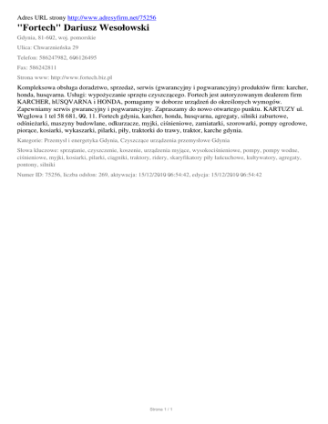 Adres URL strony http://www.adresyfirm.net/75256 "Fortech" Dariusz Wesołowski Gdynia, 81-602, woj. pomorskie Ulica: Chwarznieńska 29 Telefon: 586247982, 606126495 Fax: 586242811 Strona www: http://www.fortech.biz.pl Kompleksowa obsługa doradztwo, sprzedaż, serwis (gwarancyjny i pogwarancyjny) produktów firm: karcher, honda, husqvarna. Usługi: wypożyczanie sprzętu czyszczącego. Fortech jest autoryzowanym dealerem firm KARCHER, hUSQVARNA i HONDA, pomagamy w doborze urządzeń do określonych wymogów. Zapewniamy serwis gwarancyjny i pogwarancyjny. Zapraszamy do nowo otwartego punktu. KARTUZY ul. Węglowa 1 tel 58 681, 00, 11. Fortech gdynia, karcher, honda, husqvarna, agregaty, silniki zaburtowe, odśnieżarki, maszyny budowlane, odkurzacze, myjki, ciśnieniowe, zamiatarki, szorowarki, pompy ogrodowe, piorące, kosiarki, wykaszarki, pilarki, piły, traktorki do trawy, traktor, karche gdynia. Kategorie: Przemysł i energetyka Gdynia, Czyszczące urządzenia przemysłowe Gdynia Słowa kluczowe: sprzątanie, czyszczenie, koszenie, urządzenia myjące, wysokociśnieniowe, pompy, pompy wodne, ciśnieniowe, myjki, kosiarki, pilarki, ciągniki, traktory, ridery, skaryfikatory piły łańcuchowe, kultywatory, agregaty, pontony, silniki Numer ID: 75256, liczba odsłon: 269, aktywacja: 15/12/2010 06:54:42, edycja: 15/12/2010 06:54:42 Strona 1 / 1