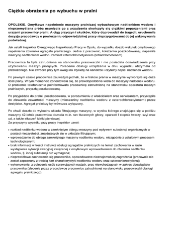 Ciężkie obrażenia po wybuchu w pralni OPOLSKIE. Omyłkowe napełnienie maszyny pralniczej wybuchowym nadtlenkiem wodoru i nieprzemyślana próba usunięcia go z urządzenia skończyły się ciężkimi poparzeniami oraz urazami pracownicy pralni. A ciąg przyczyn i skutków, który doprowadził do tragedii, uruchomiła decyzja pracodawcy o powierzeniu odpowiedzialnej pracy nieprzygotowanej do jej wykonywania podwładnej. Jak ustalił inspektor Okręgowego Inspektoratu Pracy w Opolu, do wypadku doszło wskutek omyłkowego napełnienia zbiornika agregatu pralniczego. Jedna z pracownic, koleżanka poszkodowanej, napełniła maszynę nadtlenkiem wodoru zamiast czterochloroetylenem (tetrachloroetenem). Pracownica ta była zatrudniona na stanowisku prasowaczki i nie posiadała doświadczenia przy użytkowaniu maszyn piorących. Polecenie obsługi urządzenia w dniu wypadku otrzymała od przełożonego. Nie zwróciła przy tym uwagi na etykietę na kanistrze i czytelny napis: nadtlenek wodoru. Po pewnym czasie pracownica zauważyła jednak, że w trakcie prania w maszynie wytworzyła się duża ilość piany. W tym momencie zorientowała się, że prawdopodobnie wlała do maszyny nadtlenek wodoru. O problemie telefonicznie poinformowała pracownicę zatrudnioną na stanowisku operatora maszyn pralniczych, przyszłą poszkodowaną. Po przyjeździe do pralni, poszkodowana, w porozumieniu z właścicielem oraz serwisantem, przystąpiła do zlewania zawartości maszyny (mieszaniny nadtlenku wodoru z czterochloroetylenem) przez destylator. Agregat pralniczy był wówczas wyłączony. Po chwili doszło do wybuchu układu filtrującego maszyny, w wyniku którego znajdująca się w pobliżu maszyny 42-letnia pracownica doznała m.in. ran tłuczonych głowy, oparzeń I stopnia twarzy, szyi oraz ud, a także stłuczeń klatki piersiowej. Za przyczyny wypadku przy pracy inspektor uznał: ● ● ● ● ● rozkład nadtlenku wodoru w zamkniętym obiegu maszyny pod wpływem substancji organicznych w postaci nieczystości, znajdujących się w układzie filtrującym; wprowadzenie do obiegu zamkniętego maszyny nadtlenku wodoru, niezgodnie z ustalonym procesem technologicznym; brak informacji w treści instrukcji obsługi agregatów pralniczych na temat zachowania w razie wystąpienia sytuacji awaryjnej związanej z omyłkowym wprowadzeniem do zbiornika nadtlenku wodoru, tj. innej substancji niż wymagana; nieprawidłowe zachowanie się pracownika, spowodowane nieznajomością zagrożenia (pracownik nie został zapoznany z treścią kart charakterystyki nadtlenku wodoru oraz czterochloroetylenu); wykonywanie, z polecenia osób sprawujących nadzór, prac niewchodzących w zakres obowiązków pracownika (zlecenie przez pracodawcę pracownicy zatrudnionej na stanowisku prasowaczki obsługi agregatu pralniczego). Inspektor pracy wystosował do pracodawcy decyzję nakazową oraz wystąpienie z 13 wnioskami pokontrolnymi, m.in. odnośnie niedopuszczania pracowników do pracy, do której wykonywania nie posiadają wymaganych kwalifikacji lub potrzebnych umiejętności, dostatecznej znajomości przez pracowników przepisów oraz zasad bezpieczeństwa i higieny pracy, a także ponownego przeprowadzenia oceny ryzyka zawodowego z uwzględnieniem zagrożeń wynikających z używanych niebezpiecznych preparatów chemicznych. Z uwagi na skalę nieprawidłowości, inspektor ukarał pracodawcę mandatem.