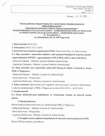 Załącznik nr 9 do Procedury PSZ-09 Data wydania 11.a4.2012 r Poznań, ... 0..1...0.4.. .2.0.1.4.... WYSTĄPIENIE POKONTROLNE Z KONTROLI PROBLEMO\ryEJ/ sł+utwDzłJĄ€F,,J* PRZEPROWADZONEJ PRZEZ Oddział Epidemiologii* * WOJEWÓDZKIEJ STACJI SANITARNO - EPIDEMIOLOGICZNEJ W POZNANIU W POWIATOWEJ STACJI SANITARNO - EPIDEMIOLOGICZNEJ W WĄGROWCU ul. Gnieźnieńska 49, 62-100 Wągrowiec 1. Data kontroli: 06.B.zaru 2. Znak pisma: DN-E. I6t 1,2.201 4 3. Kontrolowana konrórka organizacyjna PSSE: Stanowisko Pracy ds. Epidenriologii" i stanowisko służboweosób przeprowadzających kontrolę 3.1. Imię, nazwisko z upowaŻnieniem WPWIS - upoważnienie nr zgodnie DN-E.9012.1.2014 z dnia 12.02.2014r. - Kńarzyna Jekiełek - Młodszy Asystent Oddziału Epidemiologii; - Agnieszka Chojnacka - Młodszy Asystent Oddziału Epidemiologii. 3.2. Imię, nazwisko oraz stanowisko osoby/osób biorących udział w kontroli ze strony PSSE w Wągrowcu : - Małgorzata B ędnarz - Mło dszy Asystent ds. Epidemiolo gii ; - Beata Kłosowska - Pielęgniarka; - Agnieszka Borkowska - Młodszy Asystent ds. Epidemiologii. 4. Zakres kontroli: Sprawdzenie pod względem merltorycznym i prawnym dokumentacji w zakresie epidemiologii w PSSE w S/ągrowcu za okfes 02.0I.2013r. - 06.03.2014r, 5. Wyniki kontroli 5.1. Ocena skontrolowanej działalności,ze wskazaniem ustaleń, na których została oparta: 1. Obsada kadrowa: Obsada kadrowa Stanowiska Pracy ds. Epidemiologii PSSE w Wągrowcu: -MałgoruataBędnaru - Młodszy Asystent ds, Epidemiologii; - Beata Kłosowska - Pielęgniarka; - Agnieszka Borkowska - Młodszy Asystent ds. Epidemiologii. 2. P rzeg|ąd, wykazu zgloszeń niepożądanych odczynów poszczepiennych Wykaz NOP prowadzony prawidłowo, NOr'). Załącznlk nr 9 do Procedury PSZ-09 Data wydania 11.04.2012 r Wydanie 2 W 20I3r. niepożądany odczyn poszczepienny - łagodny zgłoszono u Strona ..... z .. 1 osoby po . . szczepioŃach: DTP, Polio Imovax i Act-Hib. W roku 2014 do dnia kontroli tj. 06,03.2014r. nie zarejestrowano niepożądanęgo odczynu. Dokunrentacja jest kompletna i prowadzona prawidłowo na aktualnych formularzach. Rejestr niepożądanych odczynów poszczepiennych znak: ON.E-4021, opatrzonyjest nazwą ,,Powiatowy rejestr zgłoszeń niepozqdanych odczynów poszczepiennych" zgodnie § 8 ust, 1 rozporządzenia Ministra Zdrowia poszczepiennych w z zapisem sprawie niepożądanych odczynów oTM kryteriów ich rozpoznawania z dnta 2I grudnia 20I0r, (Dz.U. Nr 254, poz.1711). 3. Dystrybucj a szczepionek, zamówienia na szczepionki, sprawozdawczość ze szczepień, procedury dot. magazynowania szczepionek. Dystrybucja szczepionek z PSSE w Wągrowcu do 15 placówek (13 przychodni, Zespoł Opieki Zdrowotnej w Wągrowcu i Stacja Dialtz w Wągrowcu) odbywa się po telefonicznym uzgodnienia terminu przyjścia placówki wg indywidualnyclr potrzeb ośrodkazdrowia z zachowaniem łańcucha chłodniczego (termo-torby, wkłady chłodnicze, termometr, rejestr 'temperatury). W PSSE w Wągrowcu prowadzony jest od 01 .2009r, całodobowy monitoring temperatury w lodówkach z powiadamianiem na telefon komórkowy. Istnieje również możliwośćodczytu temperatury za pomocą funkcji SMS. Telefony komórkowe podłączone do systemu posiada Państwowy Powiatowy Inspektor Sanitarny w Wągrowcu otaz Pani Małgotzata Bednarz, która jest zobowiązana do stałego monitorow ania przez telefon temperatury. Dodatkowo raz dziennie jest odczytywana temperatura i zapisywana w rejestrze temperatur. Pomieszczenie, w którym znajdują się szafy chłodnicze zamykanejest na klucz. W przypadku awarii utządzeń chłodniczych lub przerw w dostawie prądu, pSSE w Wągrowcu postępuje zgodnie z .,Instrukcją postępowania w przypadku awarii urządzeń chłodrriczych służącychdo przechowywania szczepionek"(AK-DN-E-1), szczepionki są wtedy transportowane do Zespołu Opieki Zdrowotnej w Wągrowcu, z któtym PSSE w Wągrow cu zawarła umowę (AK-DN-E-Z). Ponadto w wyniku dokonanej analizy stwierdzono, ze w 20I3r. PSSE w Wągrowcu nadebrała duze ilościszczepionek w ramach 20I4r, Zwłaszcza dotyczy to szczepionek przeciwko: błonicy, tęzcowi, krztuścowi(DTaP, DTP, Tetana); WZW typu B dla dzieci; odtze, śwince, różyczce; Haemophilus influenzae typu b. Zńączniknr 9 do Procedury PSZ-09 Data wydania l1.04.2a12 r / Wydanie 2 Strona..... z.... W związku z poryższym podczas sporządzania zamowienia na szczepionki na rok 2015, należy dokonać dokładnej analizy faktycznych potrzeb powiatu w zaklesie wykorzystania preparatów szczepionkowych przeciwko ww. chorobom w ramach Programu Szczepień Ochronnych, Stan magazynowy szczepionek ptzekazywany w obowiązuj ącym terminie. Sprawozdaw czo śó ze szczepleń kompietna, prowadzona prawidłowo. 4. Postępowanie z osobami uchylającymi się od obowiązku wykonania szczepień ochronnych. Liczba prowadzonych spraw w związku z osobami uchylającymi się od wykonania szczepień ochronnych będących w toku wynosi 5 w tym: - 1 sprawa - 1 jest rozpatrywana przez Sąd Rodzinny, sprawa została skierowana w celu wszczęcia postępowania egzekucyjnego przęz Woj ewodę Wielkopolskiego, - w 3 sprawach prowadzona jest korespondencja informacyjno-edukacyjna. Dokumentacj a prowadzona jest prawidłowo. 5. Przegląd dokumentacji epidemiologicznej w zakresie narażenia i styczności ze wścieklżną. Poddano kontroli dokumentację epidemiologiczną w zakresie nadzoru nad narazeniem i stycznością ze wścieklizną: - ,,Rejestry, wyniki, protokoĘ - Rejestr zgłoszonych pogryzień przez zwierzęta podejrzane o - wściekliznę"ON-E- 466-1 -16, ,,Rejestry, wyniki, protokoły Rejestr osób szczepionych przeciwko wściekliźnie" oN_E-466. - ,,Choroby odzwierzęce -* pogryzienia przez zwrcrzęta podejrzane o zŃazenie wścieklizną" ON-E-4003-1: - wywiad epidemiolo giczny w przypadku podejrzenia o zakażęnie wścieklizną, - formularz dla rejestracji osób szczepionych przeciwko - formularz wściekliźnie, ZKL-I Zgłoszenie p