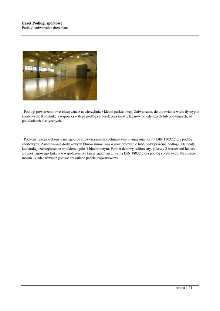Erzet Podłogi sportowe Podłogi uniwersalne drewniane Podłogi powierzchniowo-elastyczne z nawierzchnią z klepki parkietowej. Uniwersalne, do uprawiania wielu dyscyplin sportowych. Konstrukcja wsporcza – ślepa podłoga z desek oraz ruszt z legarów pojedynczych lub podwójnych, na podkładkach elastycznych. Podkonstrukcja wykonywana zgodnie z rozwiązaniami spełniającymi wymagania normy DIN 18032:2 dla podłóg sportowych. Zastosowanie dodatkowych klinów umożliwia wypoziomowanie lub/i podwyższenie podłogi. Elementy konstrukcji zabezpieczone środkiem ognio- i biochronnym. Parkiet dębowy szlifowany, pokryty 3 warstwami lakieru antypoślizgowego Eukula o współczynniku tarcia zgodnym z normą DIN 18032:2 dla podłóg sportowych. Na ruszcie można układać również gotowe drewniane panele trójwarstwowe. strona 1 / 1