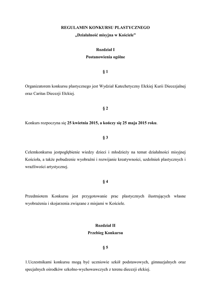 REGULAMIN KONKURSU PLASTYCZNEGO „Działalność misyjna w Kościele” Rozdział I Postanowienia ogólne §1 Organizatorem konkursu plastycznego jest Wydział Katechetyczny Ełckiej Kurii Diecezjalnej oraz Caritas Diecezji Ełckiej. §2 Konkurs rozpoczyna się 25 kwietnia 2015, a kończy się 25 maja 2015 roku. §3 Celemkonkursu jestpogłębienie wiedzy dzieci i młodzieży na temat działalności misyjnej Kościoła, a także pobudzenie wyobraźni i rozwijanie kreatywności, uzdolnień plastycznych i wrażliwości artystycznej. §4 Przedmiotem Konkursu jest przygotowanie prac plastycznych ilustrujących własne wyobrażenia i skojarzenia związane z misjami w Kościele. Rozdział II Przebieg Konkursu §5 1.Uczestnikami konkursu mogą być uczniowie szkół podstawowych, gimnazjalnych oraz specjalnych ośrodków szkolno-wychowawczych z terenu diecezji ełckiej. 2. Uczestnicy przygotowują prace plastyczne przy wykorzystaniu dowolnych technik w formacie A4 lub w formacie A3. Prace mogą być wykonane na różnym podłożu (np. szkło czy płótno). Dopuszczalne są prace przestrzenne. 3. Prace przekazane na konkurs muszą być pracami własnymi, wcześniej nieopublikowanymi. 4. Każdy z uczniów może przekazać tylko jedną pracę. 5. Na Konkurs nie można przesyłać prac zbiorowych. §6 1. Zgłoszenie pracy do konkursu jest równoznaczne z przekazaniem praw autorskich do nich na rzecz Organizatora, o których mowa w art. 50 ustawy z dnia 4 lutego 1994 roku o prawach autorskich i prawach pokrewnych (Dz. U. z 1994 r., Nr 24, poz. 83) oraz do publikacji w wydawnictwach wszelkiego typu, wydawanych przez Organizatora oraz w Internecie. 2. Biorąc udział w konkursie uczestnik wyraża zgodę na zastosowanie się do niniejszego regulaminu. §7 1.Prace należy przesłać pocztą lub dostarczyć osobiście do Organizatora konkursu, na adres: Caritas Diecezji Ełckiej ul. ks. prał. Mariana Szczęsnego 1 19-300 Ełk Z dopiskiem na kopercie: Konkurs plastyczny MISJE 2015” 2 Termin nadsyłania prac:do 25 maja 2015 – liczy się data wpływu do sekretariatu Caritas Diecezji Ełckiej. 3. Na odwrocie każdej pracy należy załączyć metryczkę, która znajduje się w załączniku 1. 4. Prace, które nie będą podpisane oraz prace anonimowe nie zostaną zakwalifikowane do konkursu. 5. Prace nadesłane po terminie nie będą oceniane. Termin 25 maja 2015 jest terminem ostatecznym. Rozdział III Postanowienia końcowe §8 1.Komisja powołana przez Organizatora konkursu, wyłoni zwycięskie prace (I, II oraz III miejsce) w czterech przedziałach: -szkoła podstawowa klasy I – III - szkoła podstawowa klasy IV - VI - szkoła gimnazjalna - specjalne ośrodki szkolno – wychowawcze (do 18 r. ż.) W każdym przedziale, 1 szkoła może zgłosić maksymalnie po 5 prac. 2. Prace, które nie będą spełniały warunków regulaminowych nie zostaną ocenione przez komisję. 3. Kryteria oceny prac:zgodność z tematyką, estetyka pracy, oryginalność, pomysłowość, kreatywność. 4. Decyzja Komisji jest ostateczna i nieodwołalna. 5. Wyniki Konkursu ogłoszone zostaną na stronie internetowej Organizatorów konkursu. Placówki, z których pochodzić będą prace nagrodzonych zostaną poinformowane o wynikach Konkursu telefonicznie. 6. Uroczyste wręczenia nagród nastąpi podczas Ogólnopolskiego Festynu Rodzinnego z Okazji Dnia Dziecka 30 maja 2015roku. §9 Niniejszy regulamin jest dostępny w siedzibie Organizatorów: Wydział Katechetyczny Ełckiej Kurii Diecezjalnej (Plac Katedralny 1, 19 – 300 Ełk) oraz na stronie www.wk.diecezja.elk.pl a także w siedzibie Caritas Diecezji Ełckiej (ul. ks. prałata Mariana Szczęsnego 1, 19-300 Ełk), i na stronie internetowej www.elk.caritas.pl oraz na facebook’u. § 10 Organizator zastrzega sobie możliwość zmiany niniejszego regulaminu. W przypadku jakichkolwiek wątpliwości prosimy o kontakt z panią Joanną Dziatkowiakpod nr telefonu 087 4417017 kom. 506-807-886 lub za pośrednictwem poczty elektronicznej: [email protected]. Załącznik 1 Indywidualna Metryczka Autora Pracy Plastycznej Imię i nazwisko autora pracy Klasa Tytuł pracy Telefon (Uczestnika lub opiekuna) Adres e-mail (Uczestnika lub opiekuna) Placówka do której uczęszcza Uczestnik konkursu (dokładne dane kontaktowe)